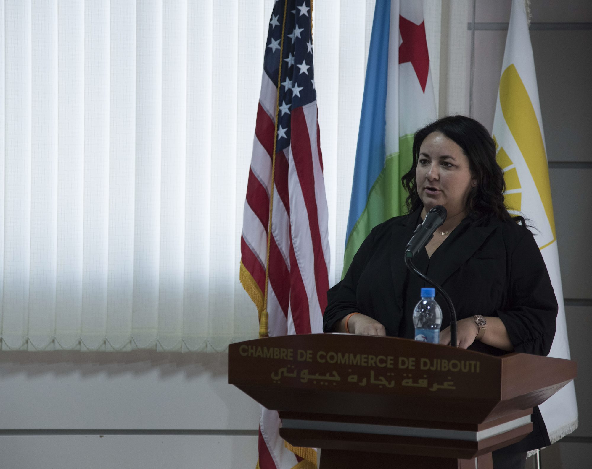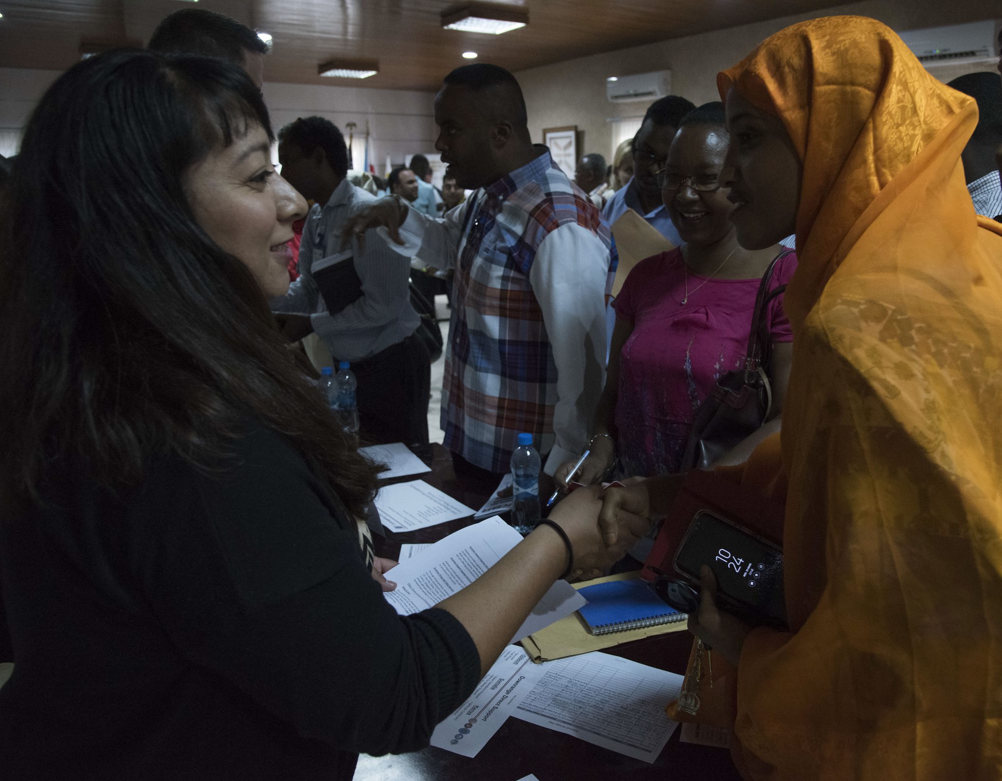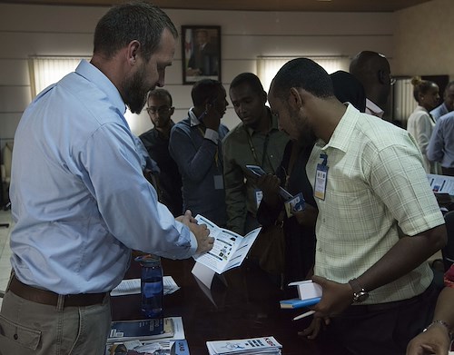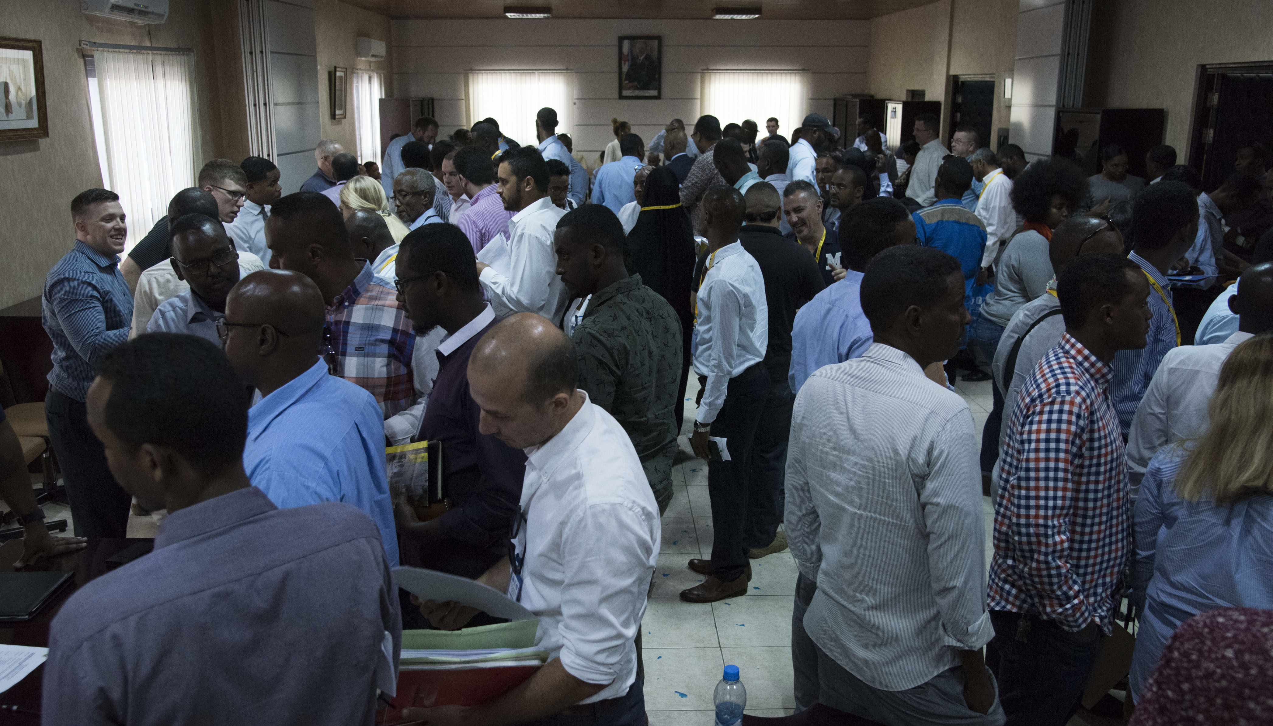 Djiboutian business owners speak with members of Combined Joint Task Force – Horn of Africa, Camp Lemonnier and U.S. Africa Command at an Information Day event for the Djiboutian business community in collaboration with the Djibouti Chamber of Commerce, and the United States Embassy of Djibouti, Mar. 28, 2018. The event provided an opportunity for participants to have open discussions on topics covering the opportunities ahead for Djiboutian firms under the Africa First initiative. Guest speakers included the U.S. Ambassador to Djibouti, Larry Andre; Camp Lemonnier Commanding Officer, Capt. Nancy S. Lacore; and Djibouti Chamber of Commerce President, Youssouf Moussa Dawaleh. (Air National Guard photos by Staff Sgt. Allyson L. Manners)