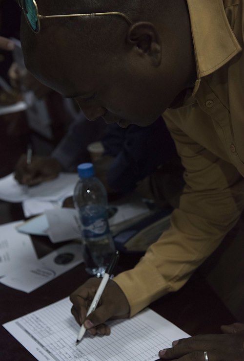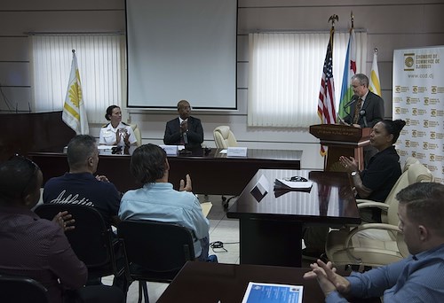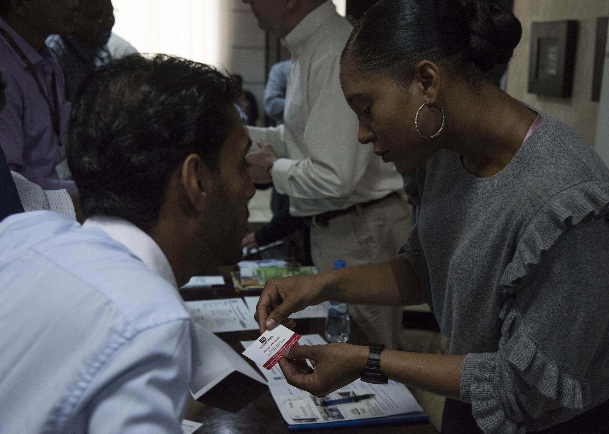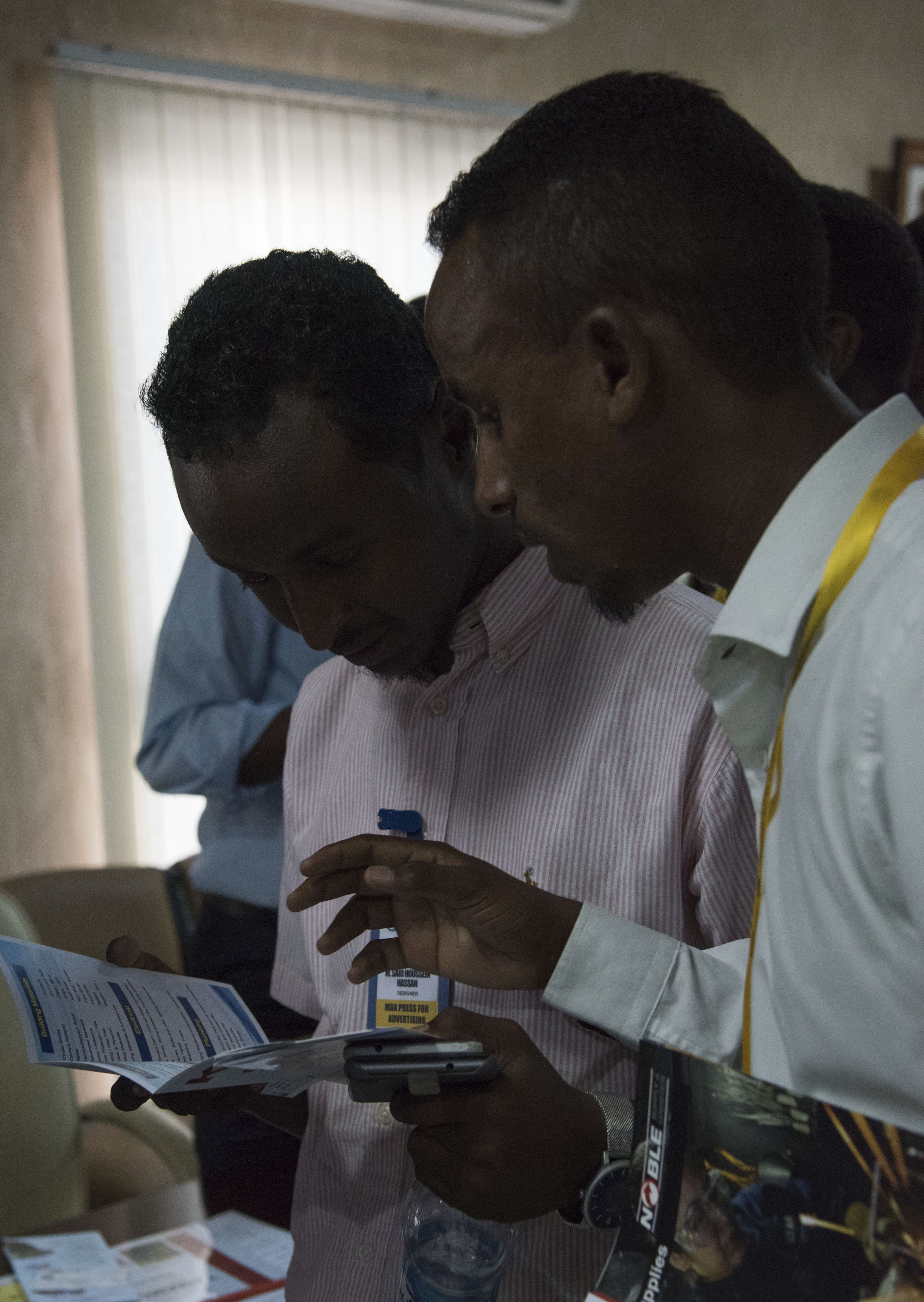 Djiboutian business owners speak with members of Combined Joint Task Force – Horn of Africa, Camp Lemonnier and U.S. Africa Command at an Information Day event for the Djiboutian business community in collaboration with the Djibouti Chamber of Commerce, and the United States Embassy of Djibouti, Mar. 28, 2018. The event provided an opportunity for participants to have open discussions on topics covering the opportunities ahead for Djiboutian firms under the Africa First initiative. Guest speakers included the U.S. Ambassador to Djibouti, Larry Andre; Camp Lemonnier Commanding Officer, Capt. Nancy S. Lacore; and Djibouti Chamber of Commerce President, Youssouf Moussa Dawaleh. (Air National Guard photos by Staff Sgt. Allyson L. Manners)