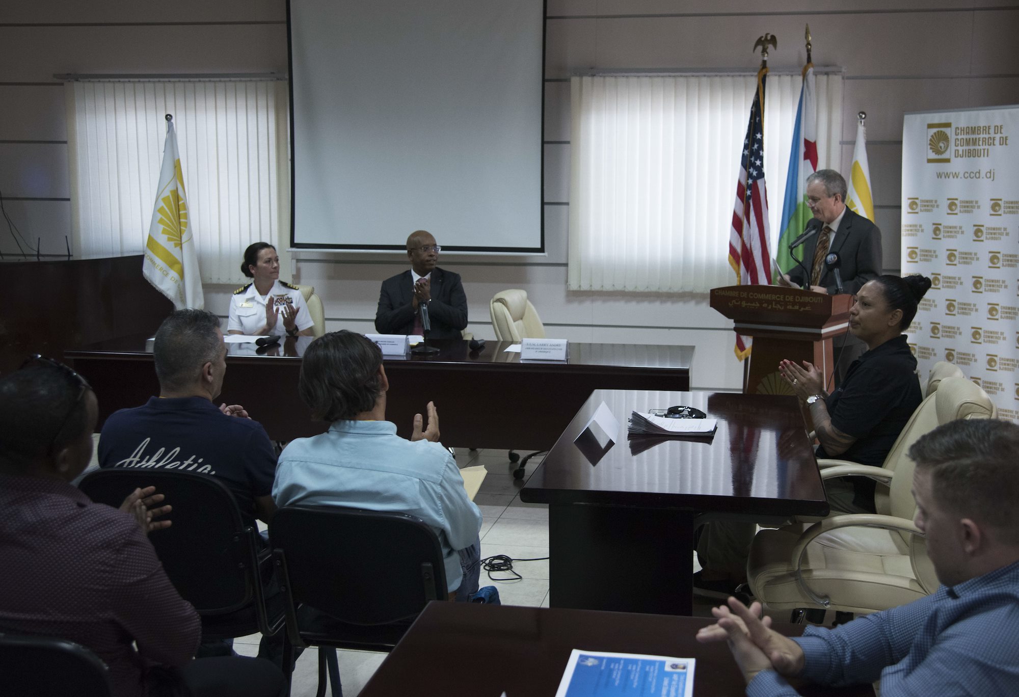 Djiboutian business owners speak with members of Combined Joint Task Force – Horn of Africa, Camp Lemonnier and U.S. Africa Command at an Information Day event for the Djiboutian business community in collaboration with the Djibouti Chamber of Commerce, and the United States Embassy of Djibouti, Mar. 28, 2018. The event provided an opportunity for participants to have discussions on topics covering the opportunities ahead for Djiboutian firms under the Africa First initiative. Guest speakers included the U.S. Ambassador to Djibouti, Larry Andre; Camp Lemonnier Commanding Officer, Capt. Nancy S. Lacore; and Djibouti Chamber of Commerce President, Youssouf Moussa Dawaleh.