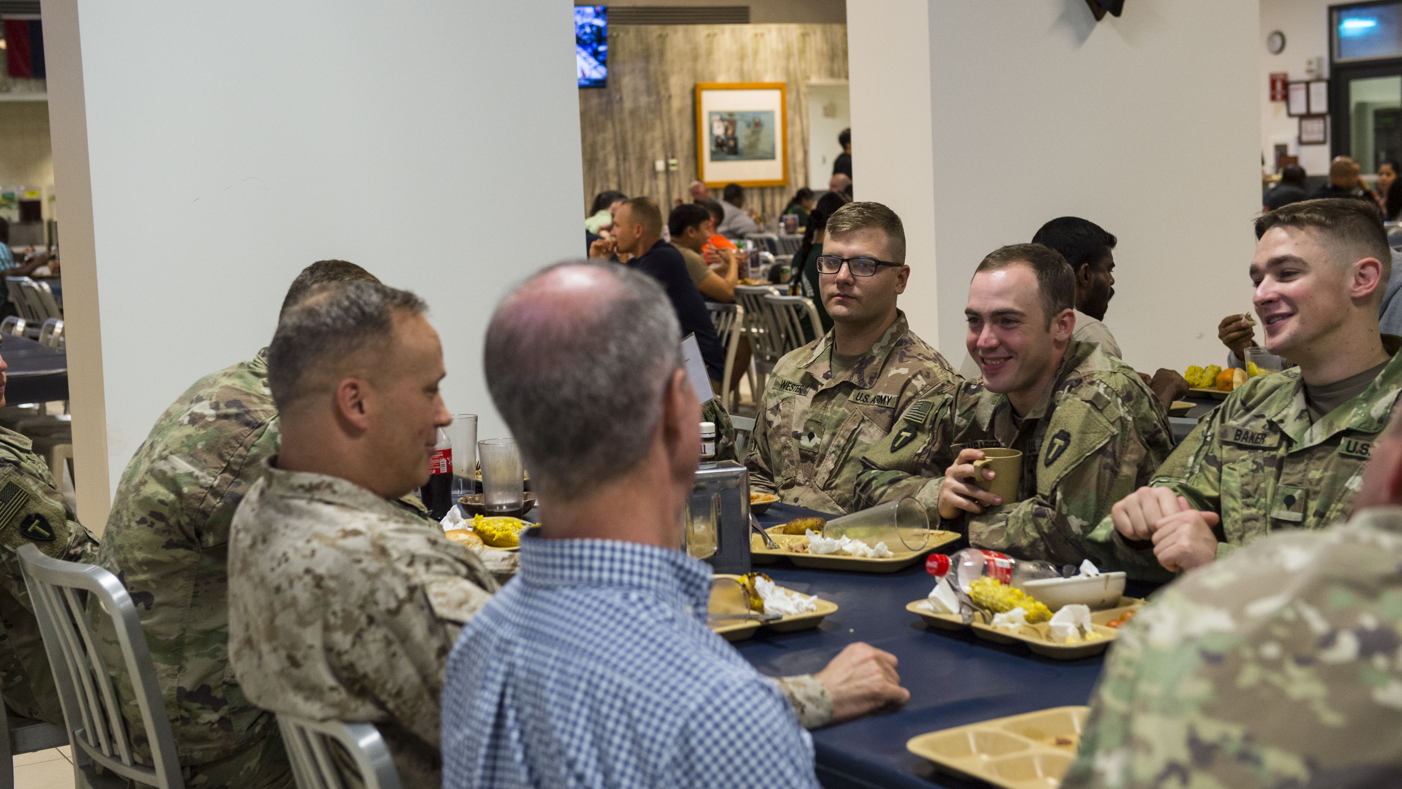 U.S. Rep. Mac Thornberry, 13th District of Texas, has dinner with U.S. Marine Corps Maj. Gen. David Furness, Commanding General of the Combined Joint Task Force - Horn of Africa (CJTF-HOA), and other service members deployed to Camp Lemonnier, Djibouti, during a visit to the CJTF-HOA March 24, 2018. Thornberry, who is the U.S. House of Representatives Armed Services Committee Chairman, stopped by Camp Lemonnier before visiting other locations within the CJTF-HOA area of responsibility. The Armed Services Committee has the responsibility to oversee the Pentagon, all military services, and all Department of Defense agencies, including their budgets and policies. (U.S. Air Force photo by Staff Sgt. Timothy Moore)
