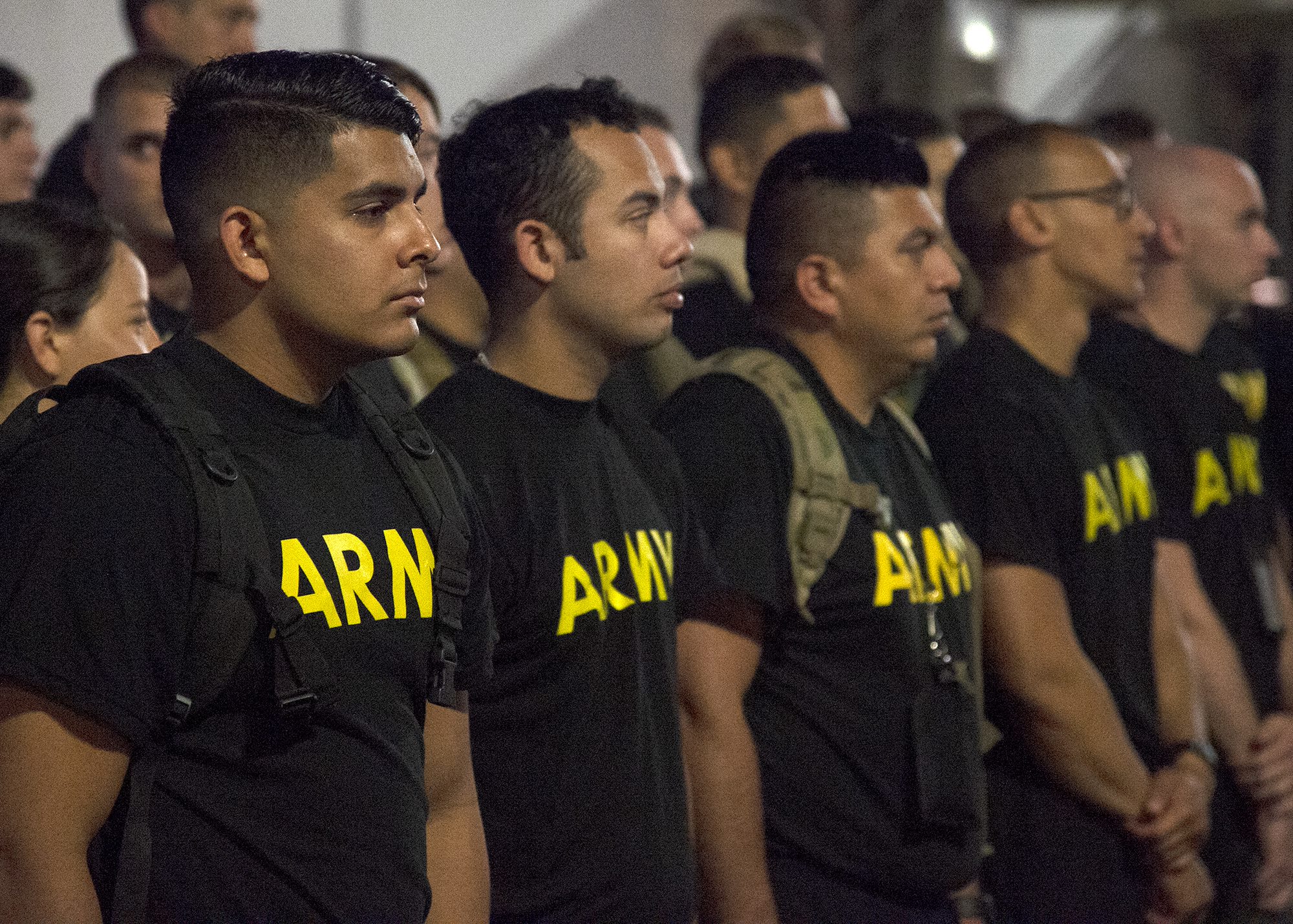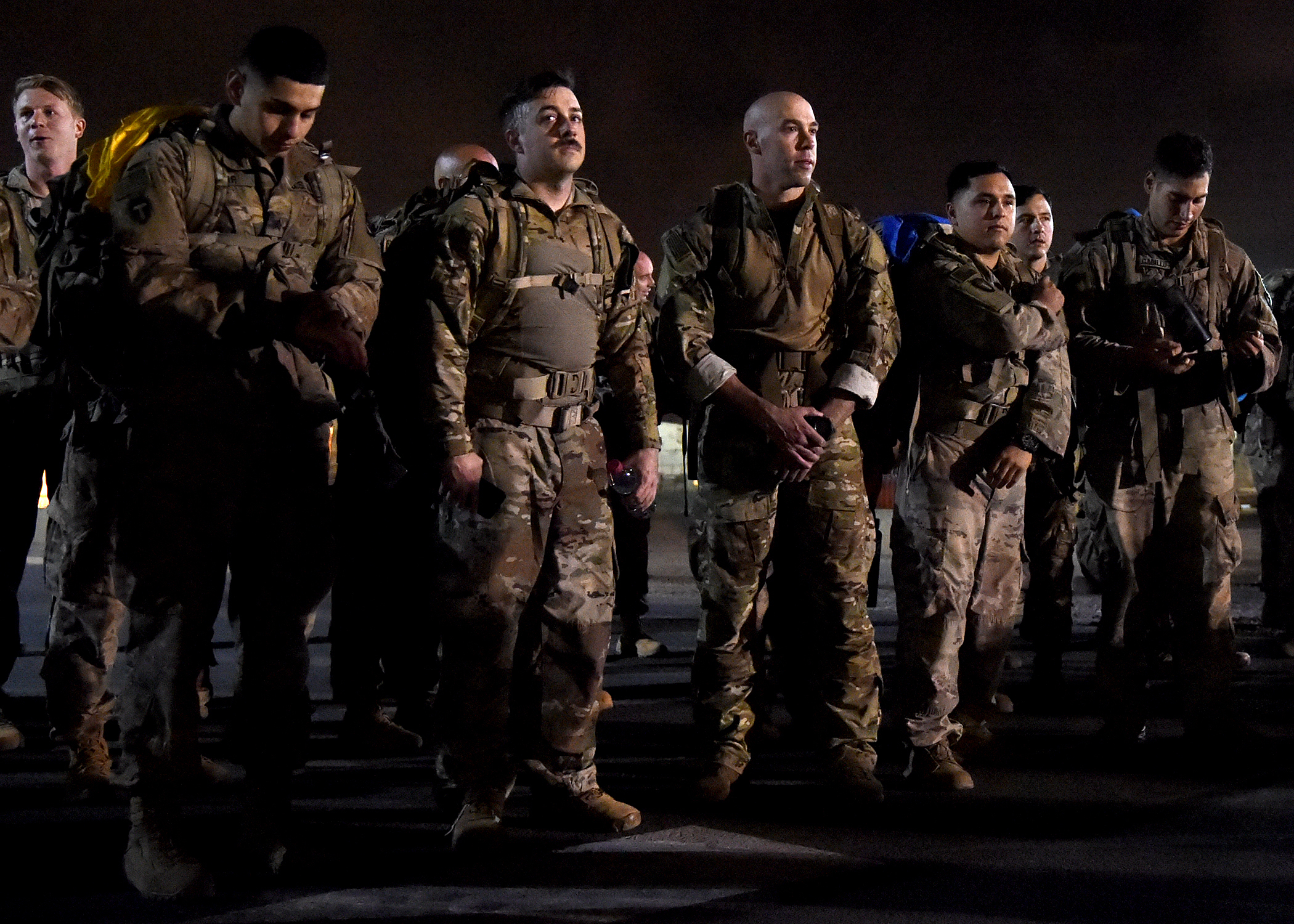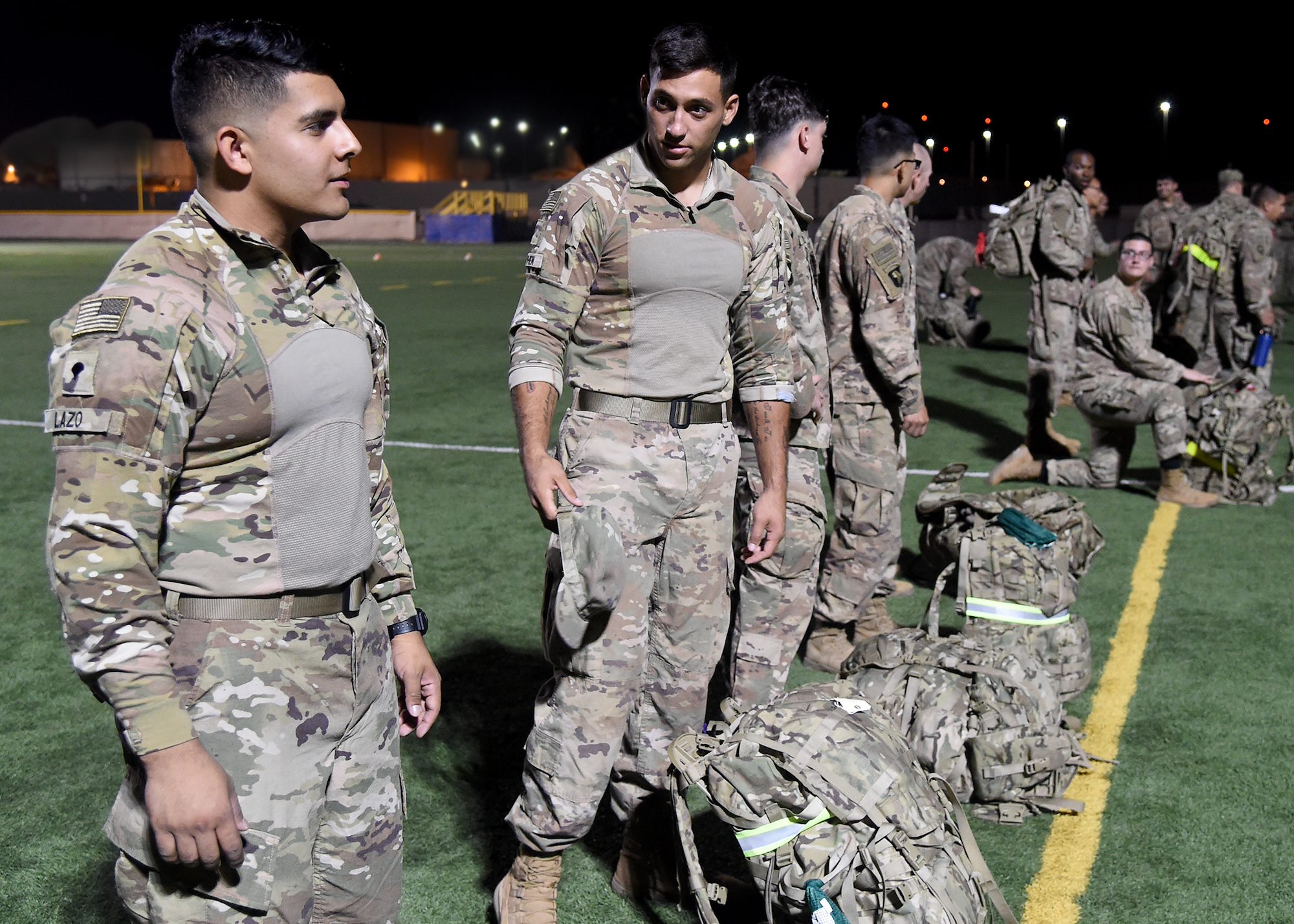 U.S. Army Soldiers from to Task Force Alamo, Texas National Guard, assigned to Combined Joint Task Force-Horn of Africa (CJTF-HOA), Djibouti, prepare for the “ruckrun” portion of the German Armed Forces Badge (GAFB) for Military Proficiency in Djibouti, Jan. 15, 2019. The GAFB is awarded to and worn by German service members of all ranks. Allied service members may also be awarded the badge, subject to their nations' uniform regulations. (U.S. Navy photo by Mass Communication Specialist 1st Class Nick Scott)