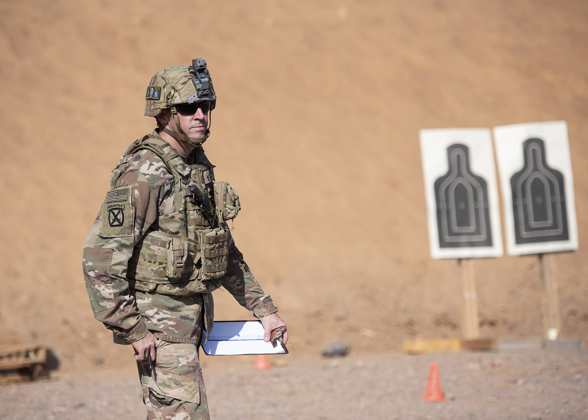 A U.S. Army Soldier from 1-141 Infantry Regiment, Task Force Alamo, Texas National Guard, assigned to Combined Joint Task Force-Horn of Africa, officiates the official marksmanship portion of the German Armed Forces Badge for military proficiency at the Arta Range Complex, Djibouti, Jan. 17, 2019. Competing for the badge offered a unique opportunity to Soldiers and worked as an information exchange between the U.S. and Germany militaries. (U.S. Air Force photo by Tech. Sgt. Shawn Nickel)