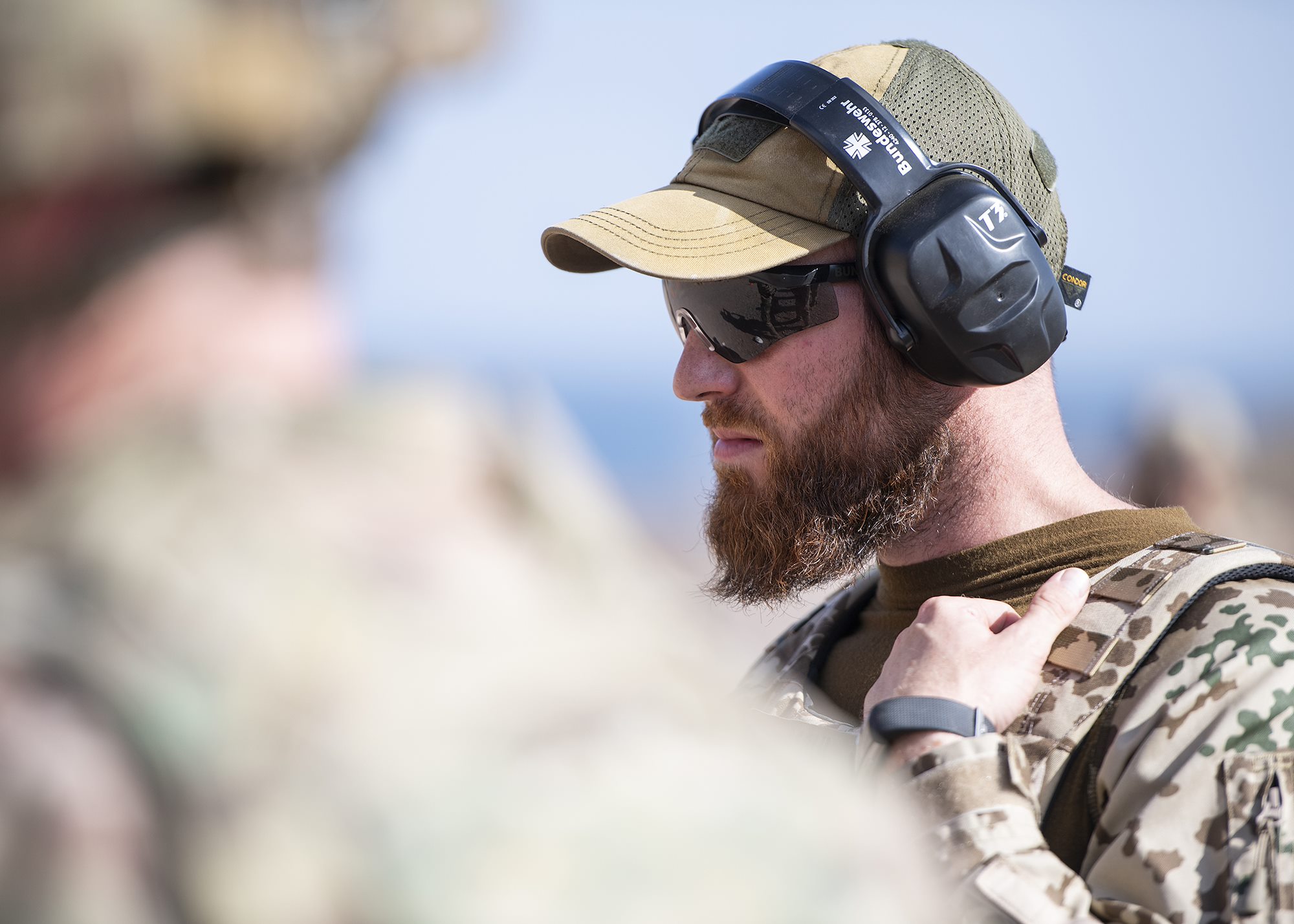 German Army Sgt. 1st Class Tobias Maul, information technology specialist and combat arms training instructor, assigned to Operation Atalanta, officiates the marksmanship portion of the German Armed Forces Badge for military proficiency at the Arta Range Complex, Djibouti, Jan. 17, 2019. Competing for the badge offered a unique opportunity to Soldiers and worked as an information exchange between the U.S. and Germany militaries. (U.S. Air Force photo by Tech. Sgt. Shawn Nickel)