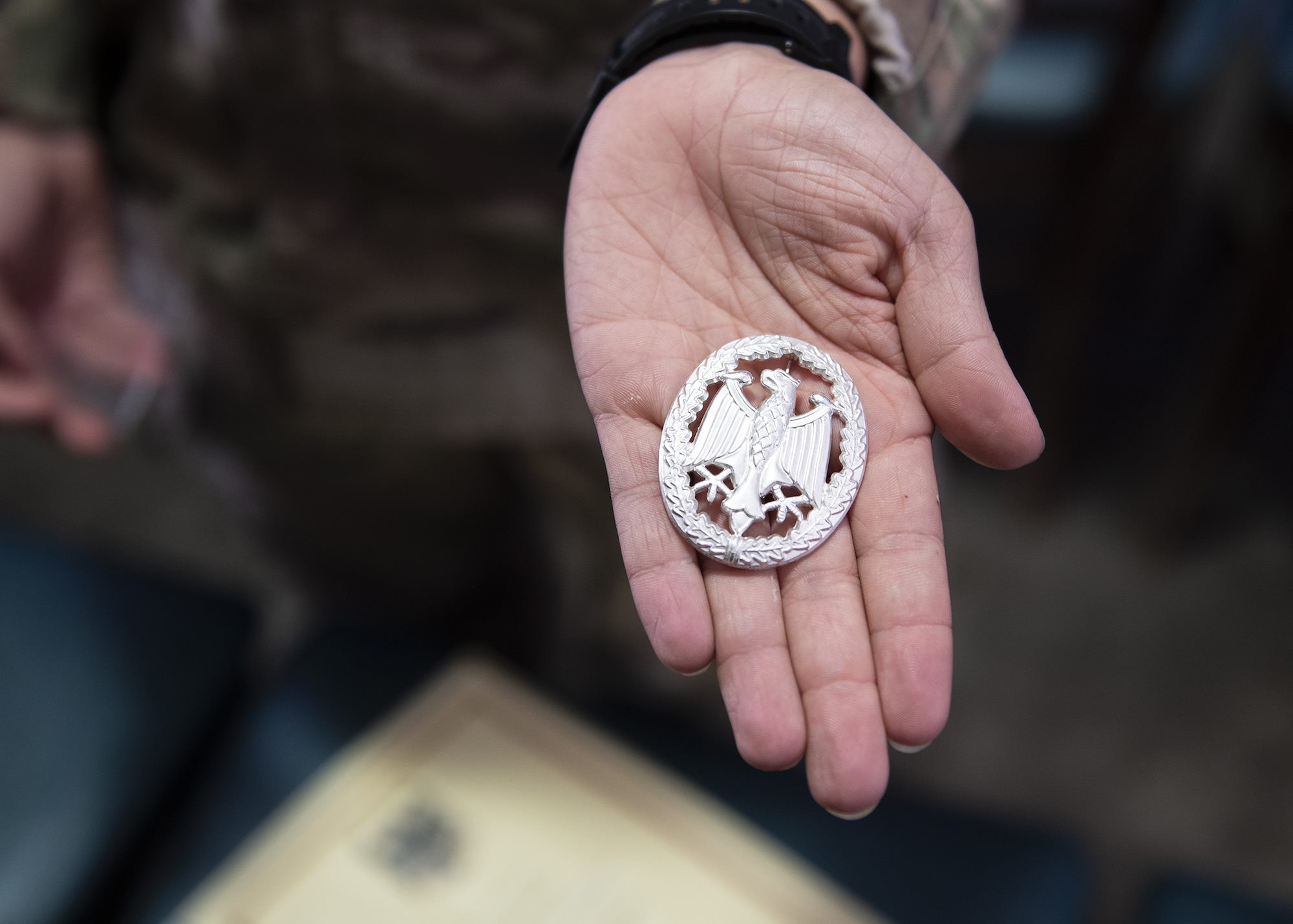 U.S. Army Spc. Natalia Webb, a medical technician from 1-141 Infantry Regiment, Task Force Alamo, Texas National Guard, assigned to Combined Joint Task Force-Horn of Africa, and the only female to earn the German Armed Forces Badge for military proficiency (GAFB) this rotation, displays her GAFB at an awards ceremony at Camp Lemonnier, Djibouti, Jan. 22, 2019. Competing for the badge offered a unique opportunity to Soldiers and worked as an information exchange between the U.S. and Germany militaries. (U.S. Air Force photo by Tech. Sgt. Shawn Nickel)