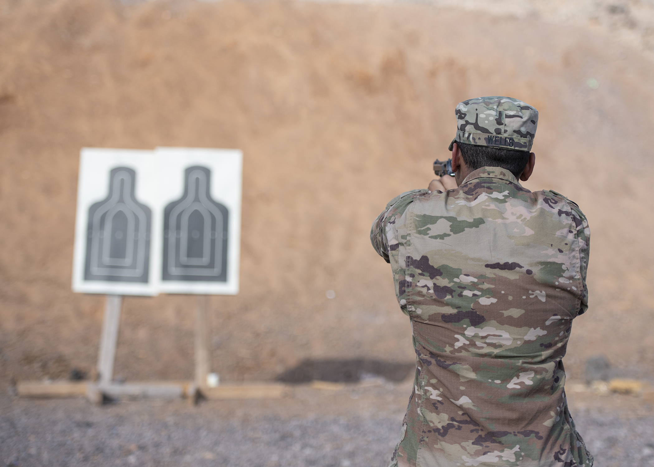A U.S. Army Soldier from 1-141 Infantry Regiment, Task Force Alamo, Texas National Guard, assigned to Combined Joint Task Force-Horn of Africa, practices before the official marksmanship portion of the German Armed Forces Badge for military proficiency at the Arta Range Complex, Djibouti, Jan. 17, 2019. Competing for the badge offered a unique opportunity to Soldiers and worked as an information exchange between the U.S. and Germany militaries. (U.S. Air Force photo by Tech. Sgt. Shawn Nickel)