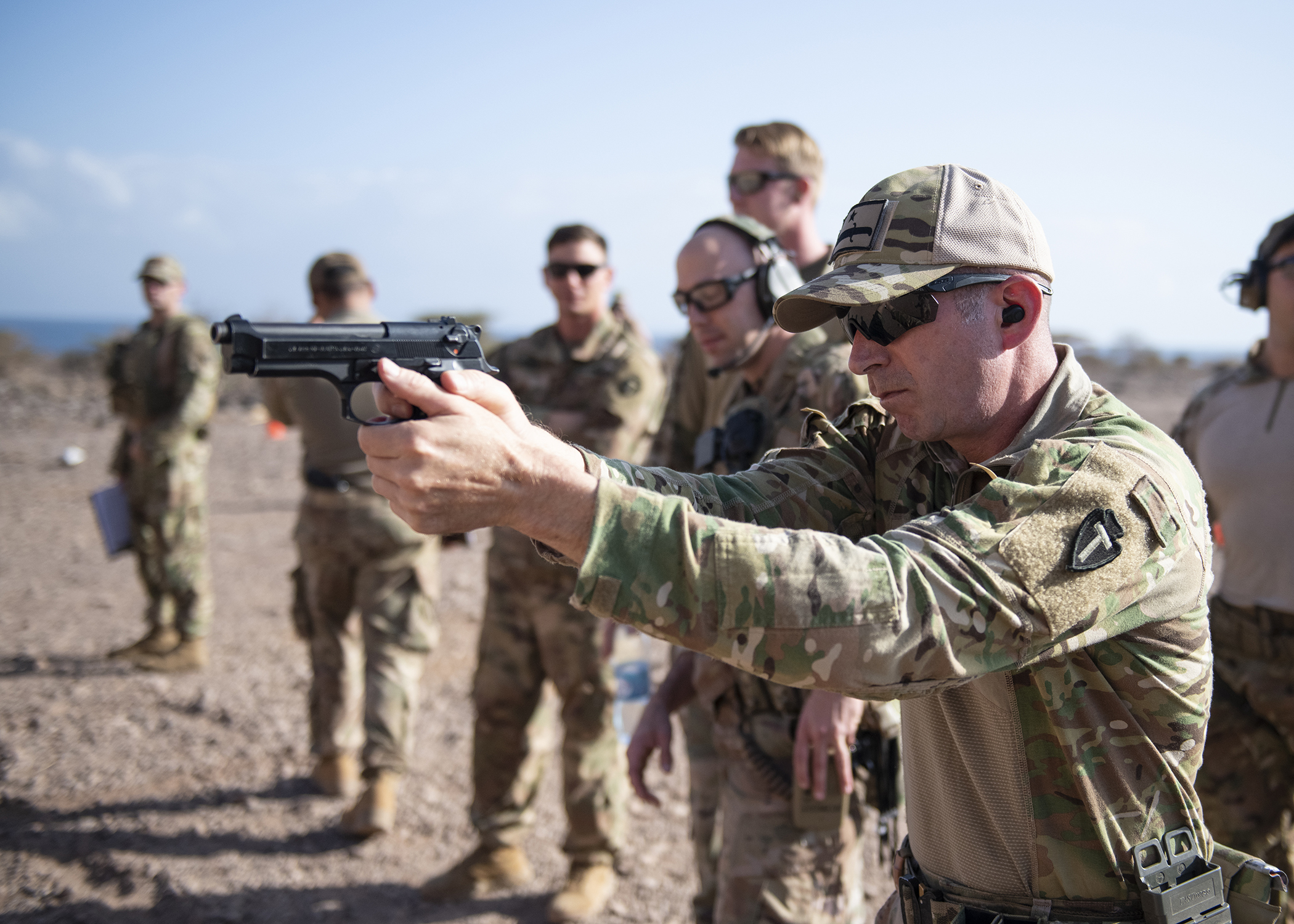 U.S. Army 1st Sgt. Jack Lamb, Bravo Company, 1-141 Infantry Regiment, Task Force Alamo, Texas National Guard, assigned to Combined Joint Task Force-Horn of Africa, practices before the official marksmanship portion of the German Armed Forces Badge for military proficiency at the Arta Range Complex, Djibouti, Jan. 17, 2019. Competing for the badge offered a unique opportunity to Soldiers and worked as an information exchange between the U.S. and Germany militaries. (U.S. Air Force photo by Tech. Sgt. Shawn Nickel)