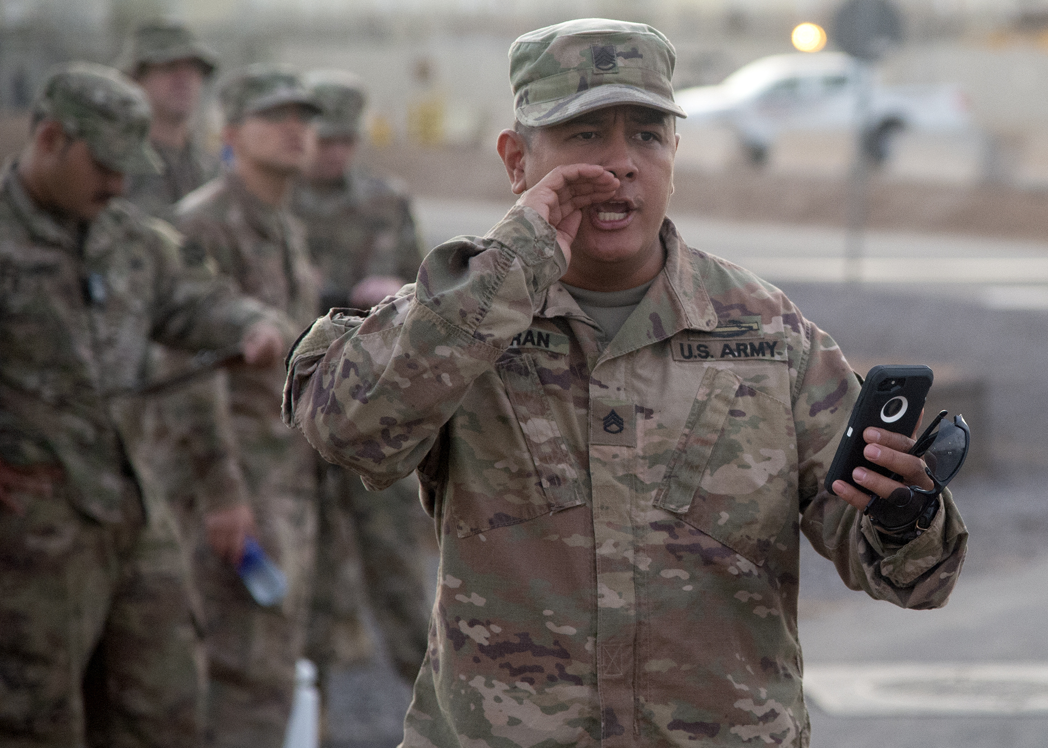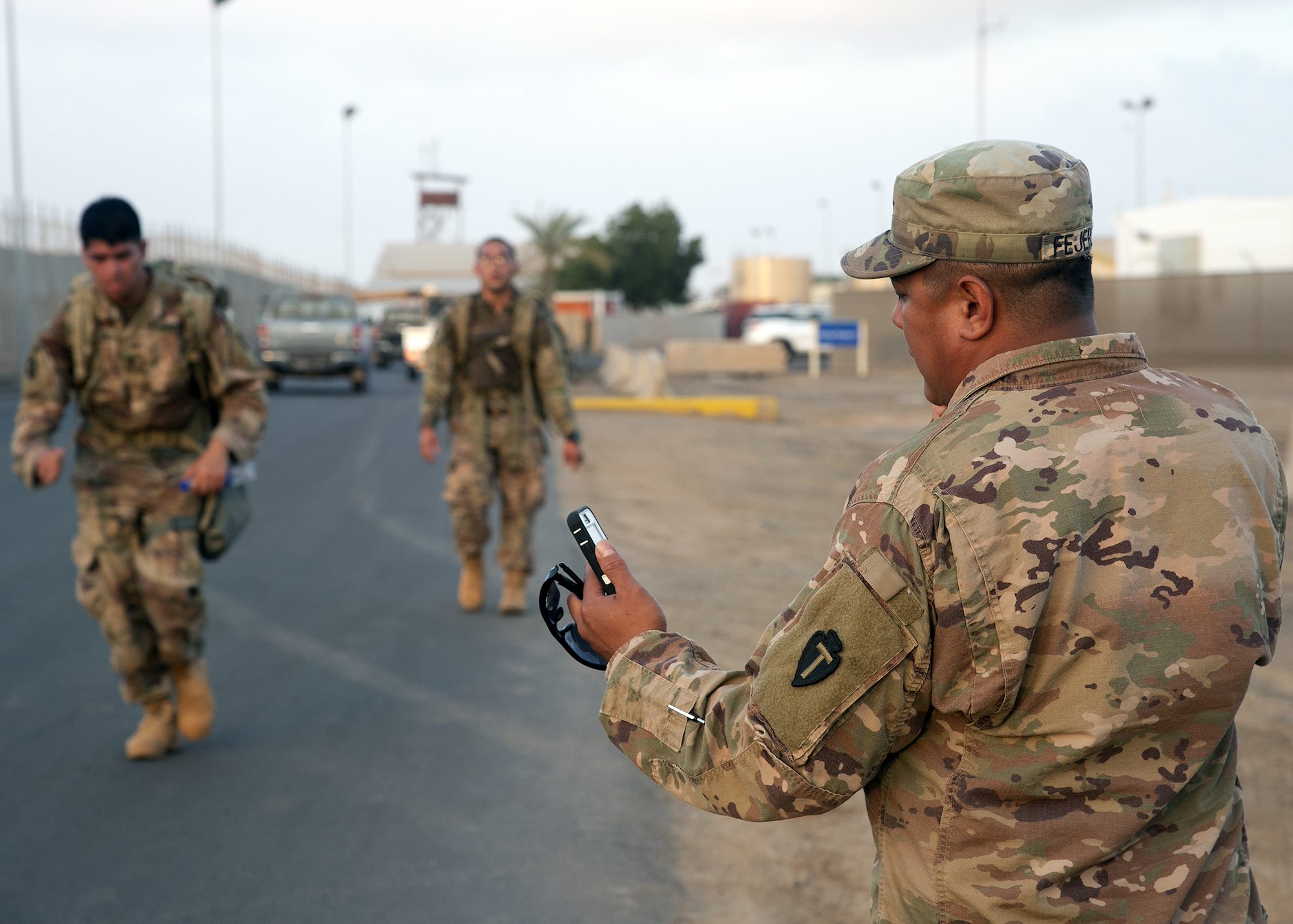 U.S. Army Staff Sgt. Zachary Fejeran, Bowie Company, 1st Battalion, Task Force Alamo, Texas National Guard, assigned to Combined Joint Task Force-Horn of Africa (CJTF-HOA), Djibouti, calls out times during a “ruckrun” for the German Armed Forces Badge (GAFB) for Military Proficiency in Djibouti, Jan. 15, 2019. The GAFB is awarded to and worn by German service members of all ranks. Allied service members may also be awarded the badge, subject to their nations' uniform regulations. (U.S. Navy photo by Mass Communication Specialist 1st Class Nick Scott)