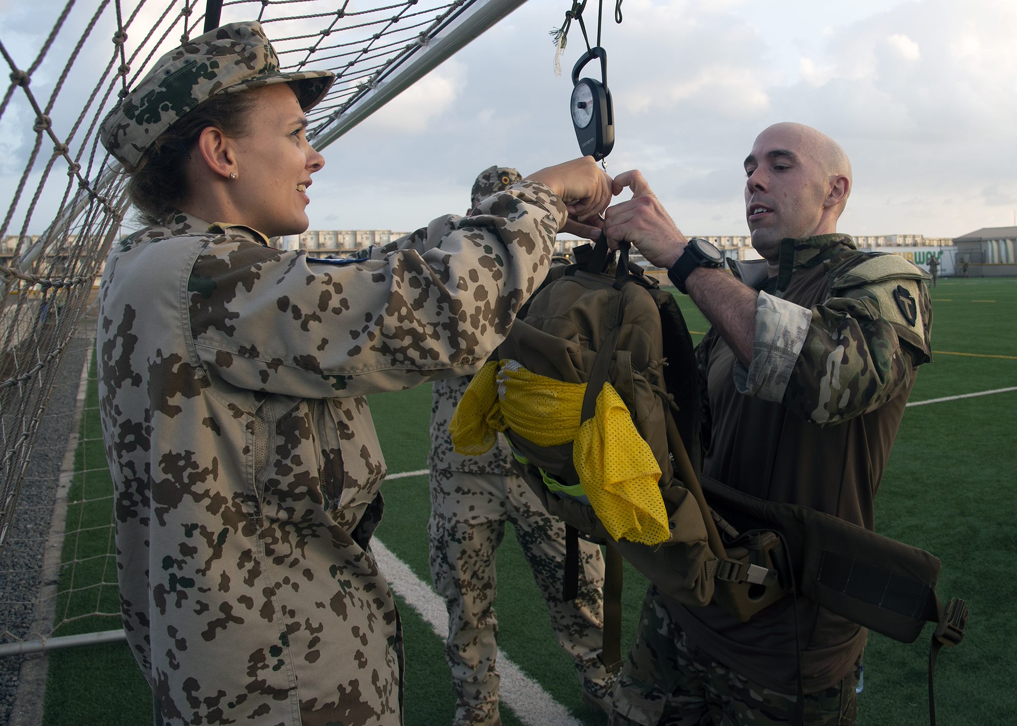 U.S. Army Capt. Joseph Brunone, right, Headquarters and Headquarters Company, 1st Battalion, Task Force Alamo, Texas National Guard, assigned to Combined Joint Task Force-Horn of Africa (CJTF-HOA), Djibouti, has his backpack weighed by German Navy Lt. Cmdr. Katharina Wrede, after a “ruckrun” for the German Armed Forces Badge (GAFB) for Military Proficiency in Djibouti, Jan. 15, 2019. The GAFB is awarded to and worn by German service members of all ranks. Allied service members may also be awarded the badge, subject to their nations' uniform regulations. During the “ruckrun”, backpacks are required to weight at or more than 33 pounds. (U.S. Navy photo by Mass Communication Specialist 1st Class Nick Scott)