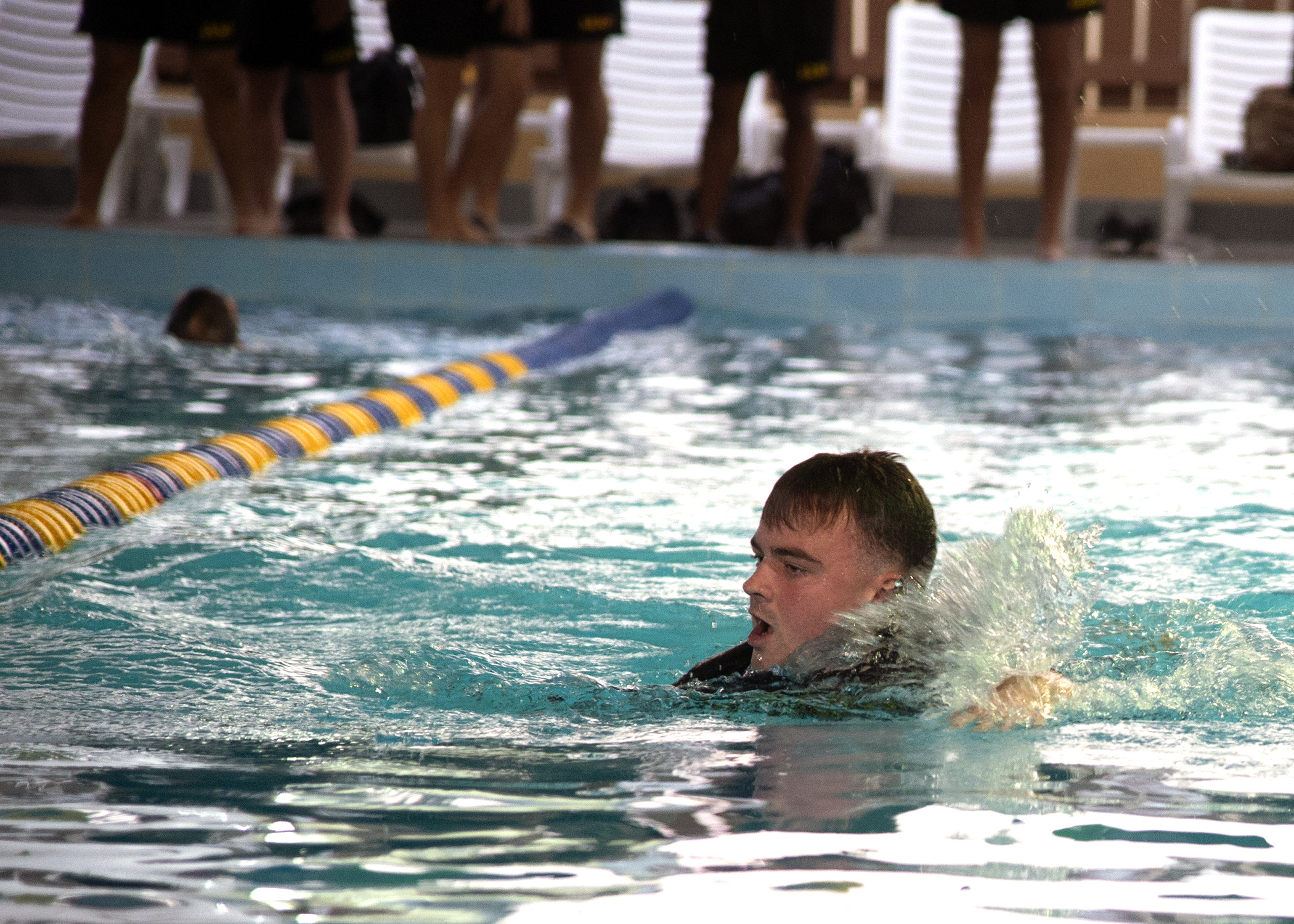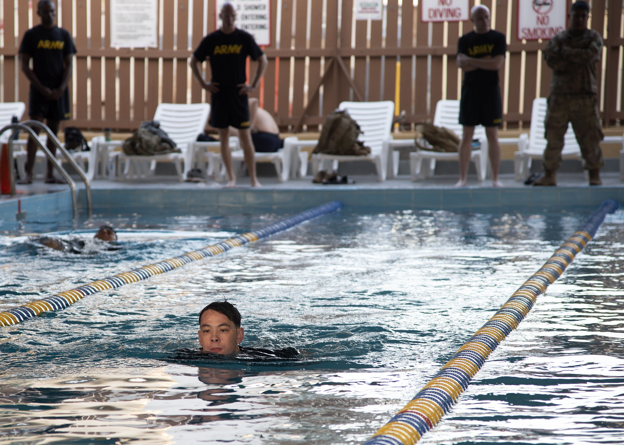 The 100-meter swim is conducted in military uniform with shorts and a t-shirt underneath, and must be accomplished in less than four minutes. After the swim is completed, time stops; however, the individual must also successfully remove their outer uniform without touching the side of the pool.