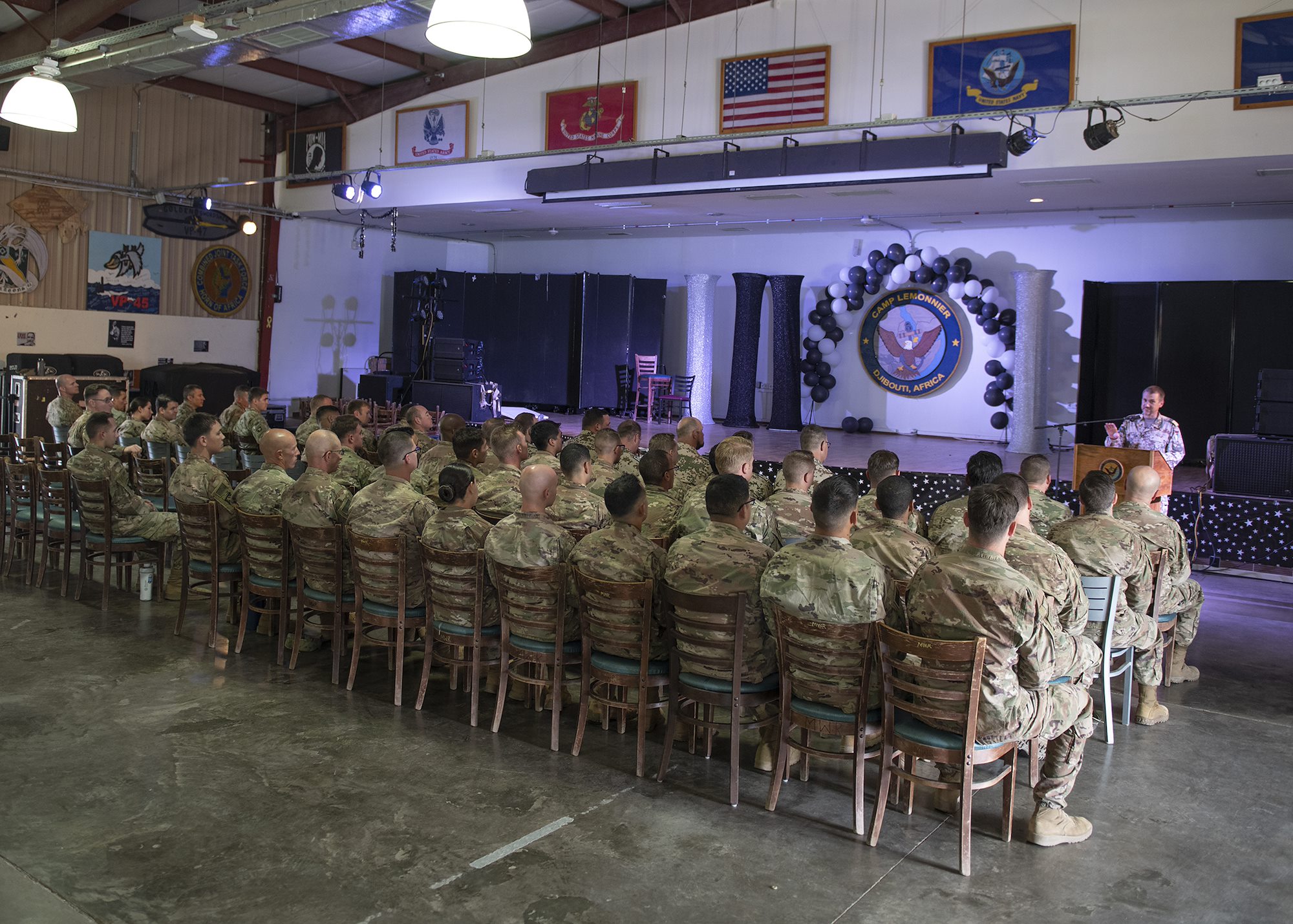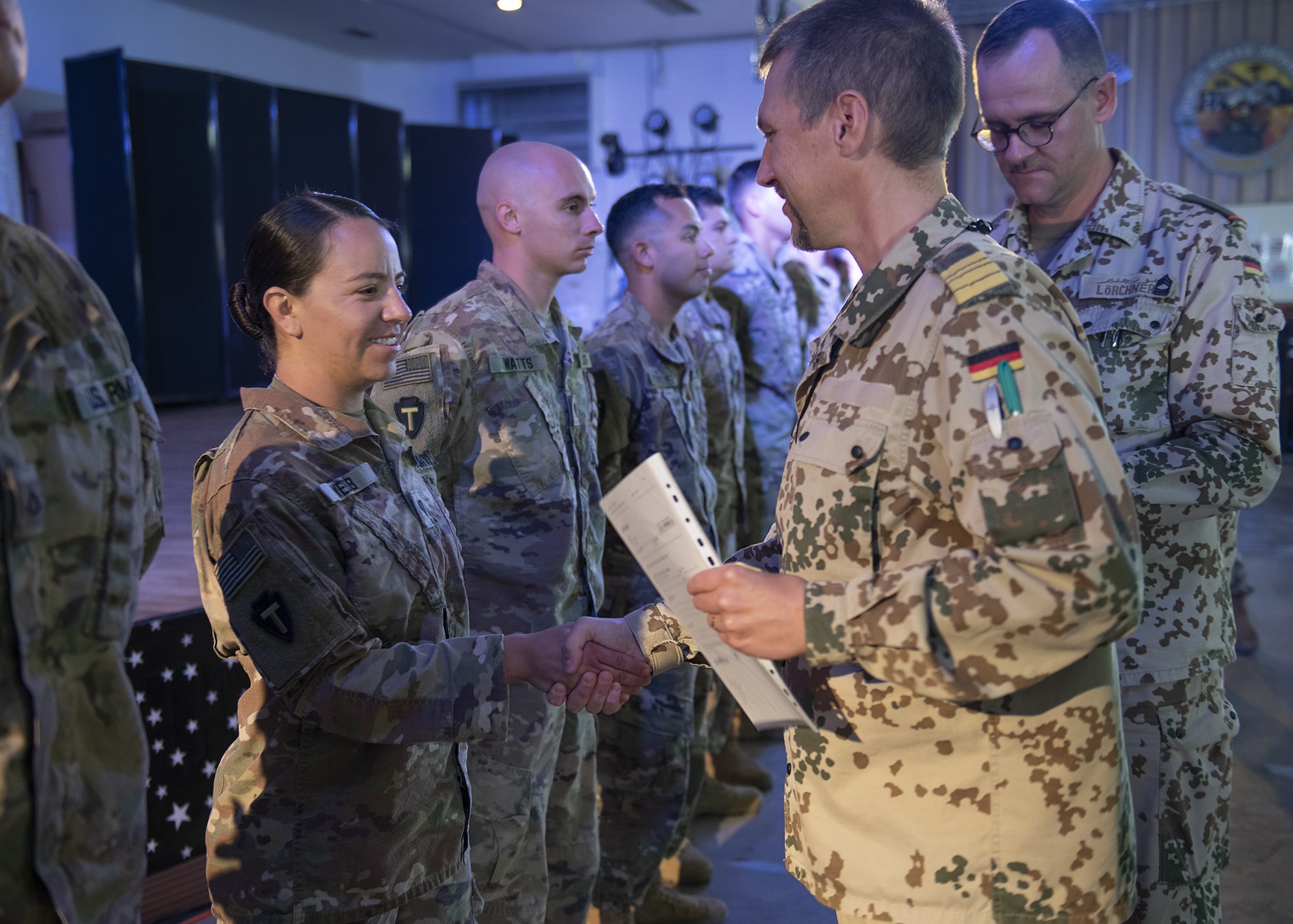 U.S. Army Soldier from 1-141 Infantry Regiment, Task Force Alamo, Texas National Guard, assigned to Combined Joint Task Force-Horn of Africa, and German Army and Navy service members gather for an awards presentation for the German Armed Forces Badge for military proficiency at the Camp Lemonnier, Djibouti, Jan. 22, 2019. Competing for the badge offered a unique opportunity to Soldiers and worked as an information exchange between the U.S. and Germany militaries. (U.S. Air Force photo by Tech. Sgt. Shawn Nickel)
