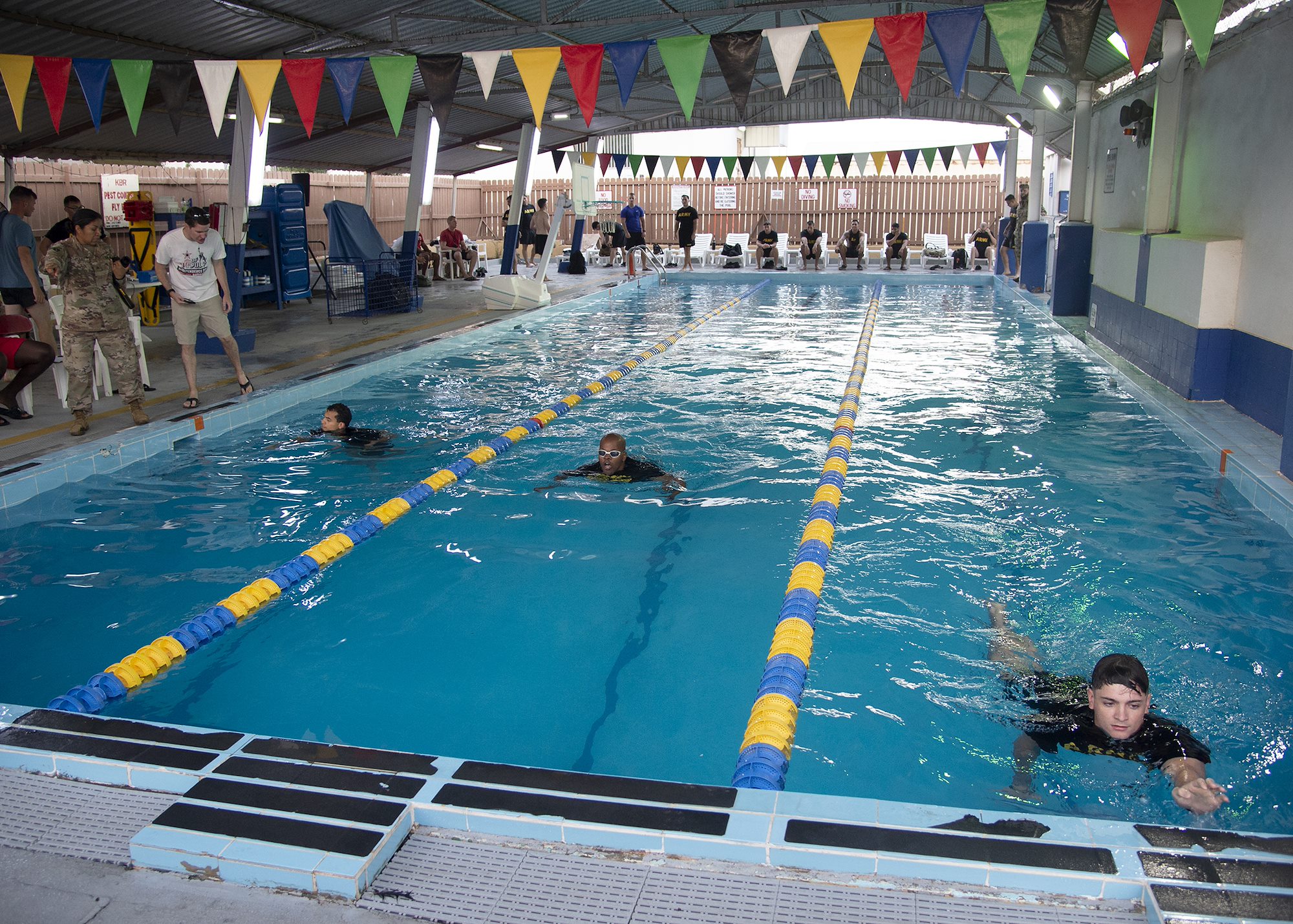 U.S. Army Soldiers from Task Force Alamo, Texas National Guard, assigned to Combined Joint Task Force-Horn of Africa (CJTF-HOA), Djibouti, compete in a swim competition for the German Armed Forces Badge (GAFB) for Military Proficiency in Djibouti, Jan. 16, 2019. The GAFB is awarded to and worn by German service members of all ranks. Allied service members may also be awarded the badge, subject to their nations' uniform regulations. (U.S. Navy photo by Mass Communication Specialist 1st Class Nick Scott)
