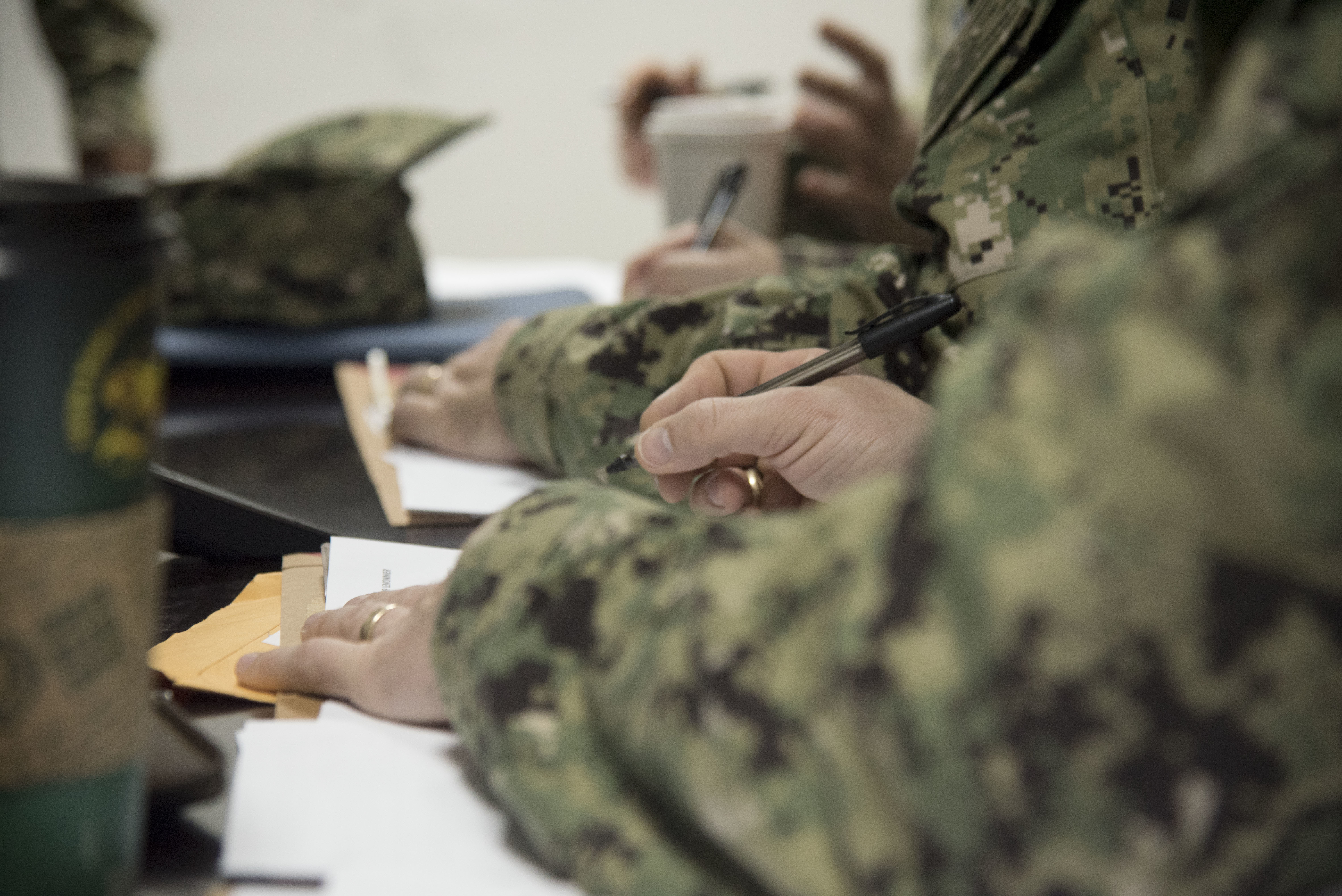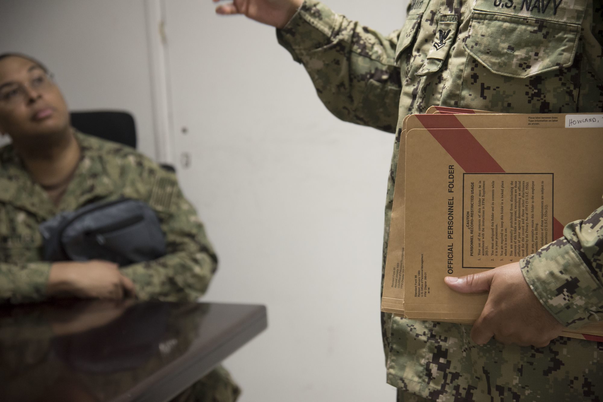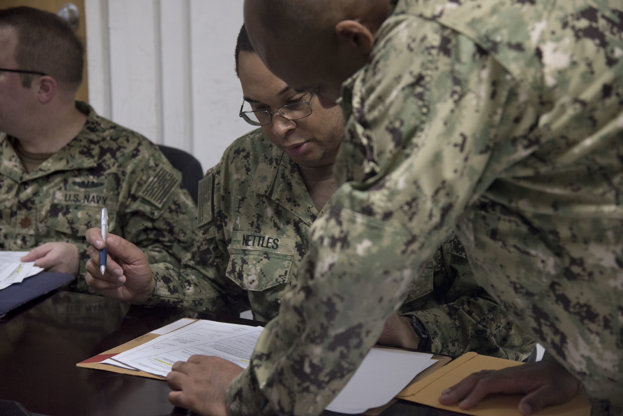 Every two weeks, the office conducts mass in-processing briefings, to ensure incoming Sailors, and the folders full of paperwork they deploy with, are squared away.