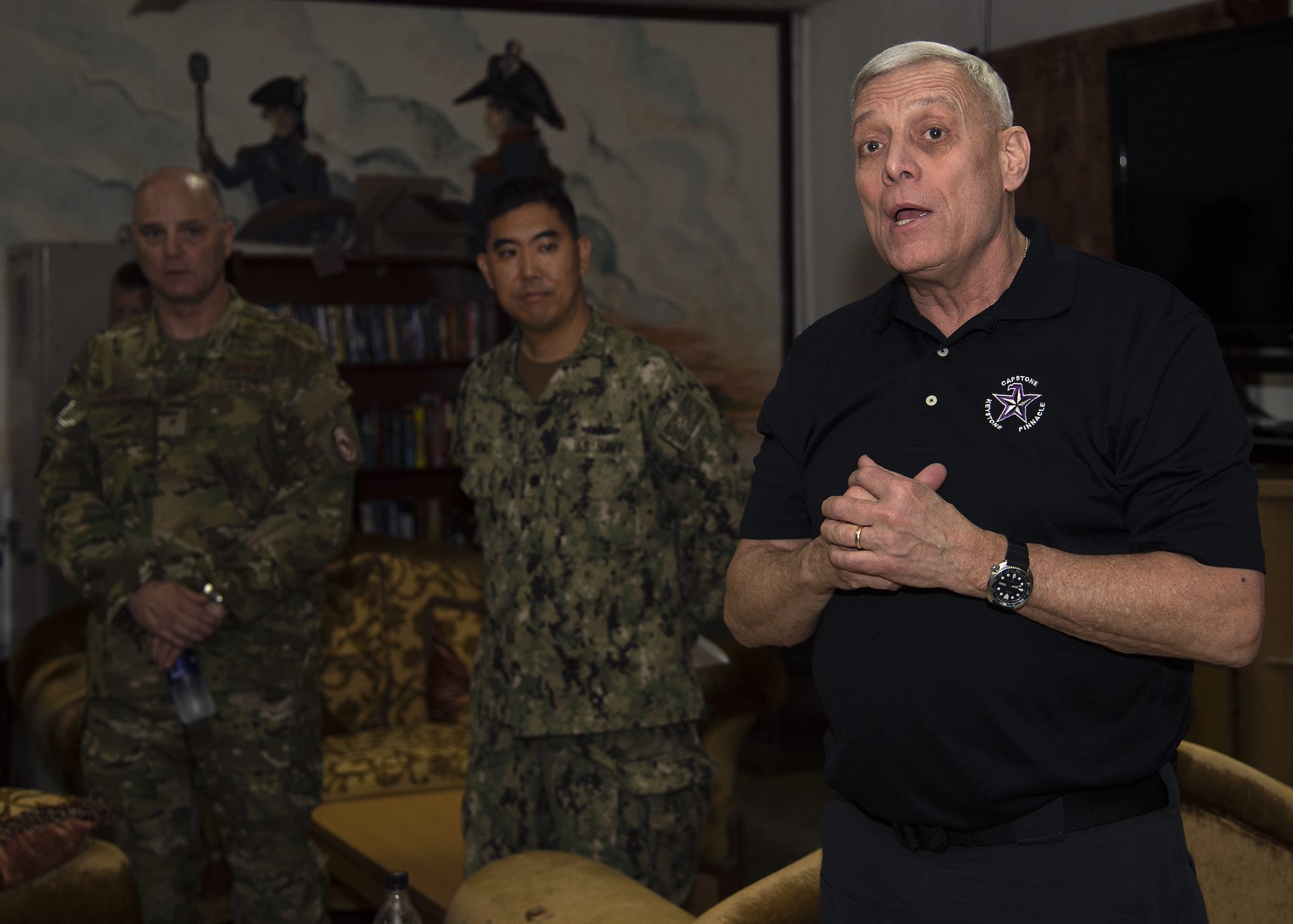 U.S. Marine Corps Gen. (ret.) John Paxton speaks at a meet-and-greet as part of the Capstone Military Leadership Program at Camp Lemonnier, Djibouti, Feb. 13, 2019. Capstone is a joint-service professional military education course for newly-promoted brigadier generals and rear admirals serving in the U.S. military. (U.S. Navy photo by Mass Communication Specialist 1st Class Nick Scott)