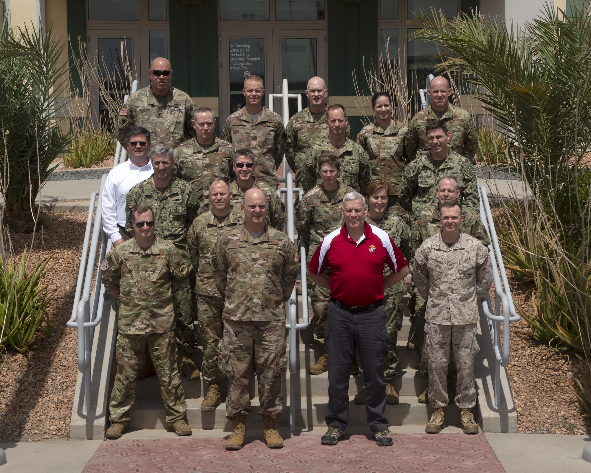 U.S. military general and flag officers from the U.S. Army, Marine Corps, Navy and Air Force pose for a group photo during a visit to Camp Lemonnier, Djibouti, Feb. 14, 2019, as part of the Capstone Military Leadership Program. Capstone is a joint-service professional military education course for newly-promoted brigadier generals and rear admirals serving in the U.S. military. (U.S. Navy photo by Mass Communication Specialist 1st Class Nick Scott)