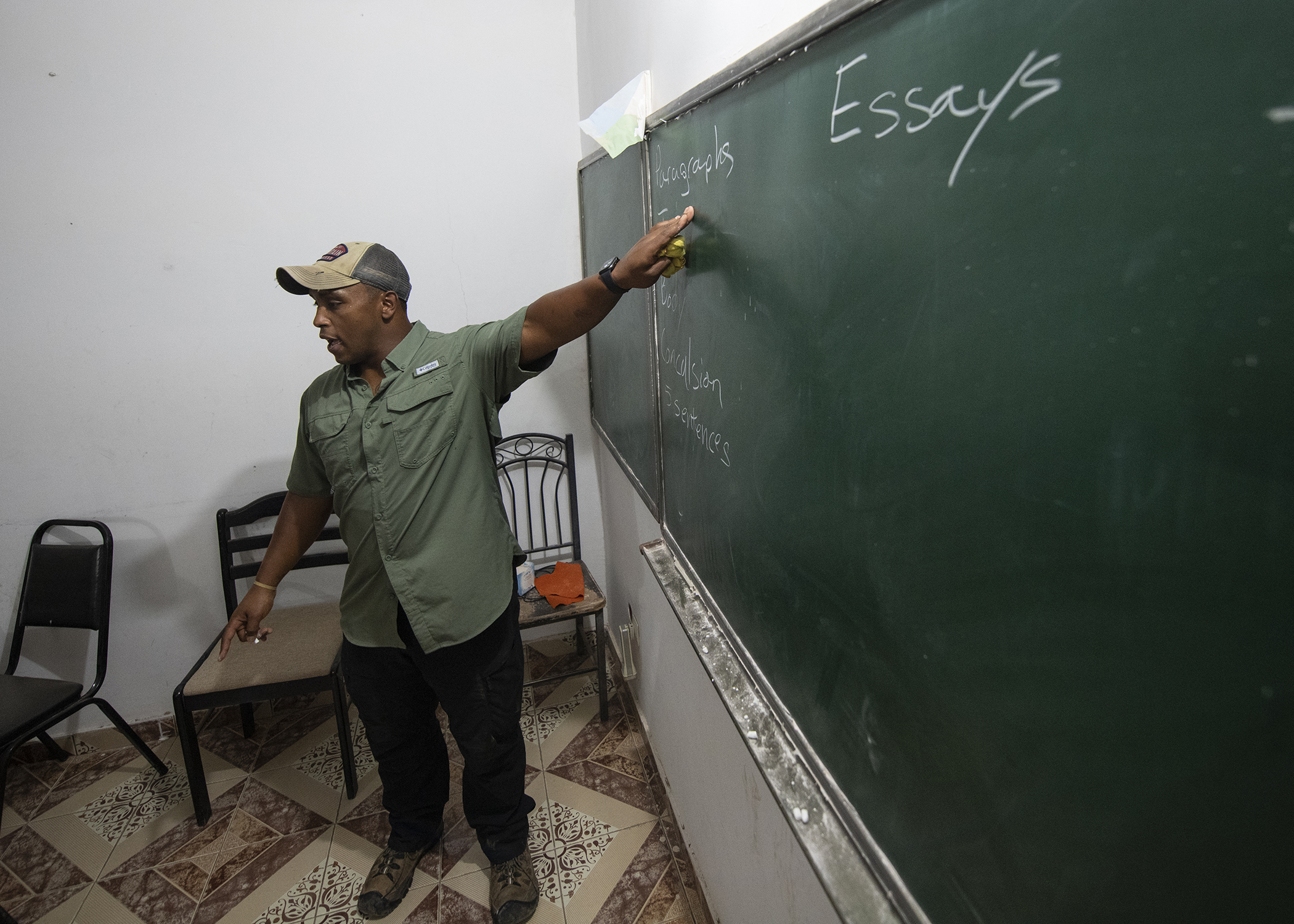 U.S. Army Staff Sgt. Willie Linson, the senior medic for 404th Civil Affairs Battalion, leads an English Discussion Group in Tadjourah, Djibouti, Feb. 12, 2019. More than 90 Djiboutian youth and adults attended the group where students develop practical linguistic and rhetorical skills through conversation with English-speaking U.S. service members. (U.S. Air Force photo by Tech. Sgt. Shawn Nickel)