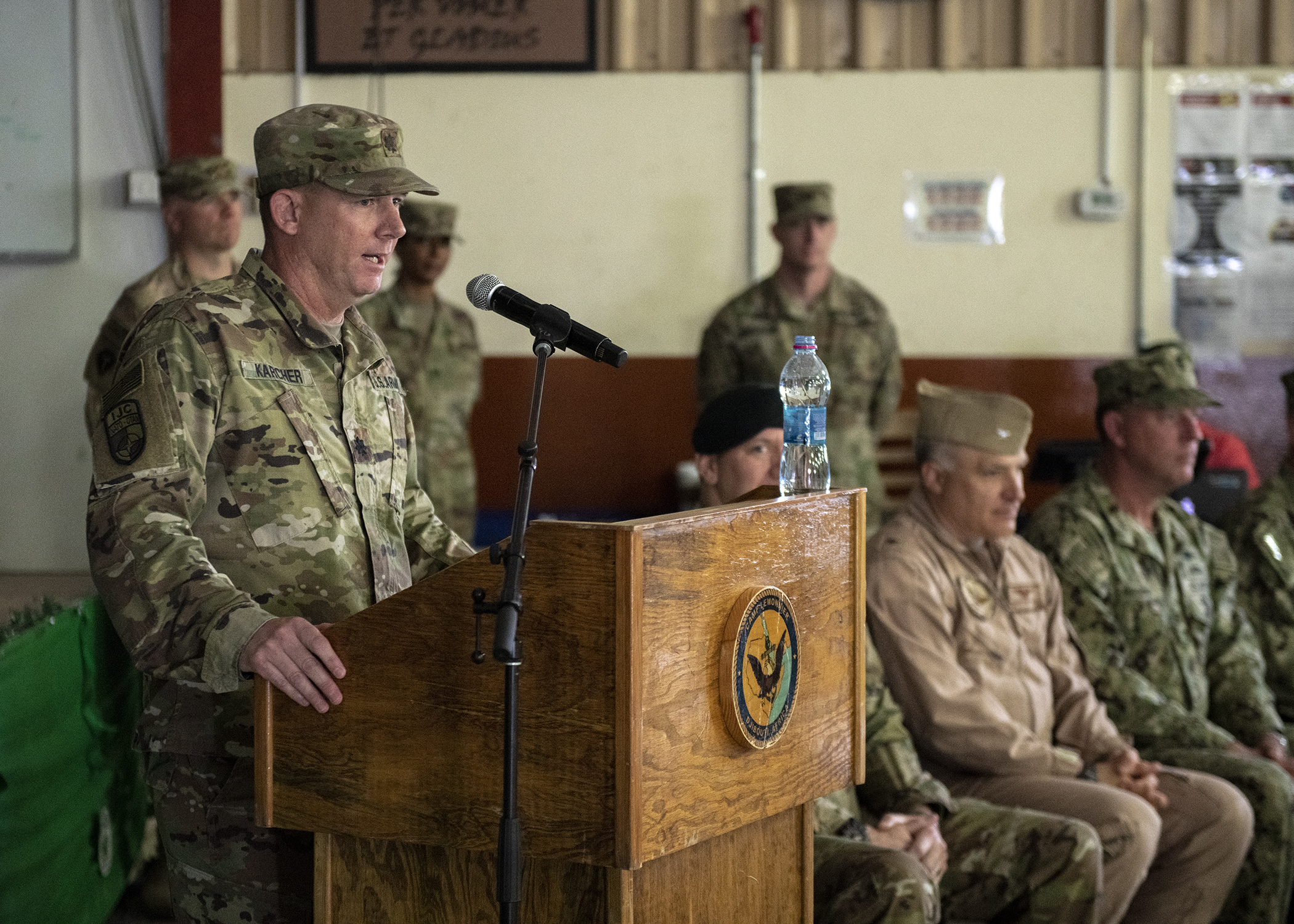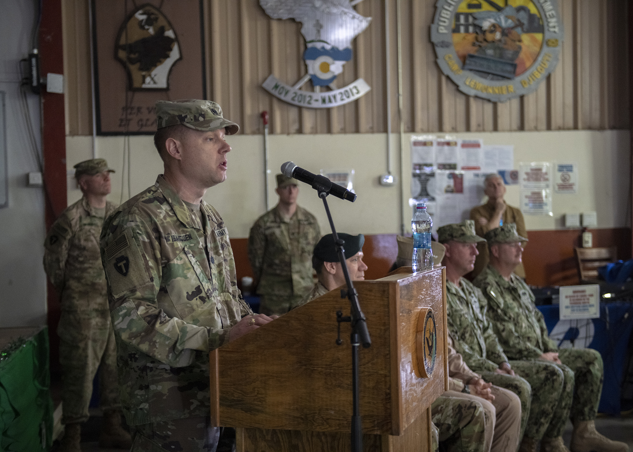 U.S. Army Lt. Col. Richard Karcher, commander, 2nd Battalion, 113th Infantry Regiment, Task Force Warrior, New Jersey National Guard, gives a speech while assuming his unit’s mission at Combined Joint Task Force-Horn of Africa (CJTF-HOA) to 2nd Battalion, 113th Infantry Regiment, Task Force Warrior, New Jersey National Guard, during a transfer of authority ceremony at Camp Lemonnier, Djibouti, March 15, 2019. Task Force Warrior assumed responsibility as the security forces battalion for CJTF-HOA and will also contribute to international efforts to enhance security and stability in East Africa. (U.S. Air Force Photo by Tech. Sgt. Shawn Nickel)