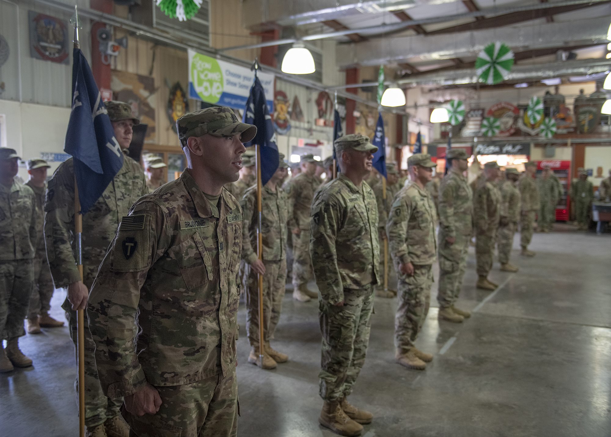 U.S. Army Soldiers from 1st Battalion, 141st Infantry Regiment, Task Force Alamo, Texas National Guard, stand at attention during a transfer of authority ceremony at Camp Lemonnier, Djibouti, March 15, 2019. The 2nd Battalion, 113th Infantry Regiment, Task Force Warrior, New Jersey National Guard, assumed responsibility as the security forces battalion for Combined Joint Task Force-Horn of Africa and will also contribute to international efforts to enhance security and stability in East Africa. (U.S. Air Force Photo by Tech. Sgt. Shawn Nickel)