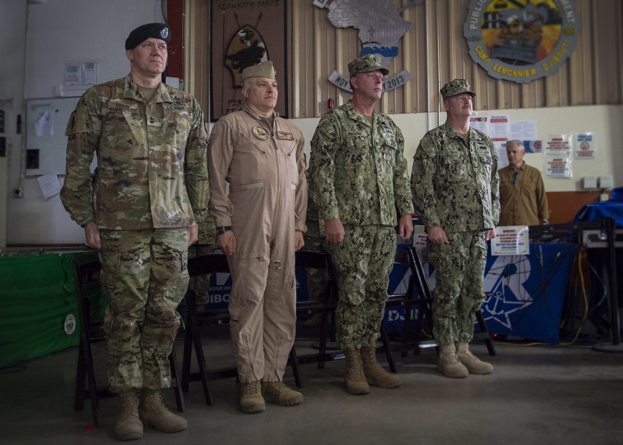 Left to right, U.S. Army Maj. Gen. James D. Craig, commanding general, Combined Joint Task Force-Horn of Africa (CJTF-HOA); U.S. Navy Capt. Charles J. DeGilio, commanding officer, Camp Lemonnier, Djibouti; U.S. Navy Master Chief Petty Officer Karl W. Parsons, command senior enlisted leader, CJTF-HOA; and U.S. Navy Master Chief Petty Officer Andy L. Gray, command senior enlisted leader, Camp Lemonnier, stand at attention during a transfer of authority ceremony at Camp Lemonnier, March 15, 2019. U.S. Army Soldiers from 2nd Battalion, 113th Infantry Regiment, Task Force Warrior, New Jersey National Guard, assumed authority of their mission at CJTF-HOA from 1st Battalion, 141st Infantry, Task Force Alamo, Texas National Guard during the ceremony. (U.S. Air Force Photo by Tech. Sgt. Shawn Nickel)