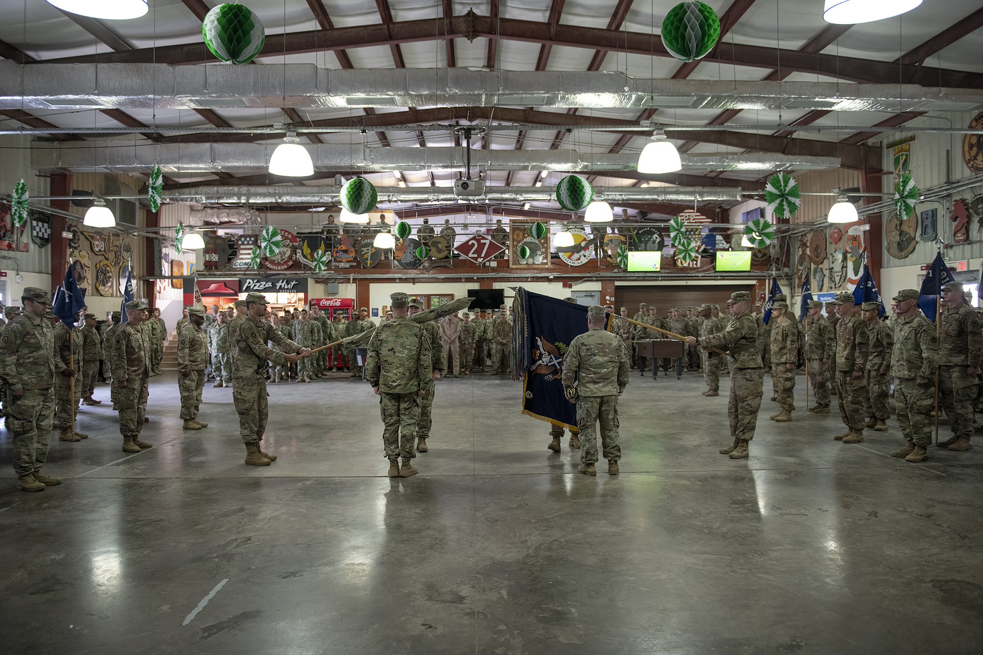 During the ceremony, U.S. Army Lt. Col. Sean Ibarguen, battalion commander of Task Force Alamo, welcomed U.S. Army Lt. Col. Richard Karcher, battalion commander of Task Force Warrior.