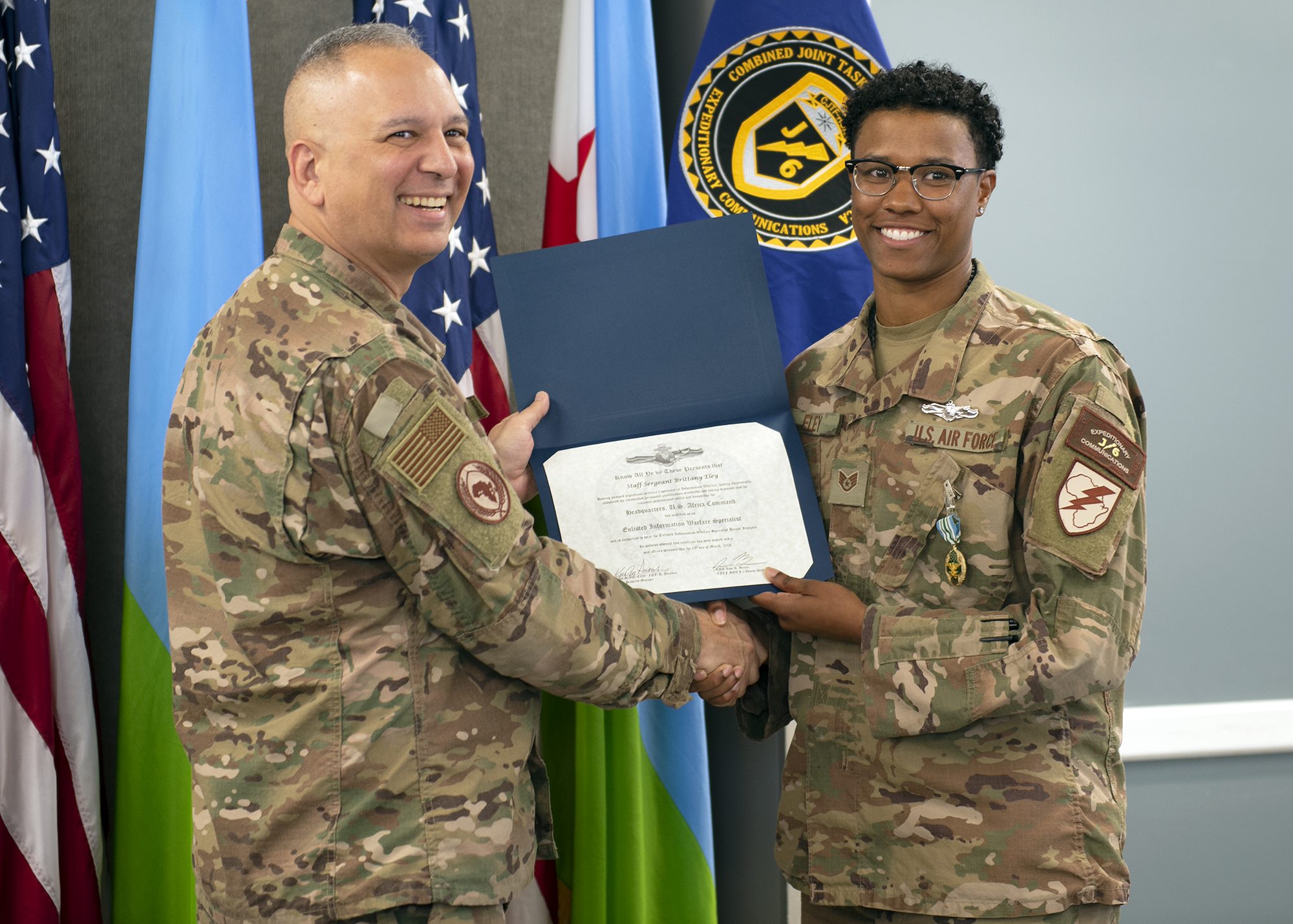 CAMP LEMONNIER, Djibouti – U.S. Air Force Staff Sgt. Brittany Eley, a Joint Network Control Center team lead attached to Combined Joint Task Force-Horn of Africa, earned recognition as a U.S. Navy enlisted information warfare specialist, April 1, 2019.