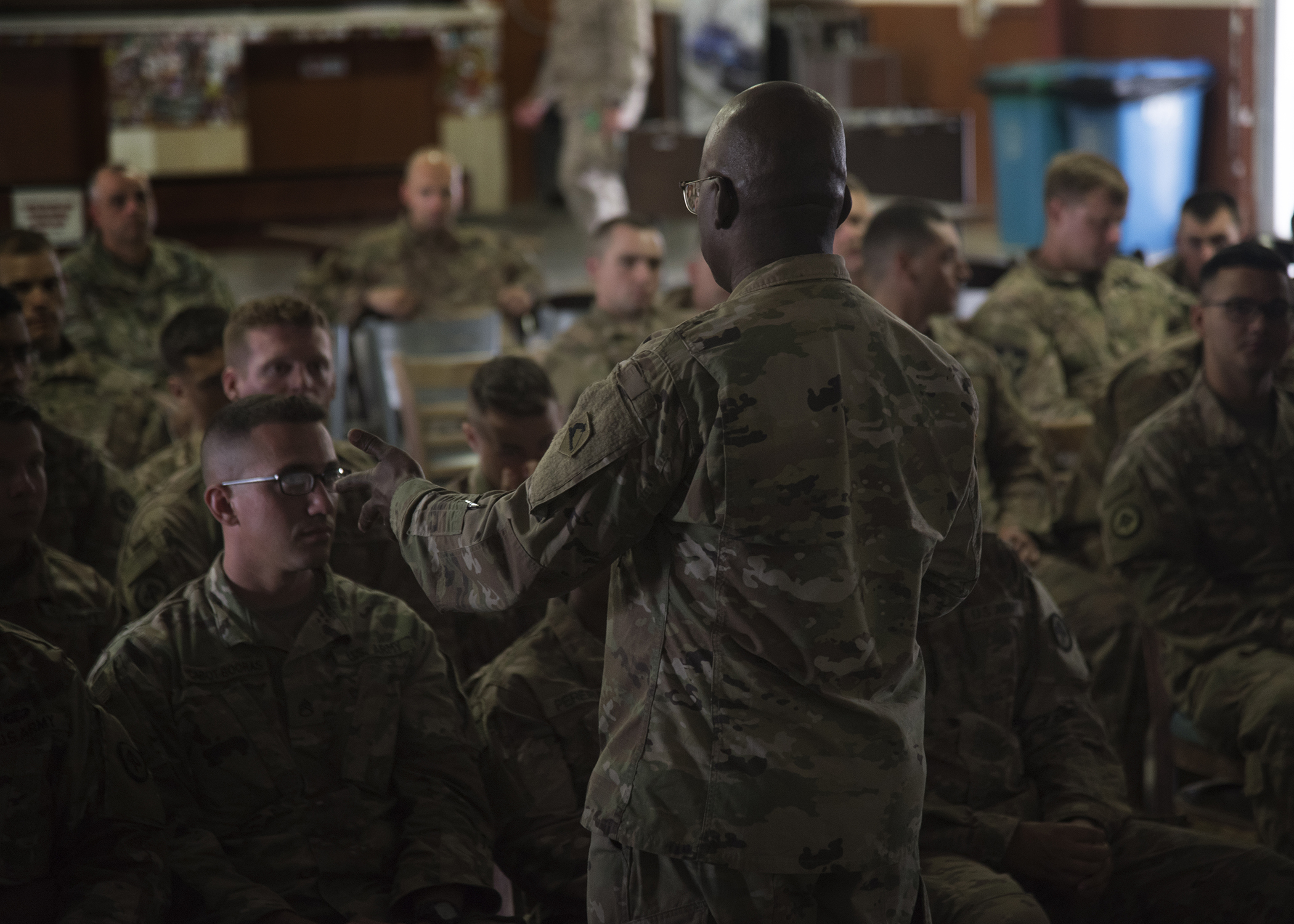 U.S. Army Col. Paul Minor, chaplain with the Massachusetts National Guard, speaks to U.S. Soldiers from the Massachusetts National Guard deployed to Combined Joint Task Force-Horn of Africa (CJTF-HOA), during a battlefield circulation at Camp Lemonnier, Djibouti, April 25, 2019. Minor met with more than 80 Massachusetts National Guard Soldiers assigned to, Charlie Company, 1st Battalion, 181st Infantry Regiment, mobilized to support Task Force Warrior, prior to visiting Kenya, which is Massachusetts' assigned country under the Department of Defense National Guard State Partnership Program. (U.S. Air Force Photo by Senior Airman Kirsten Brandes)