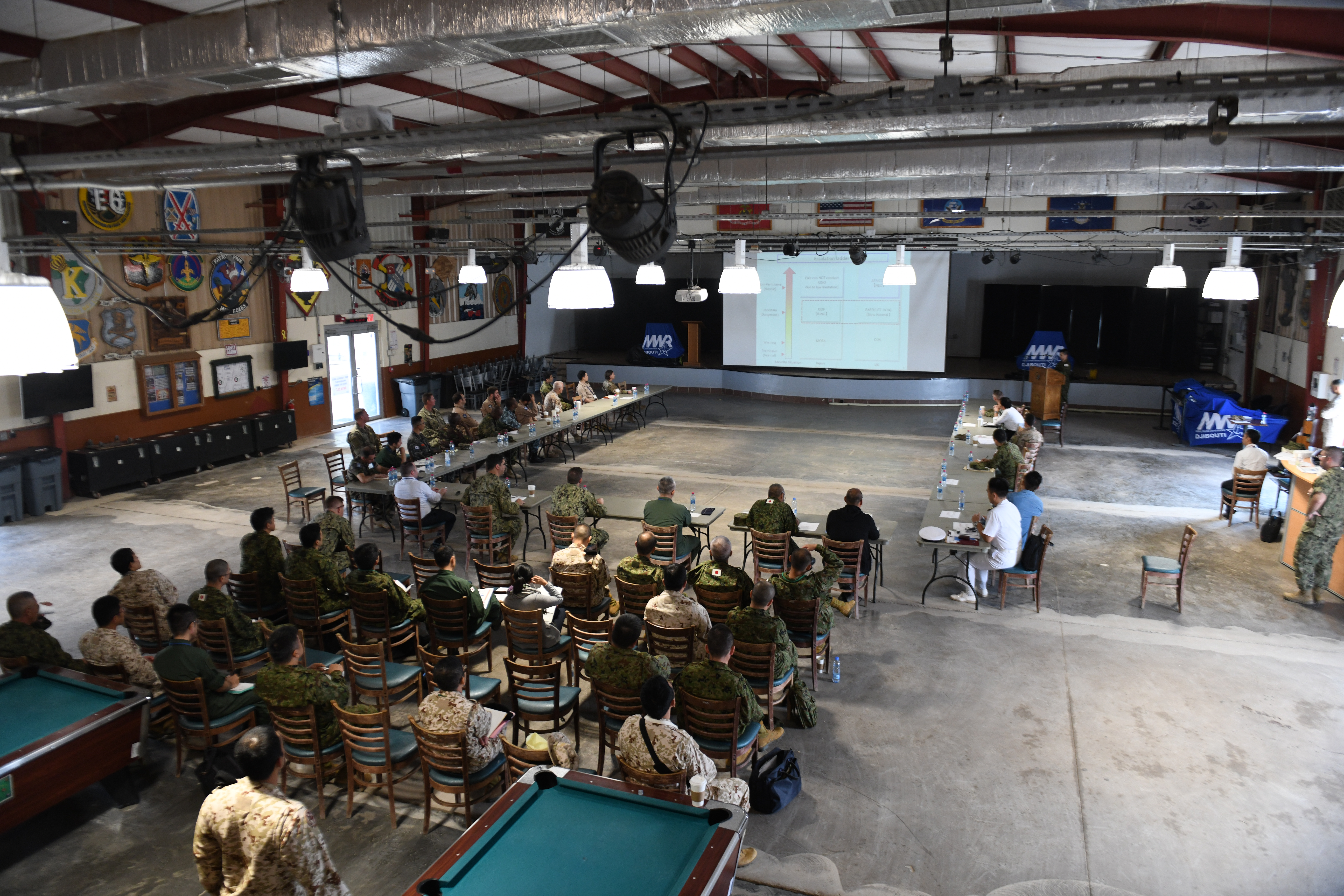 Multinational service members and representatives take part in a tabletop discussion during a Japanese-led noncombatant evacuation operation (NEO) exercise held at Camp Lemonnier, Djibouti, Oct. 4, 2019. Service members assigned to Combined Joint Task Force-Horn of Africa (CJTF-HOA) worked together with the Japan Self-Defense Force (JSDF) to share capabilities during the multi-day event, which was held from Oct. 1-4. (U.S. Air Force photo by Senior Airman Gabrielle Spalding)