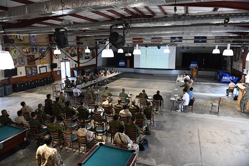 Multinational service members and representatives take part in a tabletop discussion during an annual noncombatant evacuation operation (NEO) exercise held at Camp Lemonnier, Djibouti, Oct. 4, 2019. Service members assigned to Combined Joint Task Force-Horn of Africa (CJTF-HOA) worked together with the Japan Self-Defense Force (JSDF) to share capabilities during the multi-day event, which was held from Oct. 1-4. (U.S. Air Force photo by Senior Airman Gabrielle Spalding)