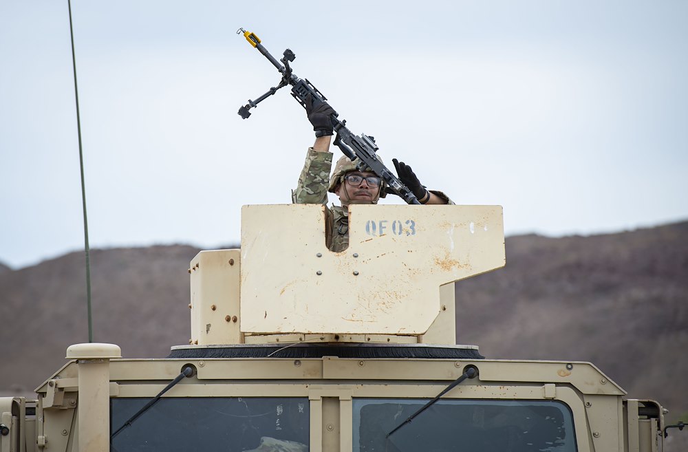 A Japanese service member watches U.S. Army High Mobility Multipurpose Wheeled Vehicles (HMMWV) during a bilateral field training exercise in Djibouti, Africa, Oct. 2, 2019. The training was part of a multi-day exercise with Combined Joint Task Force-Horn of Africa (CJTF-HOA) and Japanese service members, during which multinational discussions, NEO tracking system demonstrations, and tabletop exercises were conducted. (U.S. Air Force photo by Senior Airman Gabrielle Spalding)