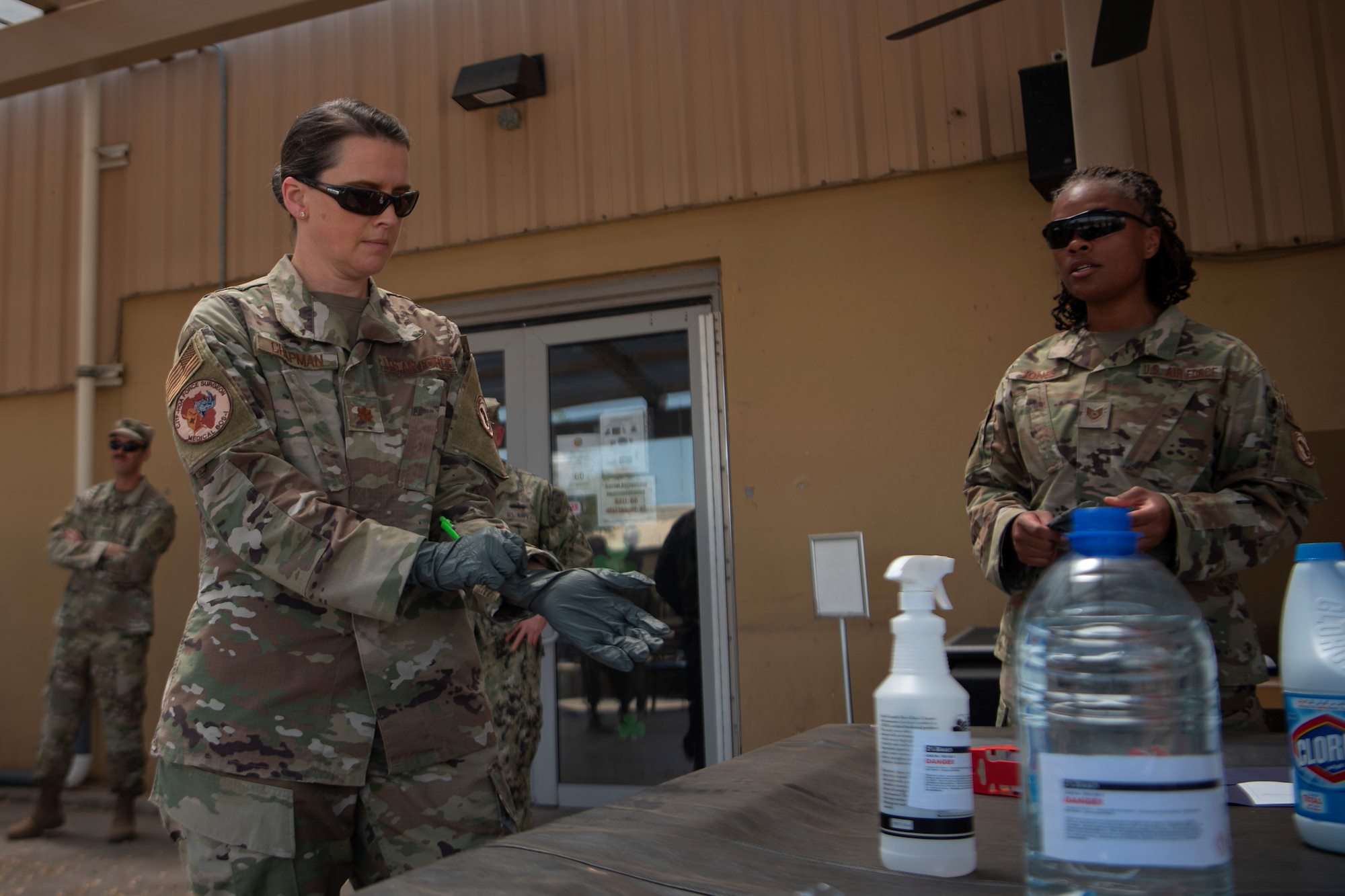 “The team was taught how germs, such as viruses, can live on non-porous surfaces, such as metal, glass, plastic, and laminated surfaces, for up to several days,” said. U.S. Air Force Maj. Leah Chapman, CJTF-HOA environmental and public health officer. “They were also taught the importance of cleaning and wiping down all such surfaces and objects, how to mix a bleach cleaning solution and how to apply it in the varying common use locations and the use of proper personal protective equipment for the job.”