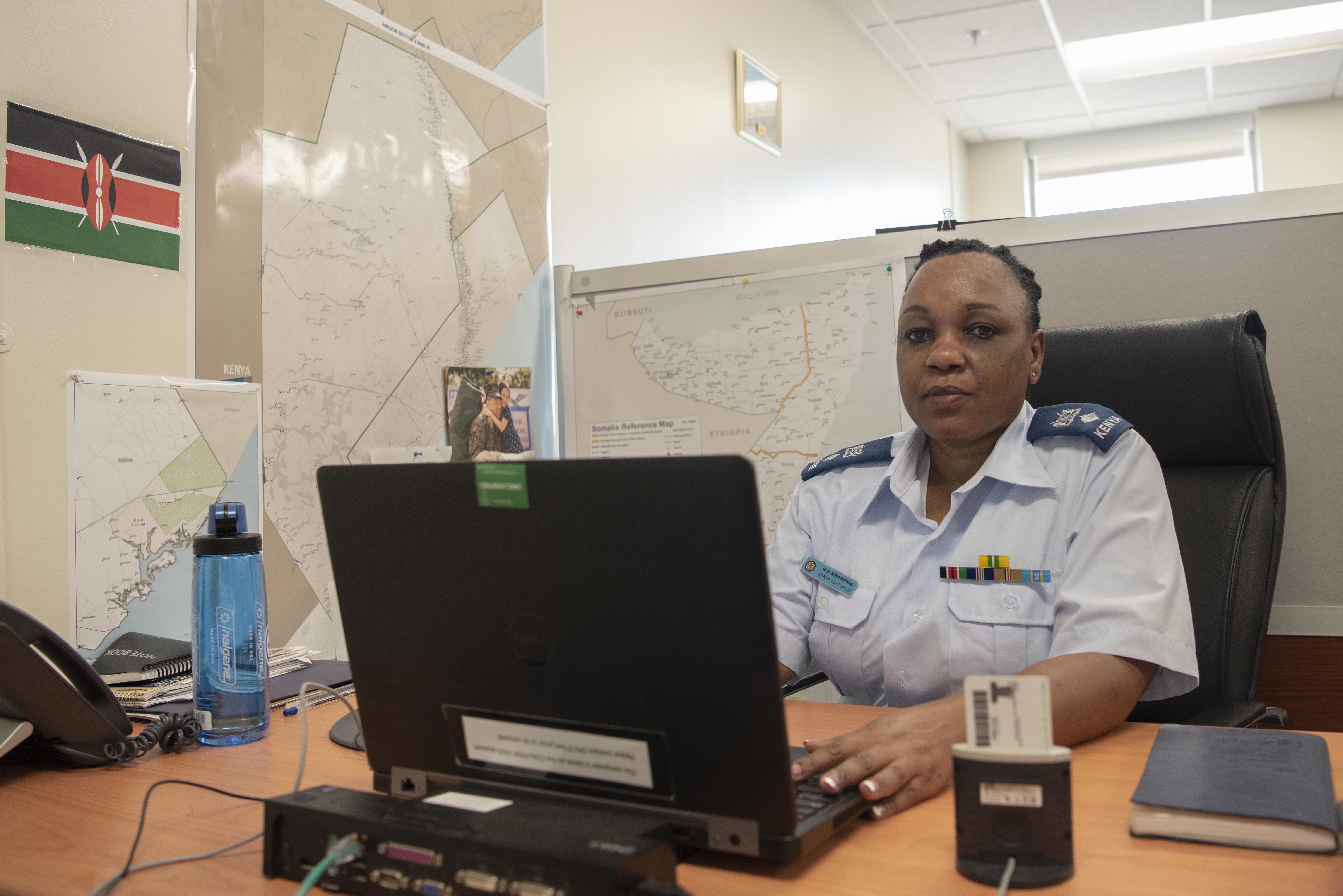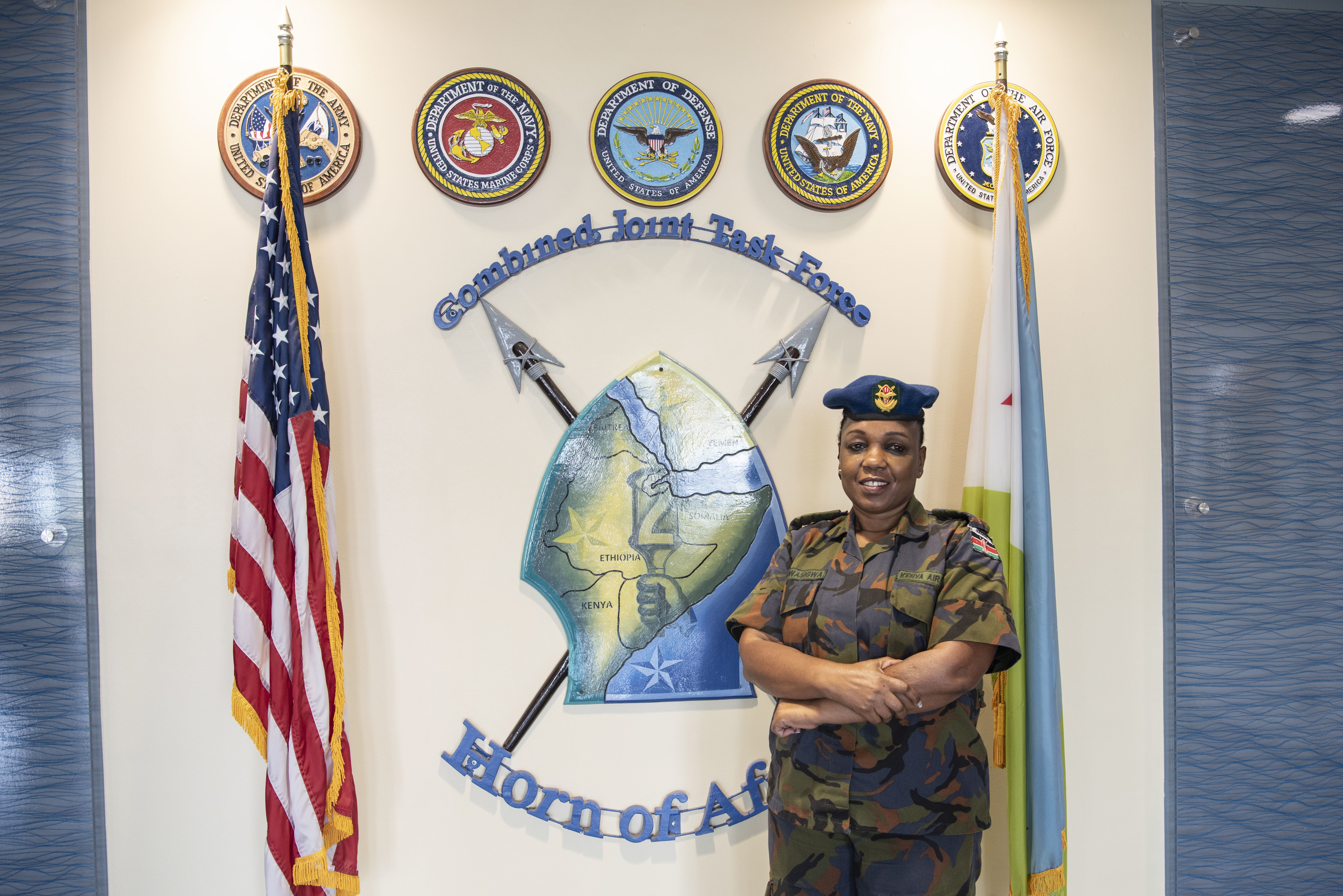 “My roles as a FLO are to facilitate timely and accurate communication between CJTF-HOA and Kenya Defense Forces (KDF), assist in the organization of key leadership engagements, and facilitate subject matter expert exchanges and participation in multinational exercises in East Africa,” said Kenya Air Force Lt. Col. Rodah Mwasigwa, KDF FLO. “I also liaise between KDF headquarters and CJTF-HOA on matters pertaining to operations and training, brief Joint Task Force headquarters on activities within Kenya or the African Union Mission to Somalia’s (AMISOM) area of responsibility, and liaise with coalition partners and nations represented at CJTF-HOA for a seamless, accurate flow of information.”