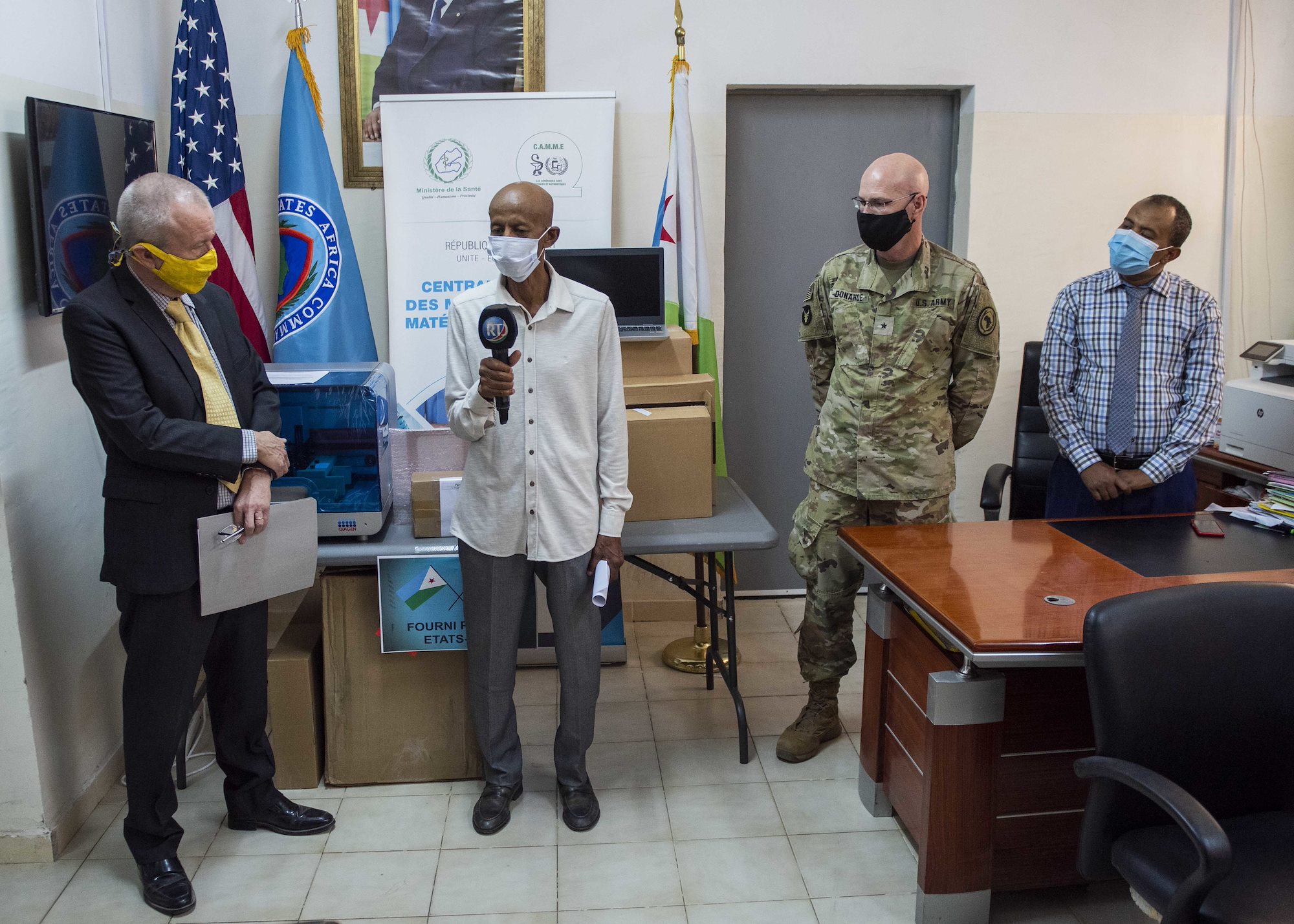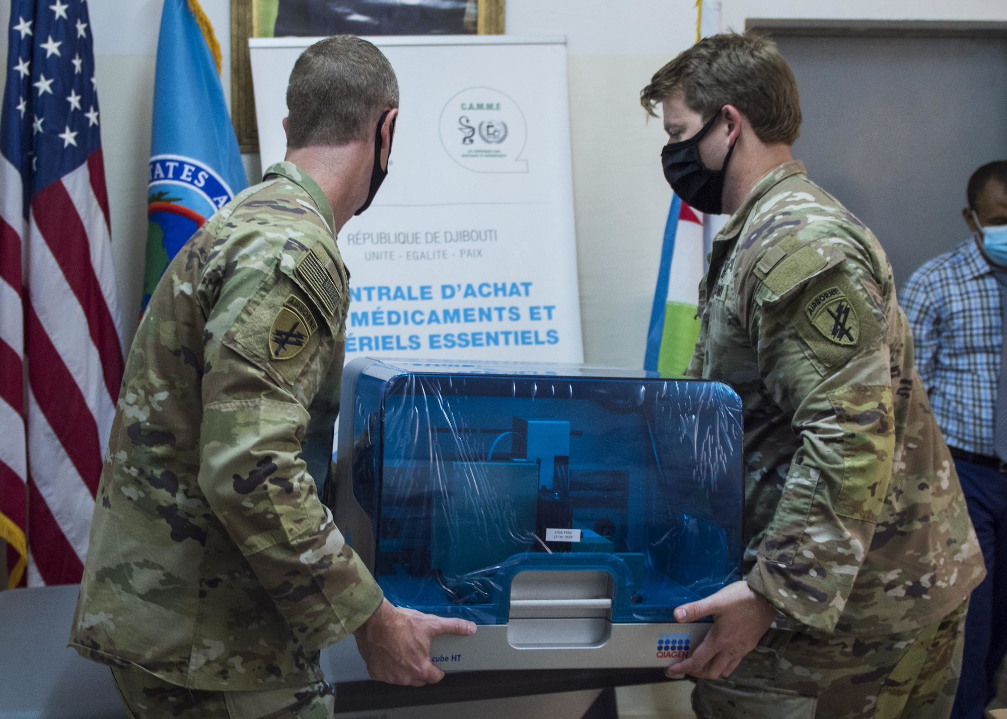 Personnel from Combined Joint Task Force-Horn of Africa (CJTF-HOA), the U.S. Department of State, United States Agency for International Development (USAID) and U.S. Africa Command (AFRICOM), presented the Djibouti Ministry of Health with a polymerase chain reaction (PCR) machine (also referred to as an "RNA extraction machine") during a ceremony in Djibouti City, Djibouti, Aug. 17, 2020.