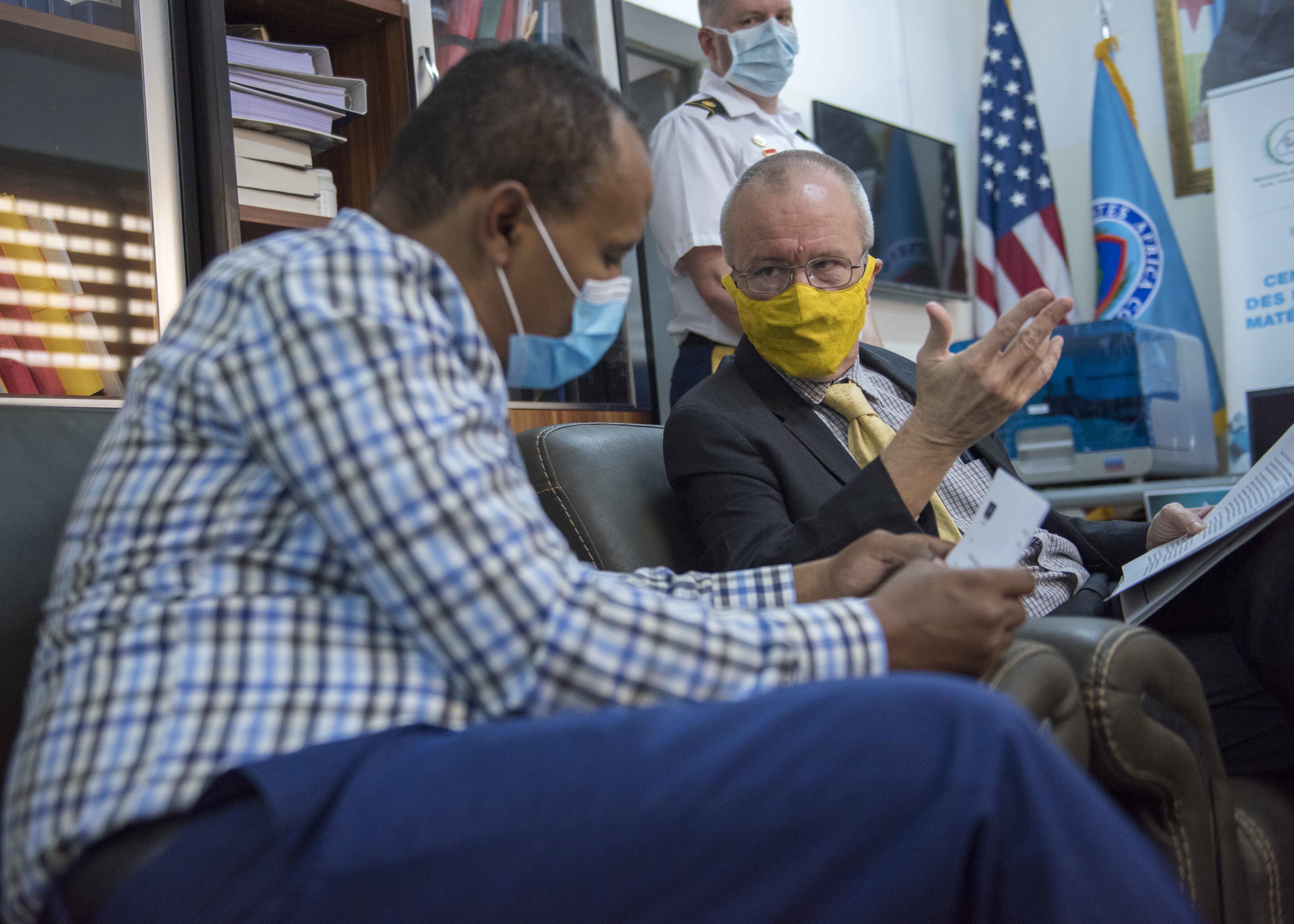 Larry E. André (right), U.S. Ambassador to Djibouti, speaks with Dr. Ahmed Houssein Miguil (left), director general of central purchasing of materials and essential medicines, during the transfer of a polymerase chain reaction (PCR) machine, which is used to test for pathogens like the COVID-19 virus, during a ceremony held at the ministry’s Central Purchasing of Materials and Essential Medicines facility in Djibouti City, Djibouti, Aug. 17, 2020. Combined Joint Task Force-Horn of Africa (CJTF-HOA) purchased the equipment on behalf of the United States using Overseas Humanitarian, Disaster Assistance, and Civic Aid (OHDACA) funds for approximately $76,000, following a request for aid from the Djiboutian government earlier this year. In total, CJTF-HOA has facilitated nearly $300,000 worth of U.S. aid to the government of Djibouti, including hygiene kits, 95 hospital beds, PPE and hand sanitizer among other supplies and equipment. (U.S. Air Force photo by Senior Airman Dylan Murakami)