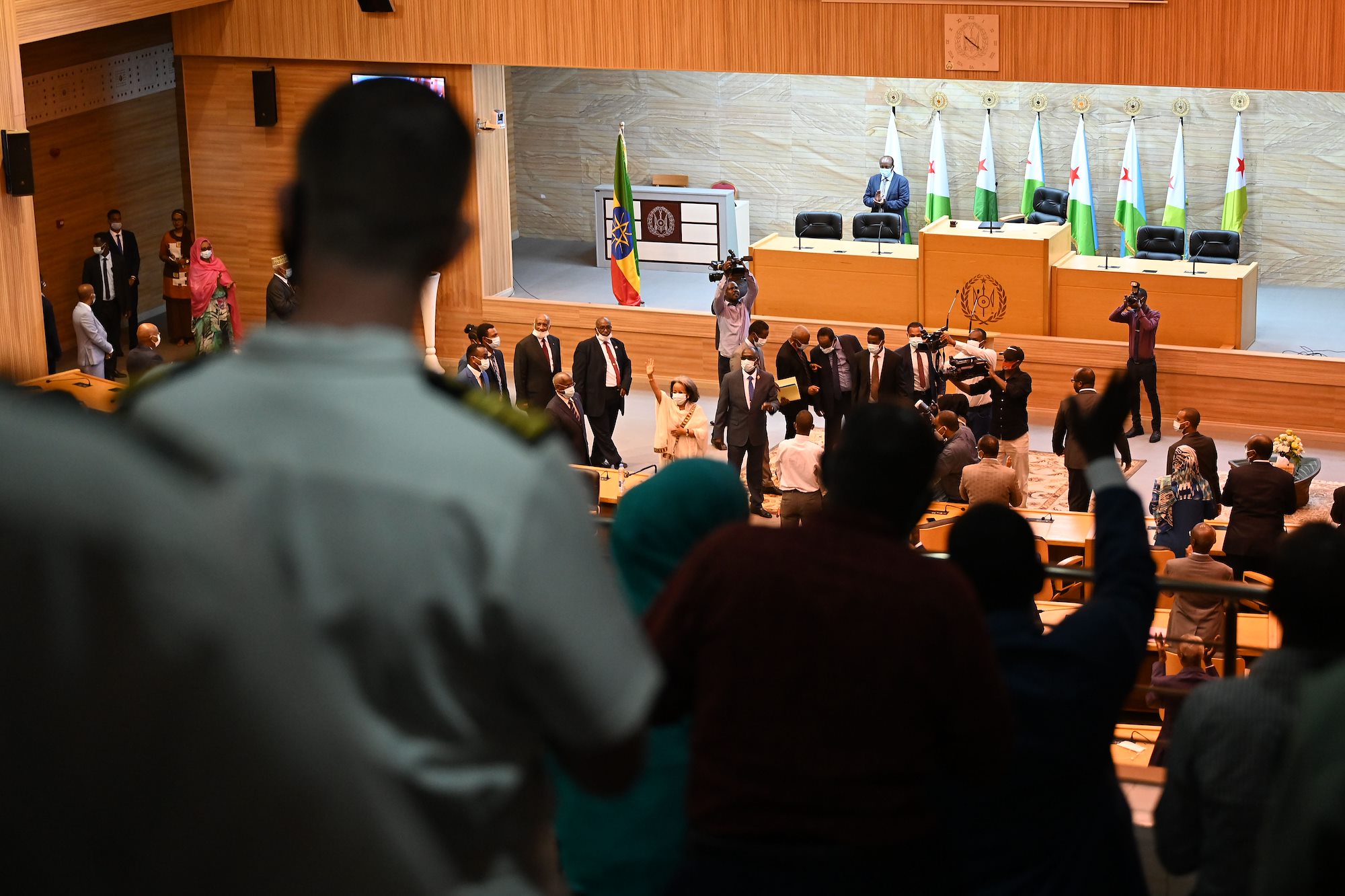 U.S. Army Maj. Gen. Lapthe C. Flora, commanding general, Combined Joint Task Force-Horn of Africa (CJTF-HOA), Rolf Olson, foreign policy advisor, CJTF-HOA and U.S. Navy Command Master Chief Alex Hebert, senior enlisted leader, CJTF-HOA, attended an event where Madam Sahle-Work Zewde, President of the Federal Democratic Republic of Ethiopia addressed the National Assembly, in Djibouti, Africa, Nov. 30, 2020.