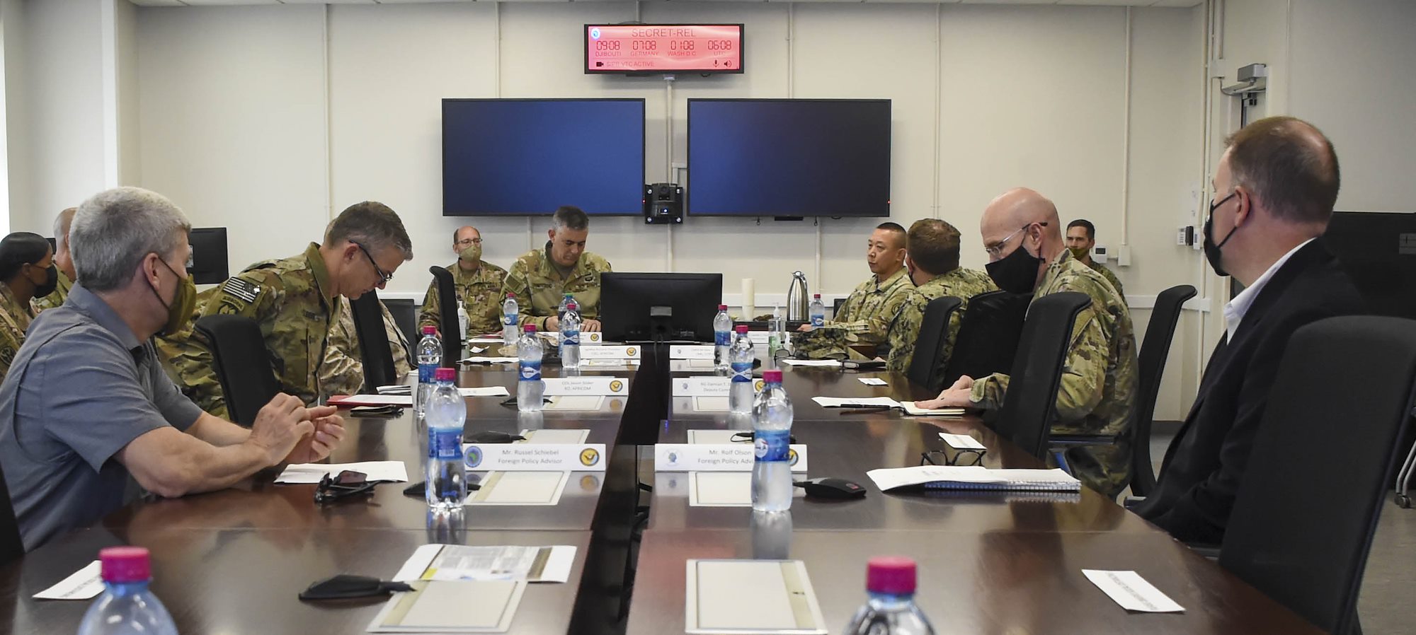 U.S. Army Gen. Stephen Townsend, commanding general, Africa Command (AFRICOM) and U.S. Army Maj. Gen. Lapthe Flora, commanding general, Combined Joint Task Force – Horn of Africa (CJTF-HOA), hold a meeting at the CJTF-HOA headquarters, Dec. 17, 2020, at Camp Lemonnier, Djibouti. The meeting gave the CJTF-HOA staff an opportunity to update Townsend on current and future mission operations. (U.S. Air Force photo by Senior Airman Kristin Savage)