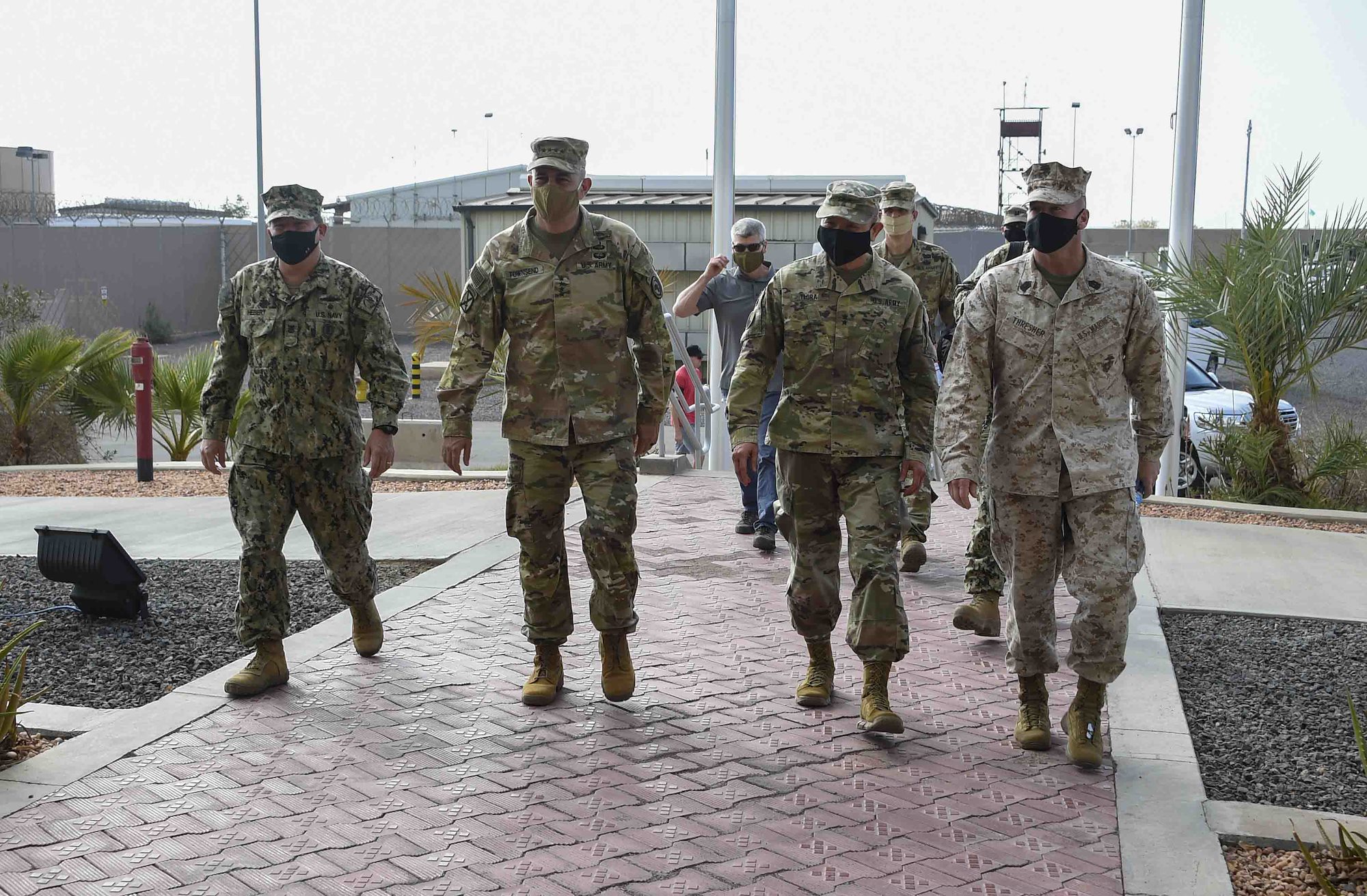U.S. Army Gen. Stephen Townsend, commanding general, Africa Command (AFRICOM), U.S. Army Maj. Gen. Lapthe Flora, commanding general, Combined Joint Task Force – Horn of Africa (CJTF-HOA), U.S. Marine Corps Sgt. Major Richard Thresher, command senior enlisted leader, AFRICOM, and U.S. Navy Command Master Chief Petty Officer Alex Hebert, command senior enlisted leader, CJTF-HOA, arrive at the CJTF-HOA headquarters building, Dec. 17, 2020, at Camp Lemonnier, Djibouti. Townsend visited various sections at Camp Lemonnier and saw how they each contributed to the overall mission. (U.S. Air Force photo by Senior Airman Kristin Savage)
