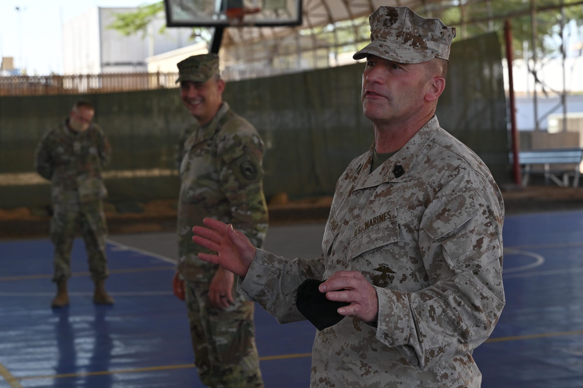U.S. Marine Corps Sgt. Maj. Richard Thresher, command senior enlisted leader, Africa Command (AFRICOM), speaks to service members during his trip to East Africa at Camp Lemonnier, Djibouti, Dec. 17, 2020. The trip provided an opportunity for Thresher to engage with Kenya Defense Force senior enlisted leadership, visit their enlisted academy and review the curriculum, in an effort to continue to strengthen the KDF’s enlisted corps. (U.S. Air Force photo by Tech. Sgt. Dana J. Cable)