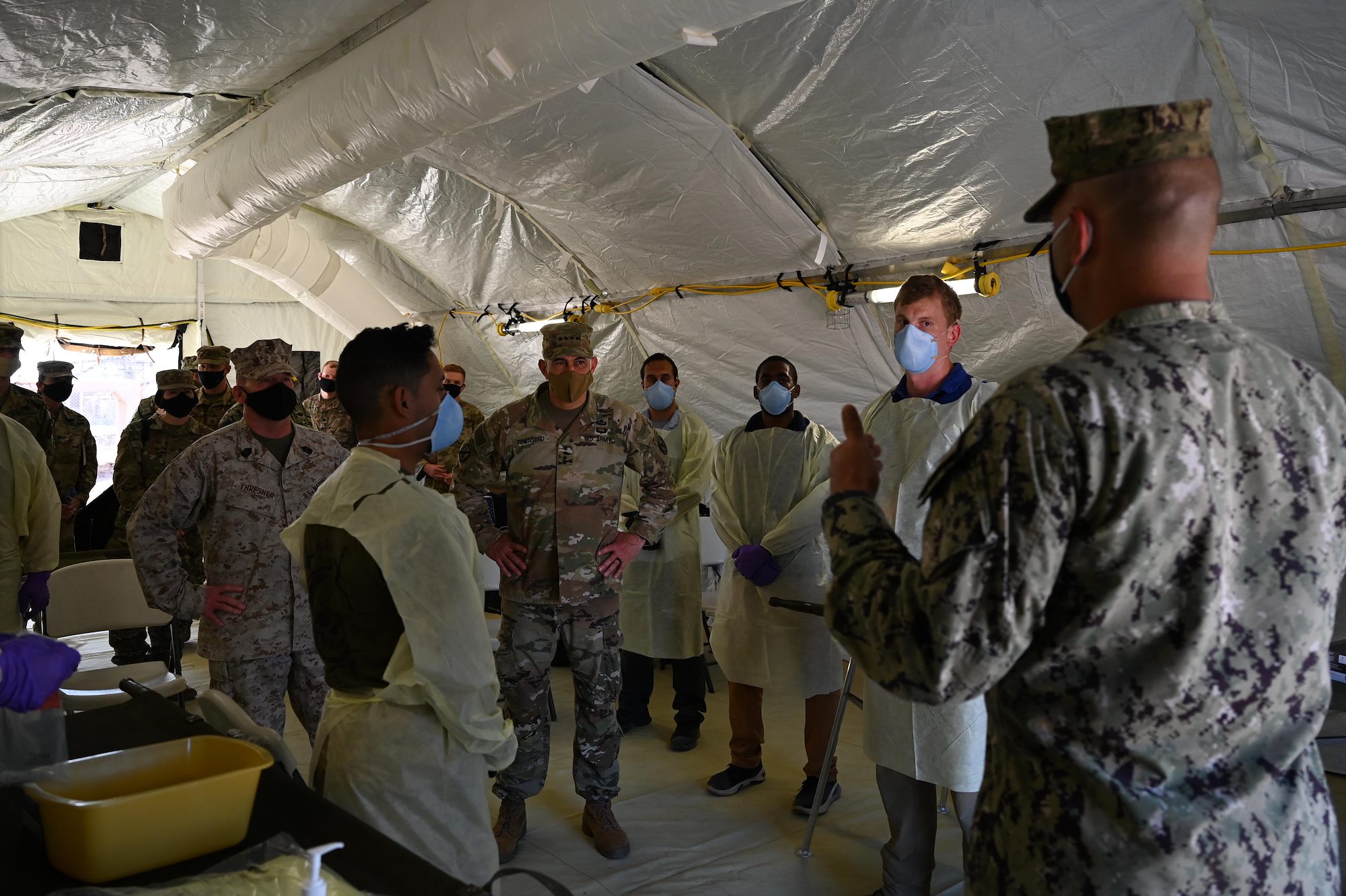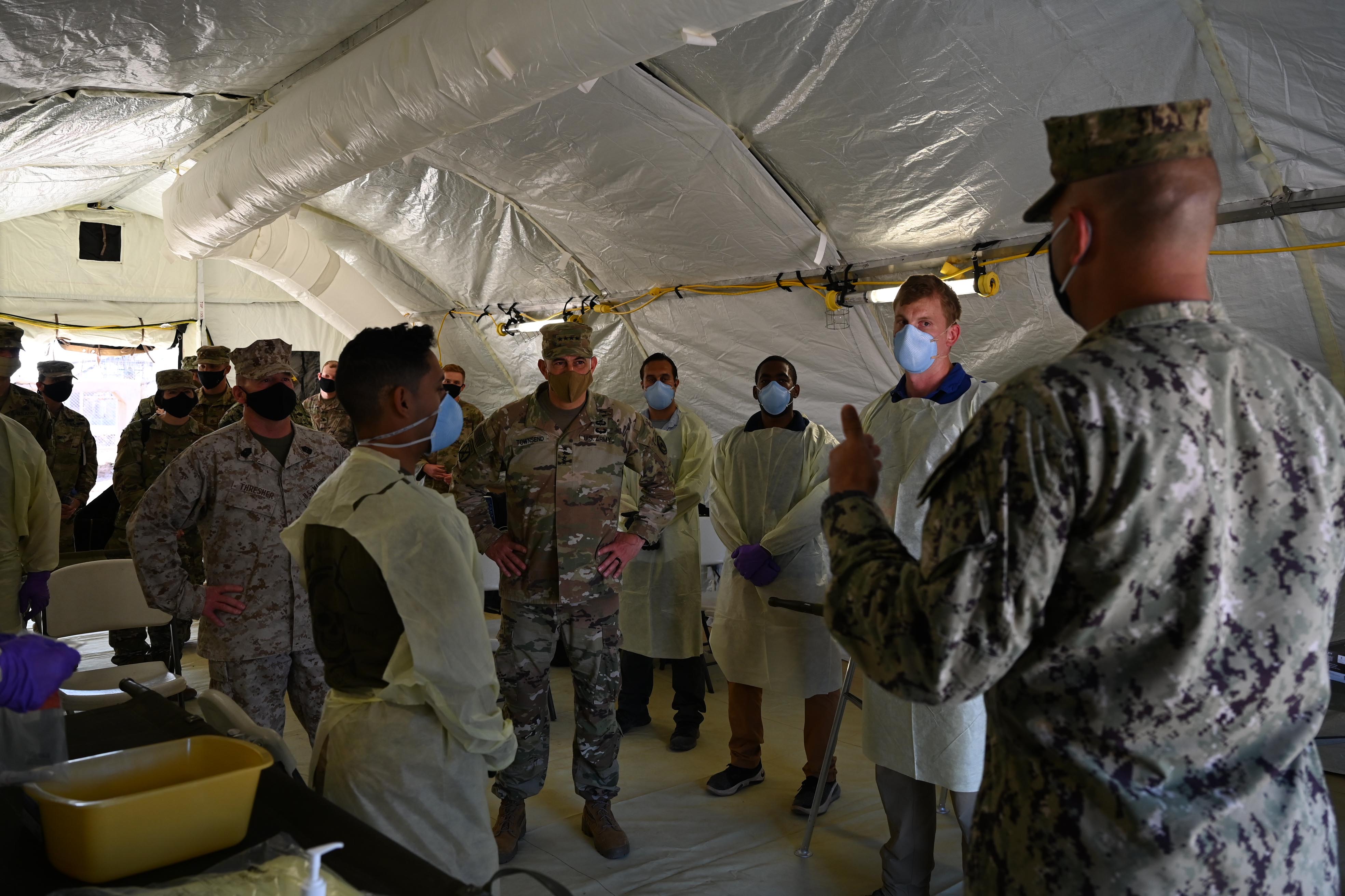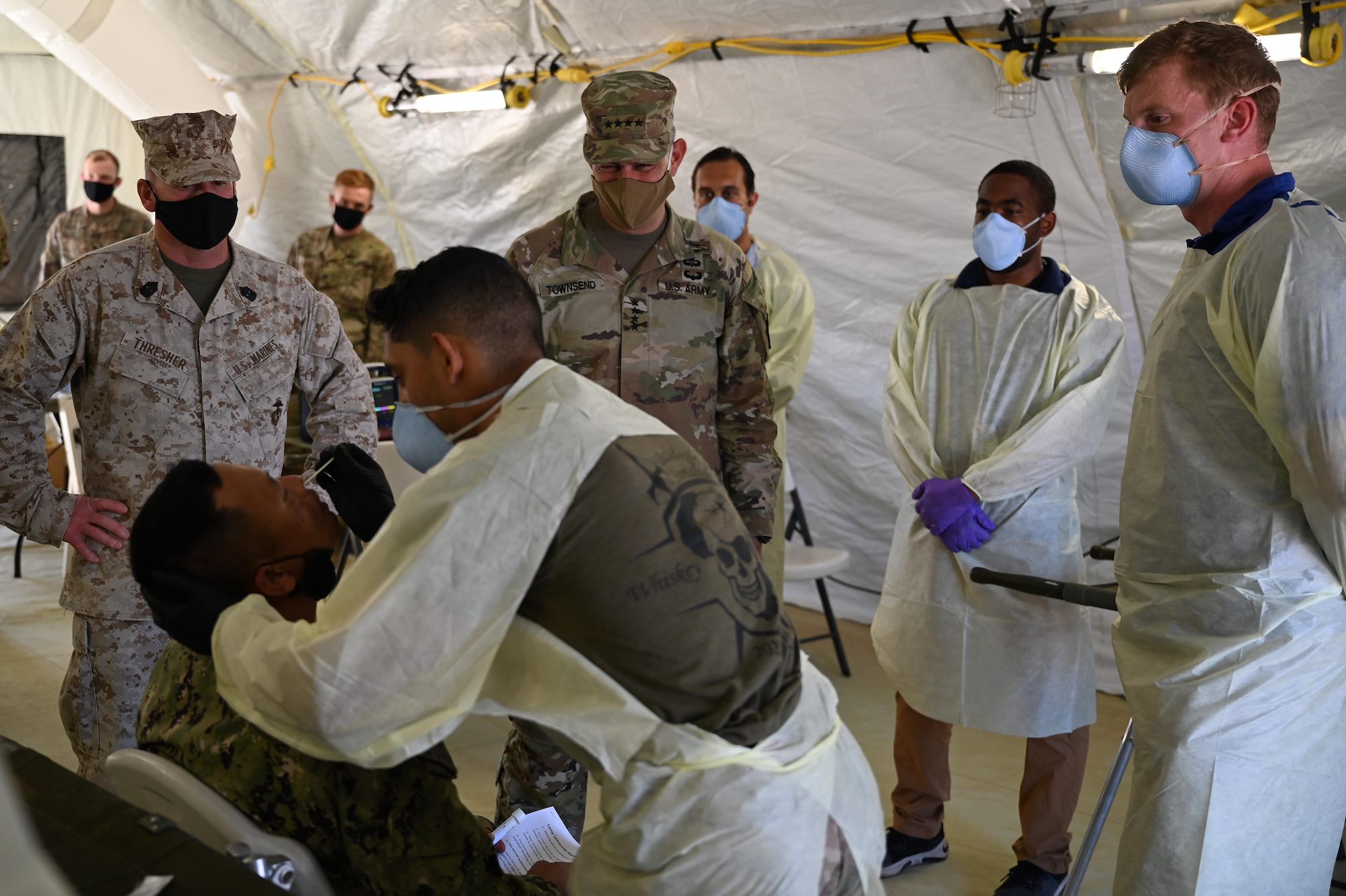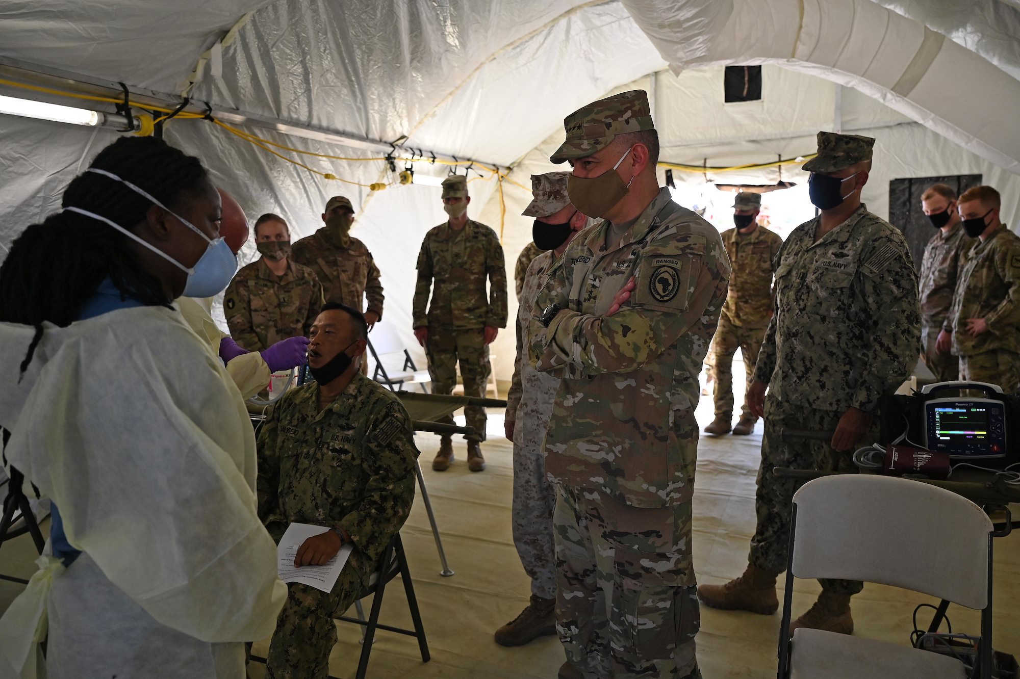 U.S. Army Gen. Stephen Townsend, commander, Africa Command (AFRICOM), and U.S. Marine Corps Sgt. Maj. Richard Thresher, command senior enlisted leader, AFRICOM, walk through a COVID screening demonstration at Camp Lemonnier, Djibouti, Dec. 17, 2020. Townsend completed a four-day trip to Kenya and Djibouti to conduct strategic engagements with partner nation leadership, assess operations and security of U.S. force locations, and demonstrate continued commitment to working with African partners. (U.S Air Force photo by Tech. Sgt. Dana J. Cable)