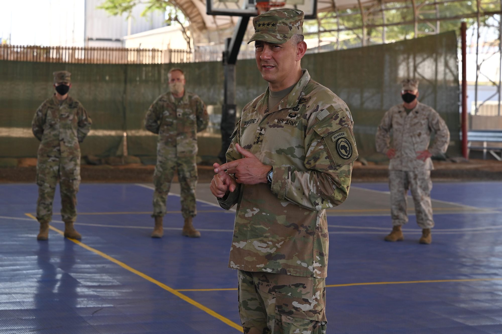 U.S. Army Gen. Stephen Townsend, commander, Africa Command (AFRICOM), speaks to service members during his trip to East Africa at Camp Lemonnier, Djibouti, Dec. 17, 2020. Townsend completed a four-day trip to Kenya and Djibouti to conduct strategic engagements with partner nation leadership, assess operations and security of U.S. force locations, and demonstrate continued commitment to working with African partners. (U.S Air Force photo by Tech. Sgt. Dana J. Cable)