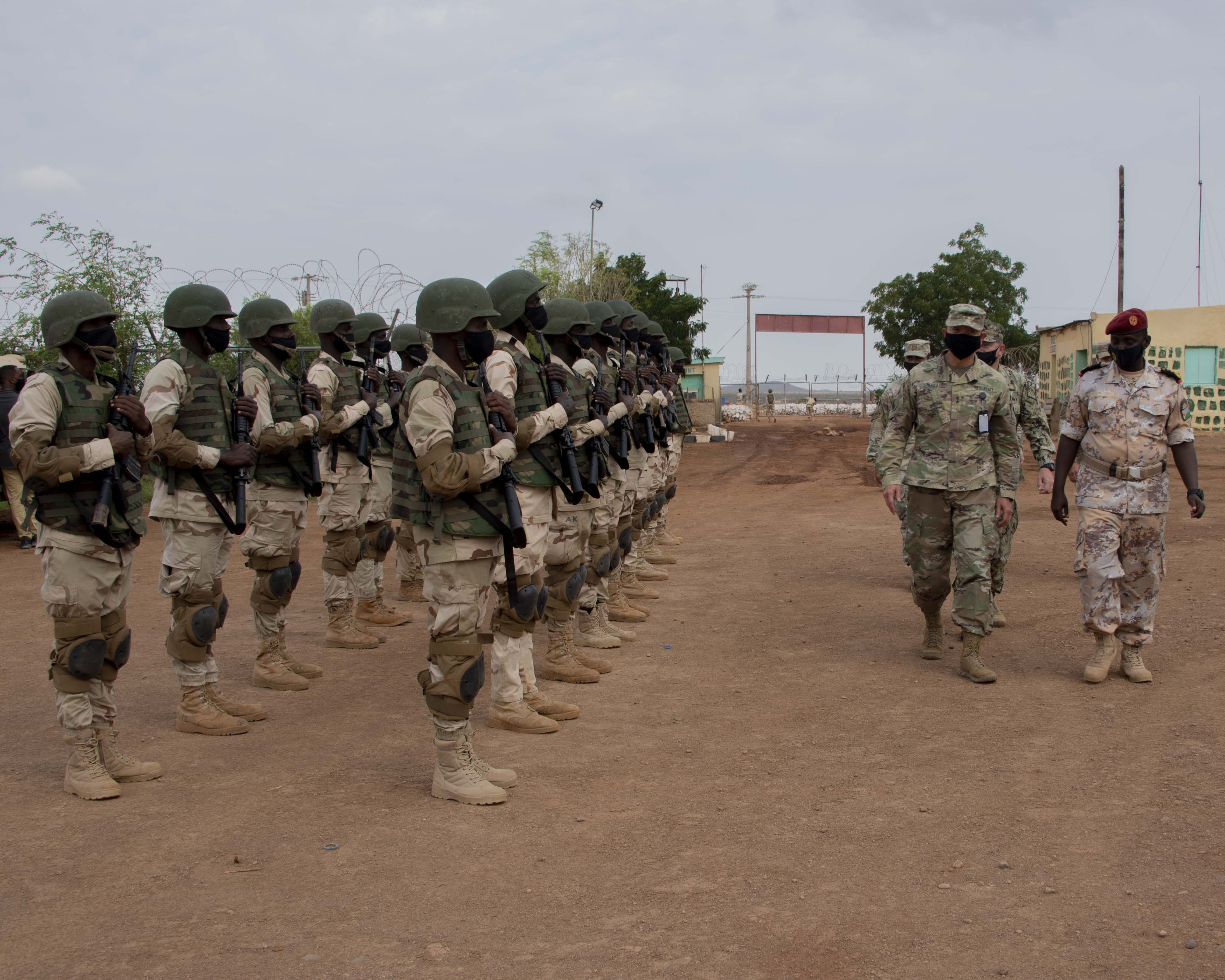 U.S. Army Maj. Gen. Lapthe Flora, commanding general, Combined Joint Task Force – Horn of Africa (CJTF-HOA), and Djiboutian Army Lt. Col. Mohamed Assoweh, commander, Battalion Intervention Rapide (BIR), inspect Djiboutian military members before a tour, Jan. 11, 2021, at an undisclosed location in East Africa. The Djiboutian soldiers greeted Flora when he arrived for a tour of their facilities. (U.S. Air Force photo by Senior Airman Kristin Savage)