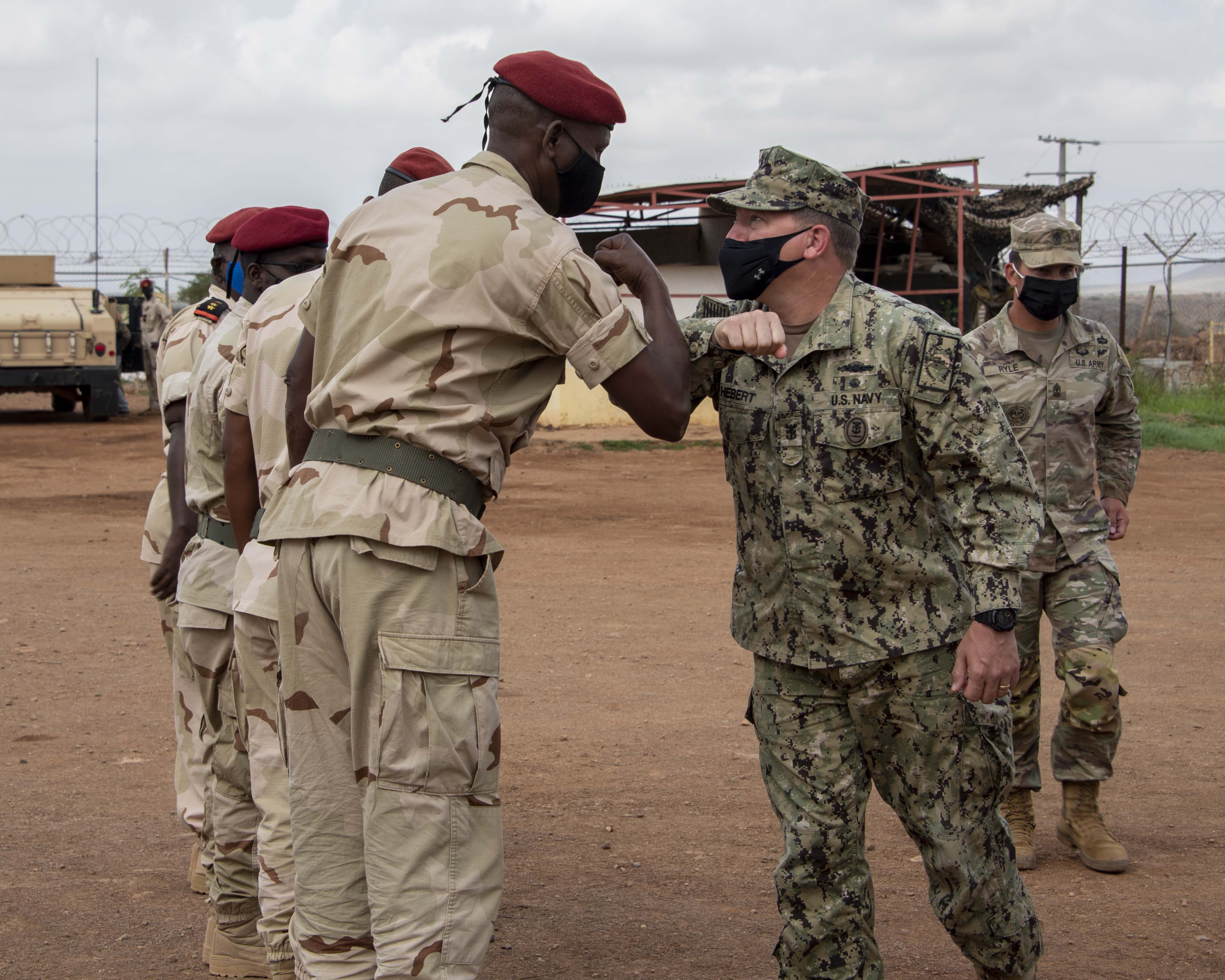 U.S. Navy Command Master Chief Alex Hebert, senior enlisted leader, Combined Joint Task Force – Horn of Africa (CJTF-HOA), greets Djiboutian soldiers during a tour of their facilities, Jan. 11, 2021, at an undisclosed location in East Africa. After meeting with senior leaders, Hebert and U.S. Army Maj. Gen. Lapthe Flora, commanding general, CJTF-HOA, toured the facilities and learned more about the on-going construction projects. (U.S. Air Force photo by Senior Airman Kristin Savage)