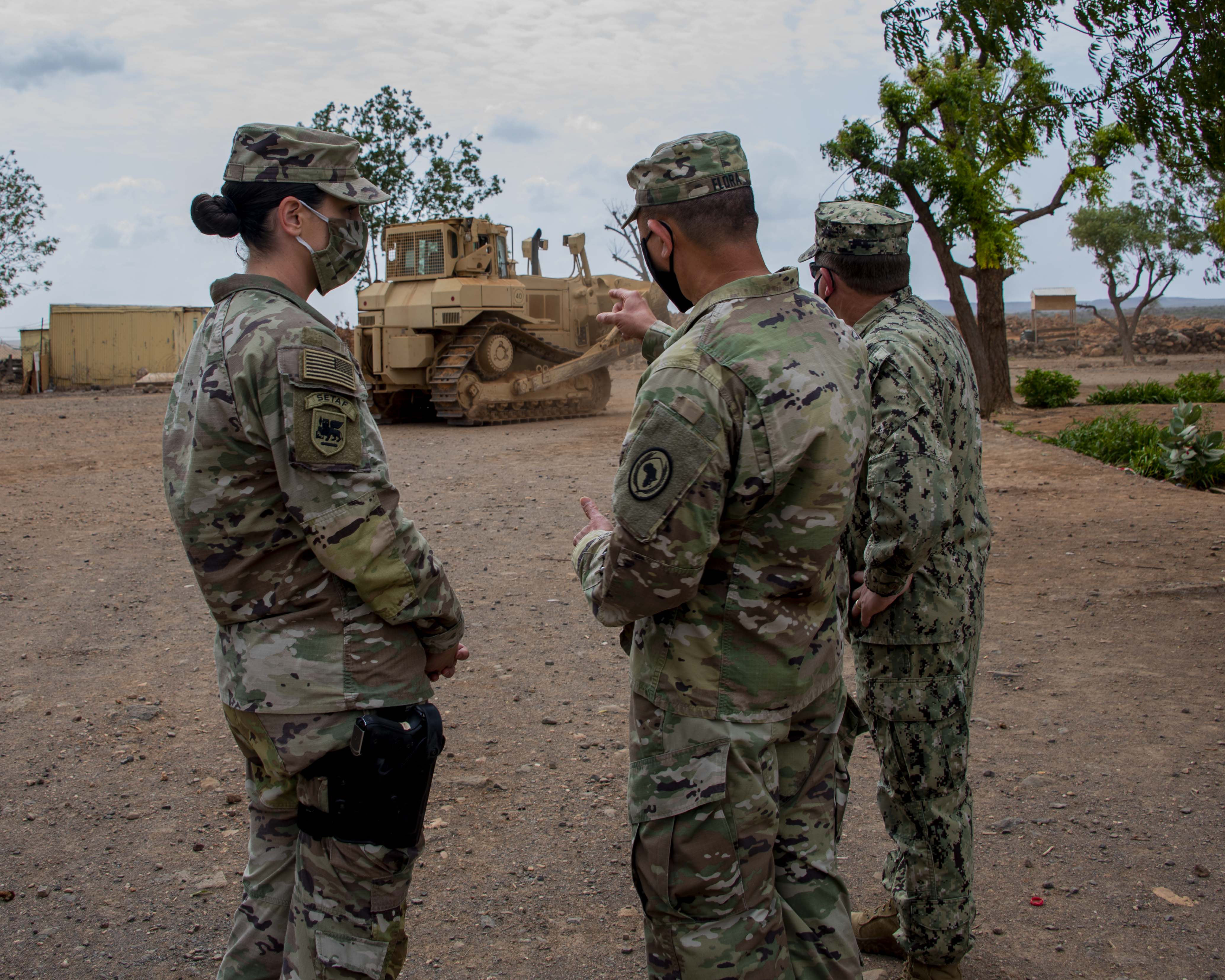 U.S. Army Maj. Gen. Lapthe Flora, commanding general, Combined Joint Task Force – Horn of Africa (CJTF-HOA), and U.S. Navy Command Chief Petty Officer Alex Hebert, senior enlisted leader, CJTF-HOA, talk with Capt. Candice Heins, commander, 760th Engineer Vertical Construction Company (EVCC), Jan. 11, 2021, at an undisclosed location in East Africa. Heins briefed the general on the improvements being made to the Djiboutian soldiers’ facilities. (U.S. Air Force photo by Senior Airman Kristin Savage)