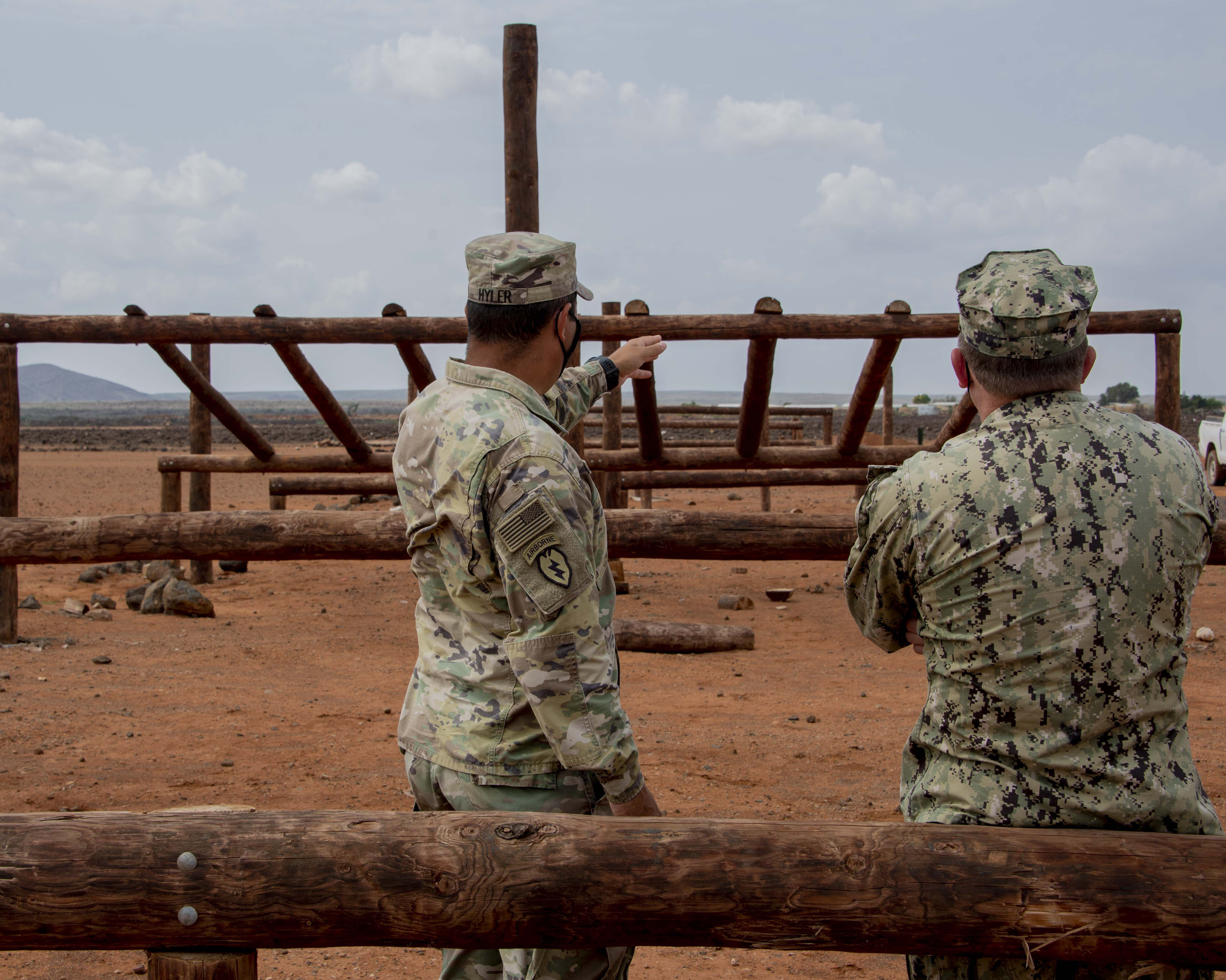U.S. Army Maj. Caleb Hyler, commander, Security Forces Assistance Brigade (SFAB), talks with U.S. Navy Command Chief Petty Officer Alex Hebert, senior enlisted leader, Combined Joint Task Force – Horn of Africa (CJTF-HOA), about the construction of a new obstacle course, Jan. 11, 2021, at an undisclosed location in East Africa. When completed, Djiboutian soldiers will use the course for training and readiness purposes. (U.S. Air Force photo by Senior Airman Kristin Savage)