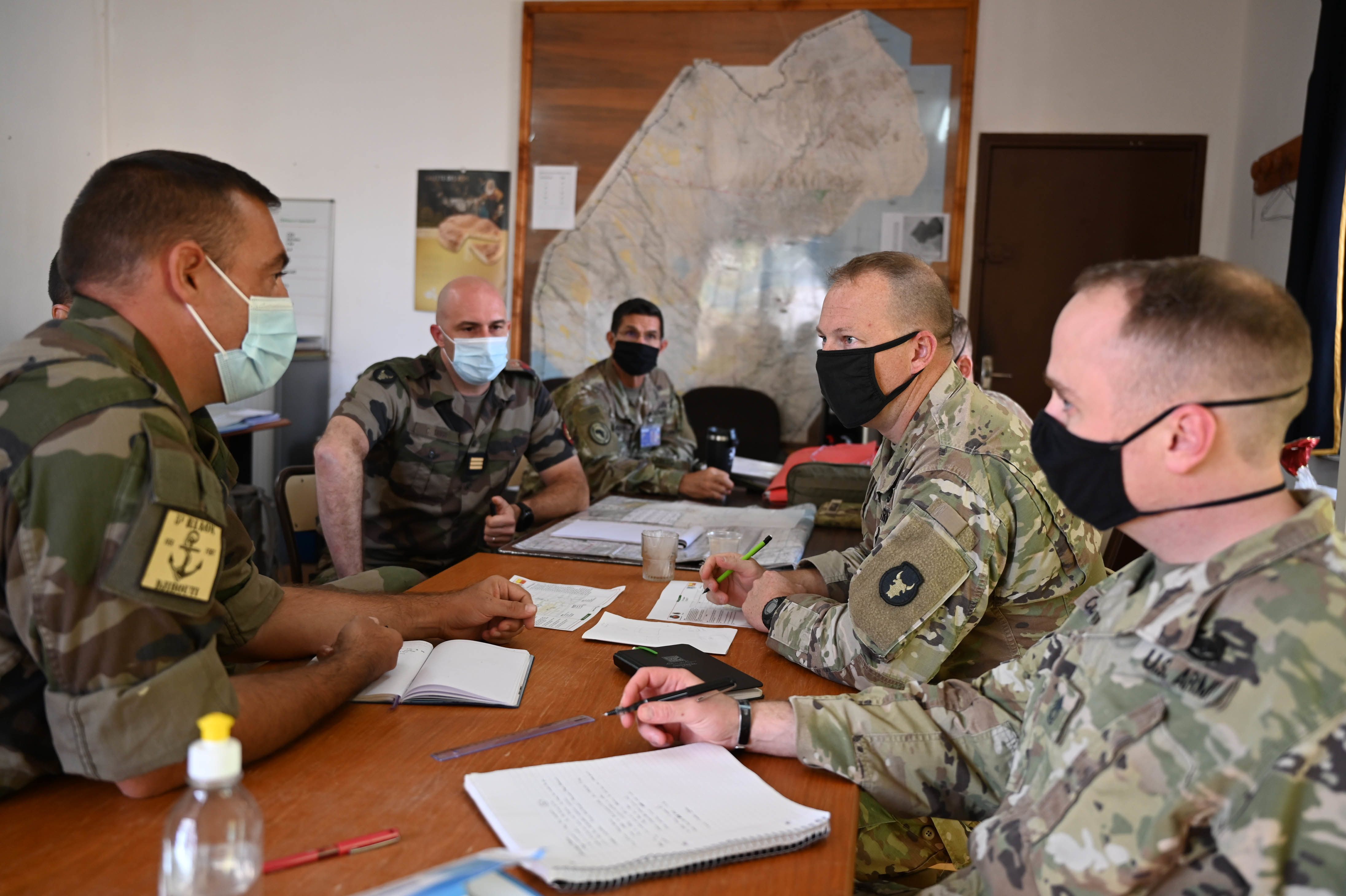U.S. Army Soldiers assigned to the East Africa Response Force (EARF) in support of the Combined Joint Task Force-Horn of Africa (CJTF-HOA) and French Soldiers assigned to the 5th Overseas Intermarines Regiment (RIAOM) begin planning a live-fire exercise at the French Army Base, Djibouti, Jan 4, 2021. The purpose of the joint training was to share French and U.S. Army artillery techniques and further the relationship between EARF Soldiers and the 5th RIAOM. (U.S. Air Force photo by Tech. Sgt. Dana J. Cable)