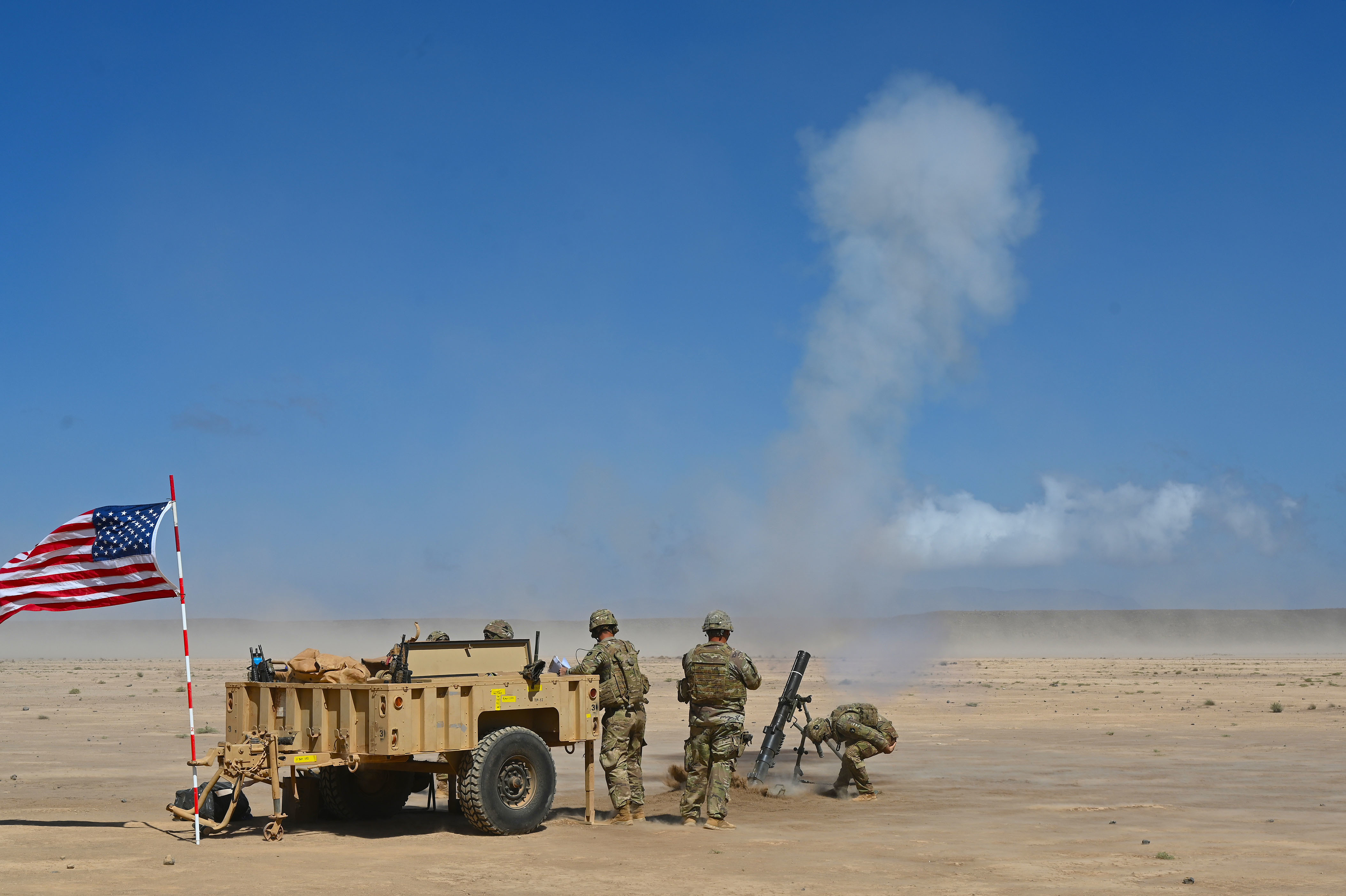 U.S. Army Soldiers assigned to the East Africa Response Force (EARF) in support of the Combined Joint Task Force-Horn of Africa (CJTF-HOA) and French Soldiers assigned to the 5th Overseas Intermarines Regiment (RIAOM) participate in a live-fire joint artillery training event at the Djiboutian Range Complex, Djibouti, Feb. 2, 2021. U.S. and French forces took turns firing their weapons systems and demonstrating their capabilities. (U.S. Air Force Photo by Senior Airman Kristin Savage)