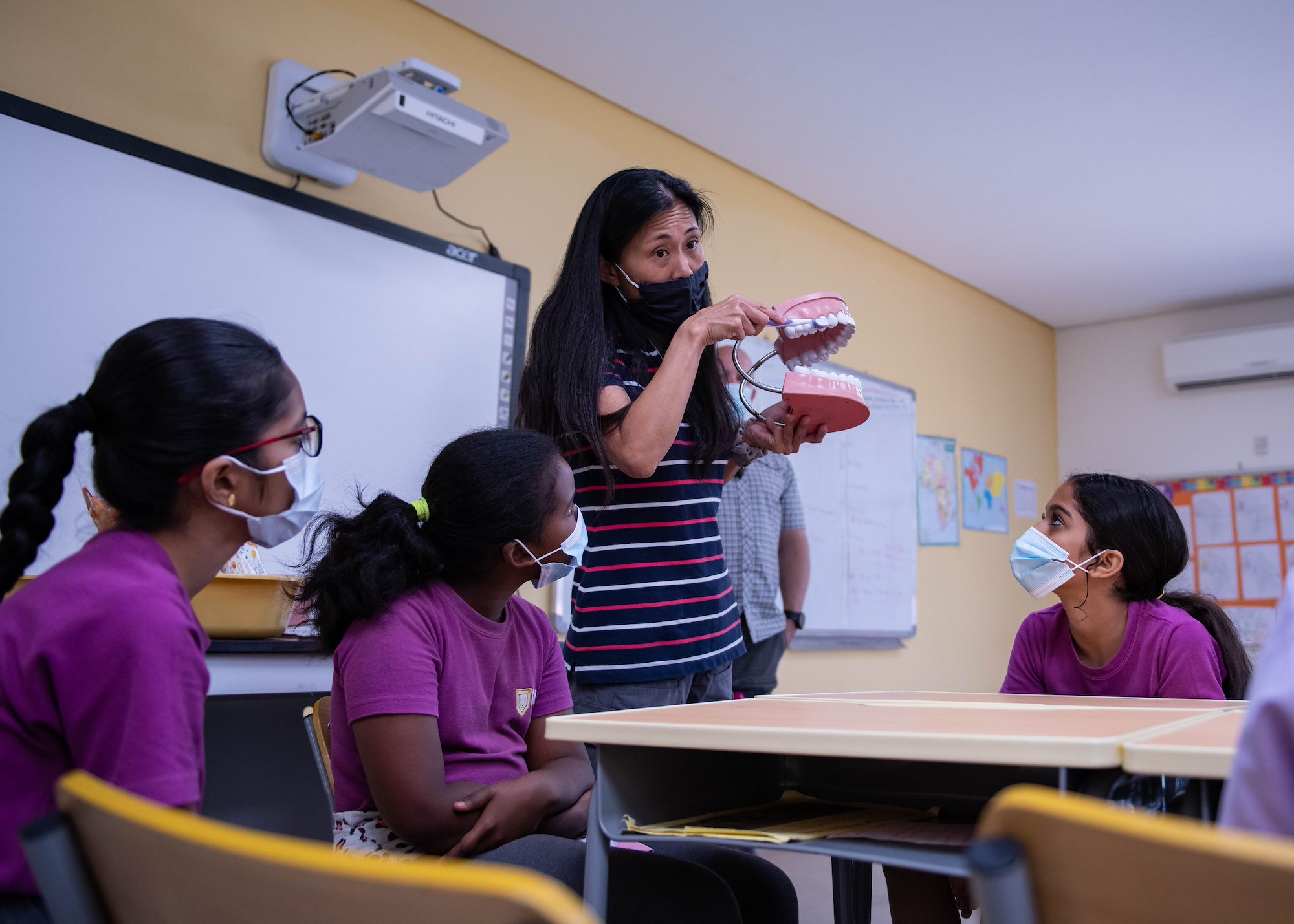 U.S. Army Maj. Sachiyo Kawaguchi, a dentist assigned to Civil Affairs East Africa Southern European Task Force Africa (CA-EA SETAF-AF) functional specialty team in support of Combined Joint Task Force-Horn of Africa (CJTF-HOA), shows children how to brush their teeth using a dental model at the International School of Africa, Arta, Djibouti, March 23, 2021. The CA-EA SETAF-AF team members collectively spoke to more than 70 children at the school, reinforcing the focus on preventative oral health care. (U.S. Air Force photo by Senior Airman Morgan L. Brown)