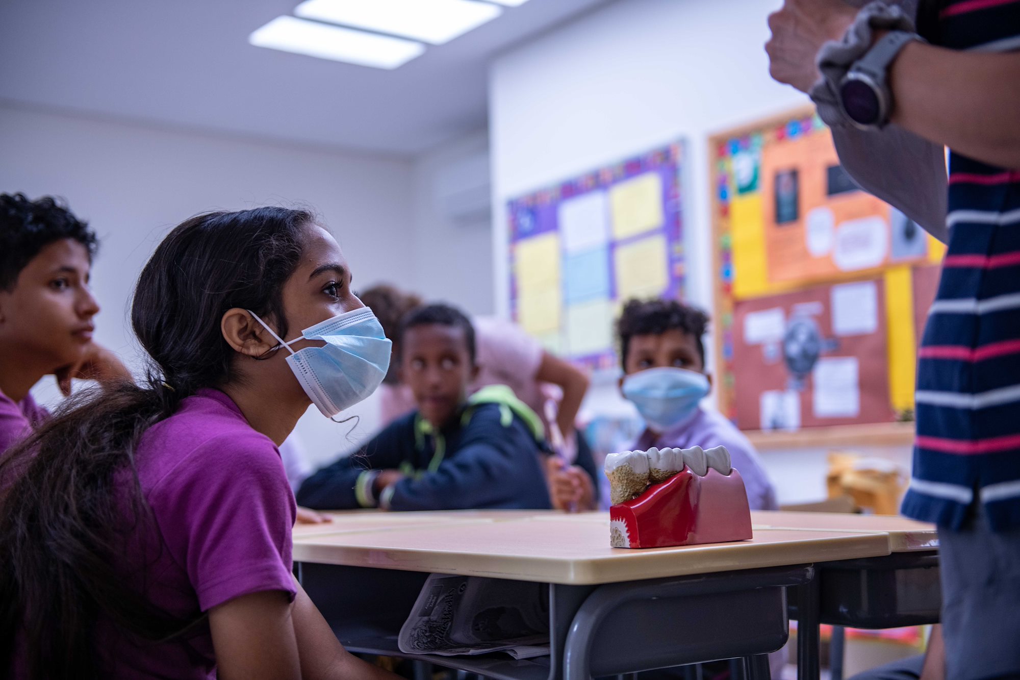 A student at the International School of Africa watches the preventative oral health care demonstration at Arta, Djibouti, March 23, 2021. With these demonstrations the Civil Affairs East Africa Southern European Task Force Africa (CA-EA SETAF-AF) functional specialty team, in support of Combined Joint Task Force-Horn of Africa (CJTF-HOA), is able to teach children the importance of oral health care starting at a young age. (U.S. Air Force photo by Senior Airman Morgan L. Brown)