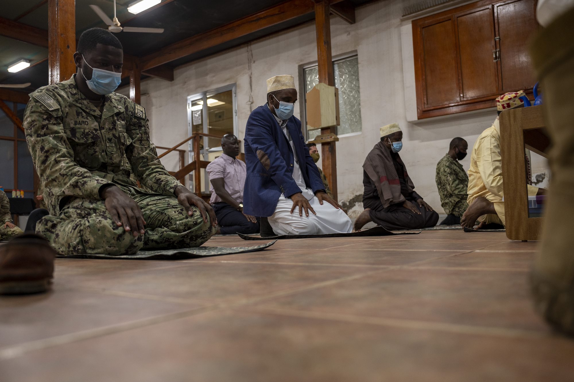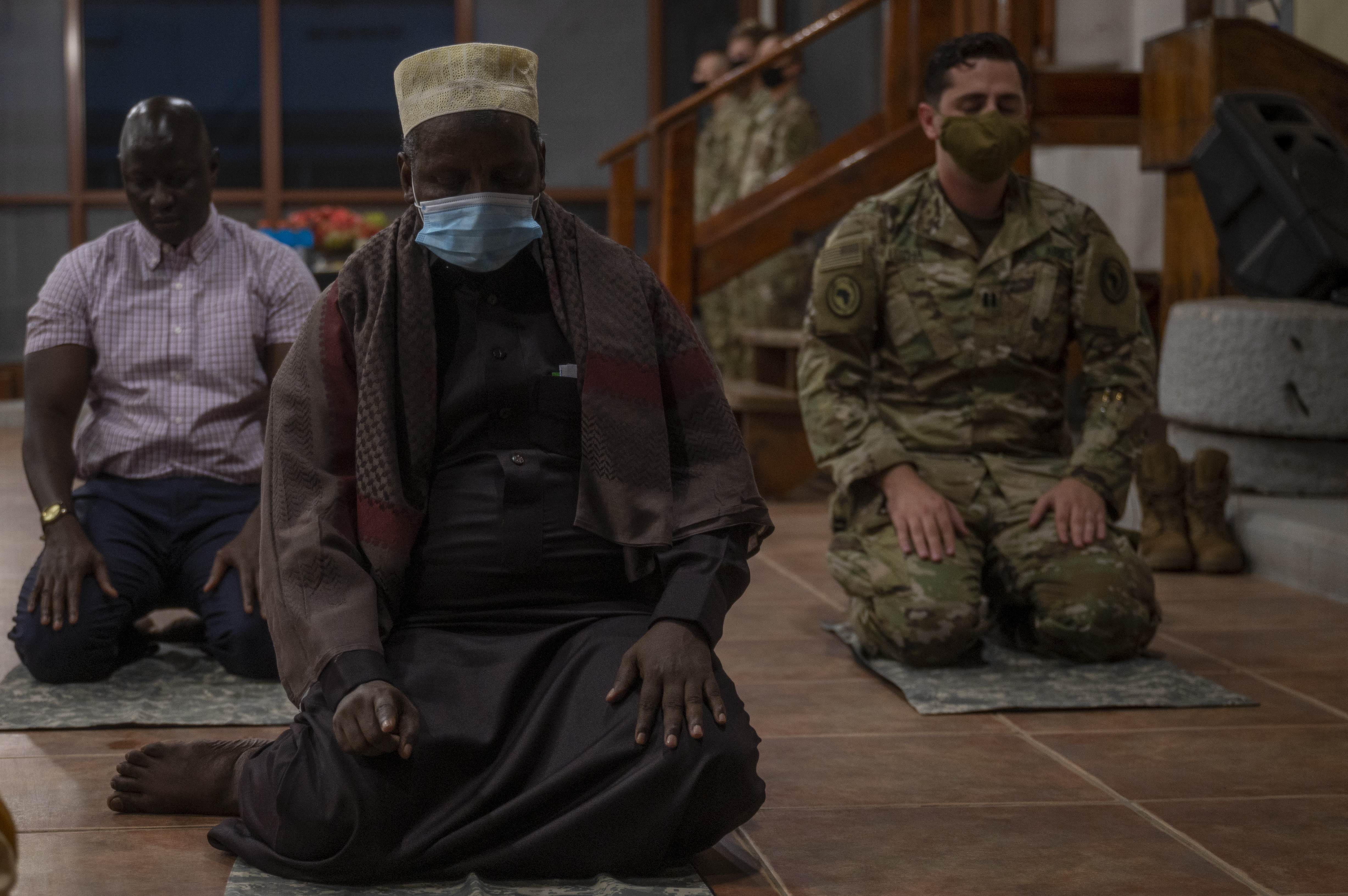 Members of Combined Joint Task Force-HOA participate in a prayer and Iftar alongside Hassan Ahmed Migane, Djiboutian Imam, to celebrate the end of Ramadan in Djibouti, April 28, 2021. The Iftar event provided an opportunity for key partners to come together in unity, build on existing relationships, and reaffirm the importance of cross-cultural understanding. (U.S. Air Force photo by: Staff Sgt. Daniel Garcia)