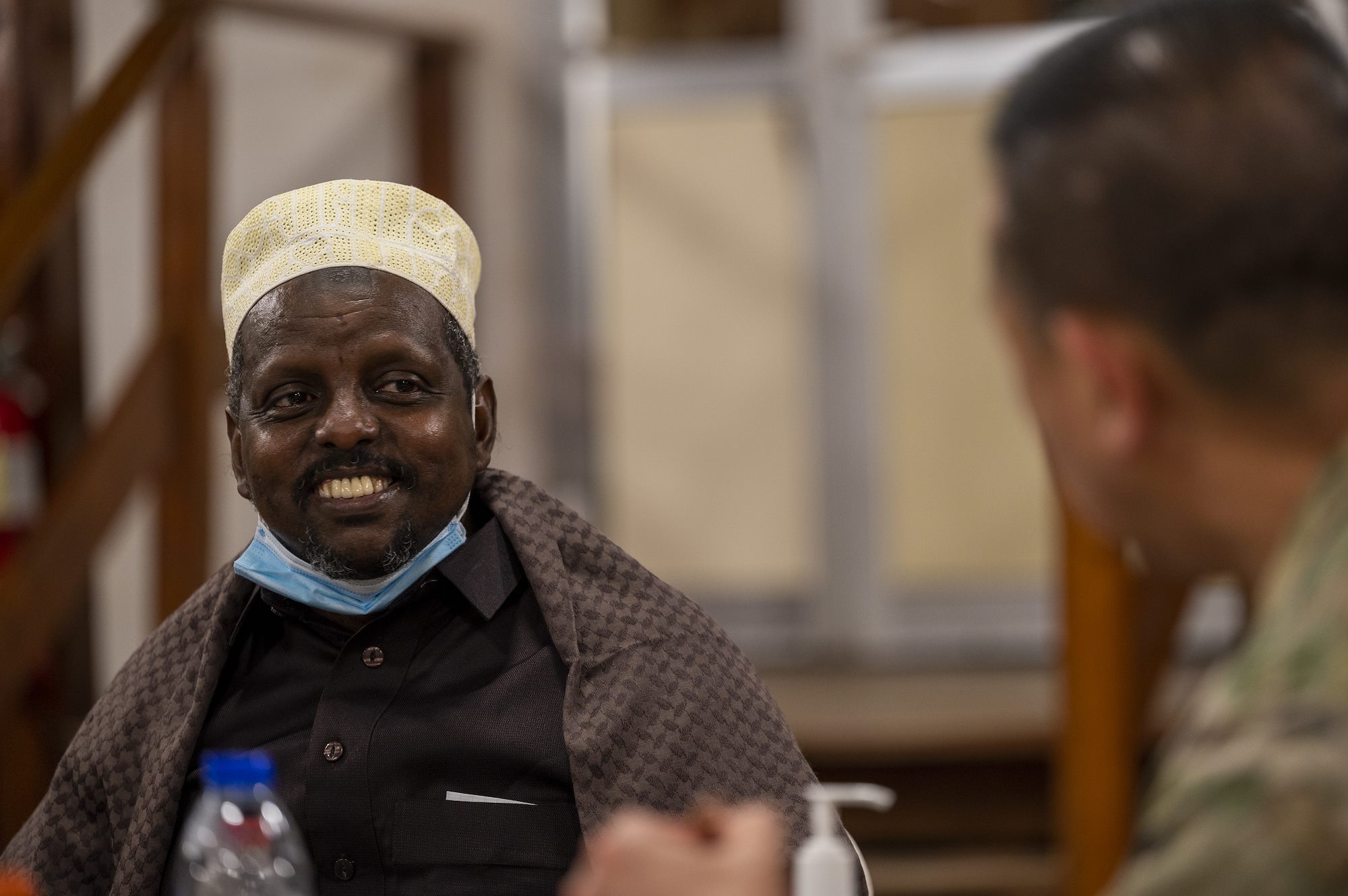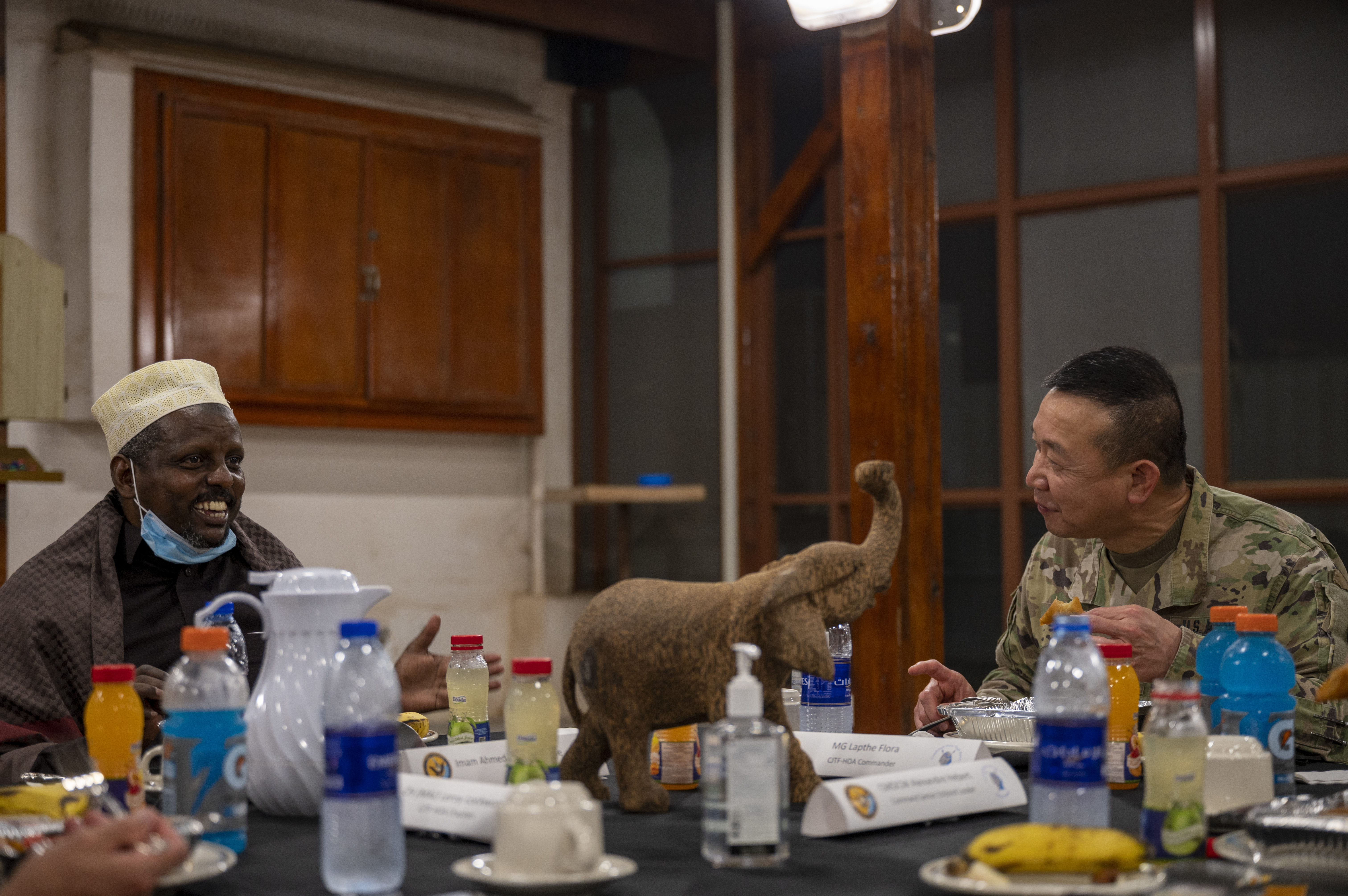 Hassan Ahmed Migane, Djiboutian Imam (left), enjoys the company of U.S. Army Maj. Gen. Lapthe C. Flora (right), commanding general, Combined Joint Task Force- Horn of Africa during an Iftar to celebrate the end of Ramadan in Djibouti, April 28, 2021. The Iftar event provided an opportunity for key partners to come together in unity, build on existing relationships, and reaffirm the importance of cross-cultural understanding. (U.S. Air Force photo by: Staff Sgt. Daniel Garcia)