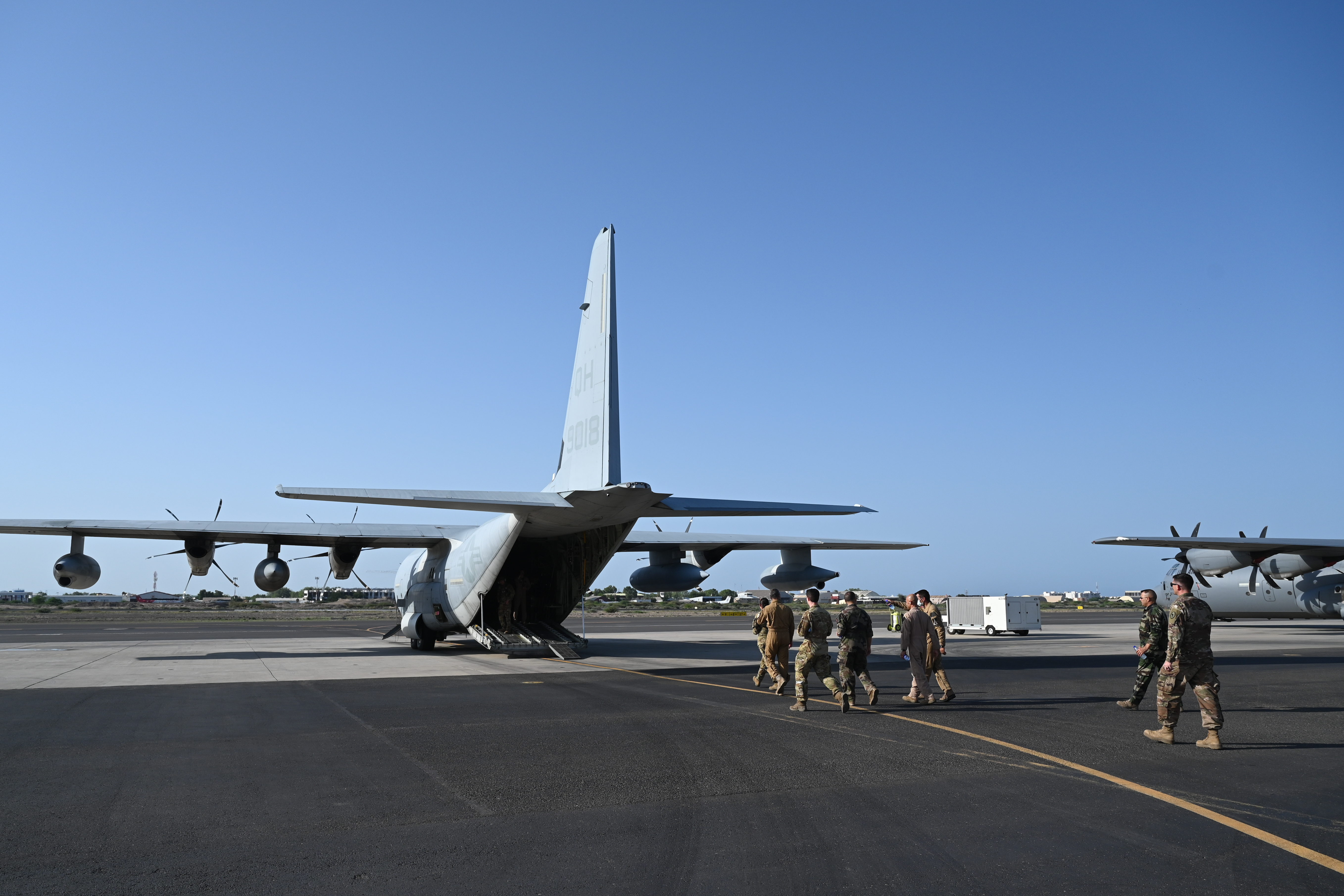 Combined Joint Task Force - Horn of Africa (CJTF-HOA) and French forces in Djibouti leadership fly on a U.S. Marine KC-130J Super Hercules at Camp Lemonnier, Djibouti, May 24, 2021. The partner forces conducted a joint interoperability training to enhance their capabilities and demonstrate their shared commitment to stability in the region. (U.S. Air Force photo by Staff Sgt. Missy Sterling)