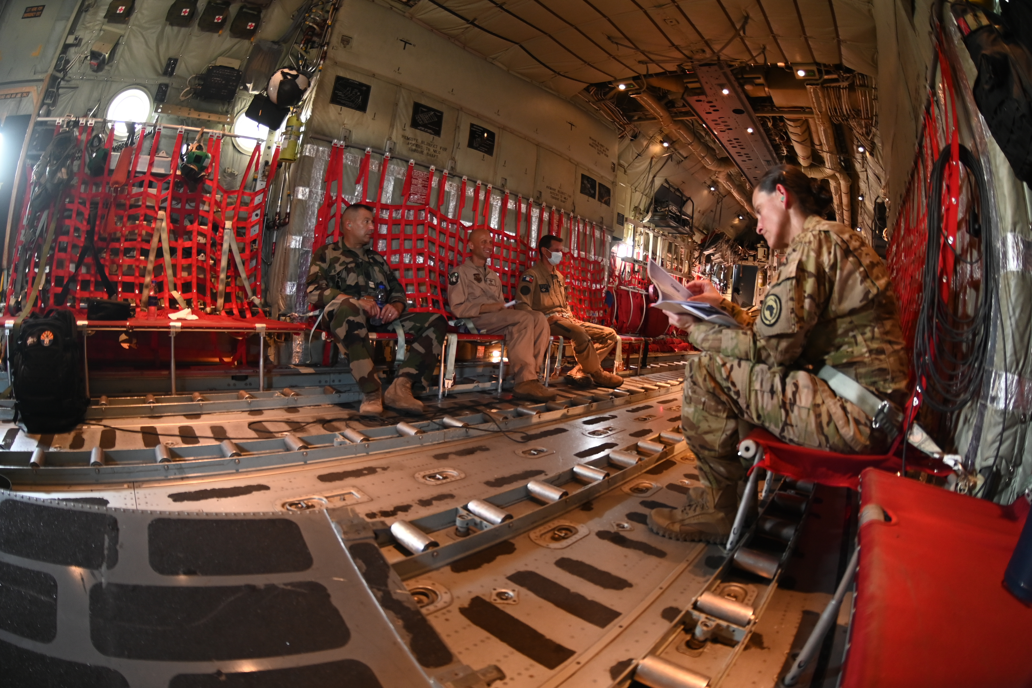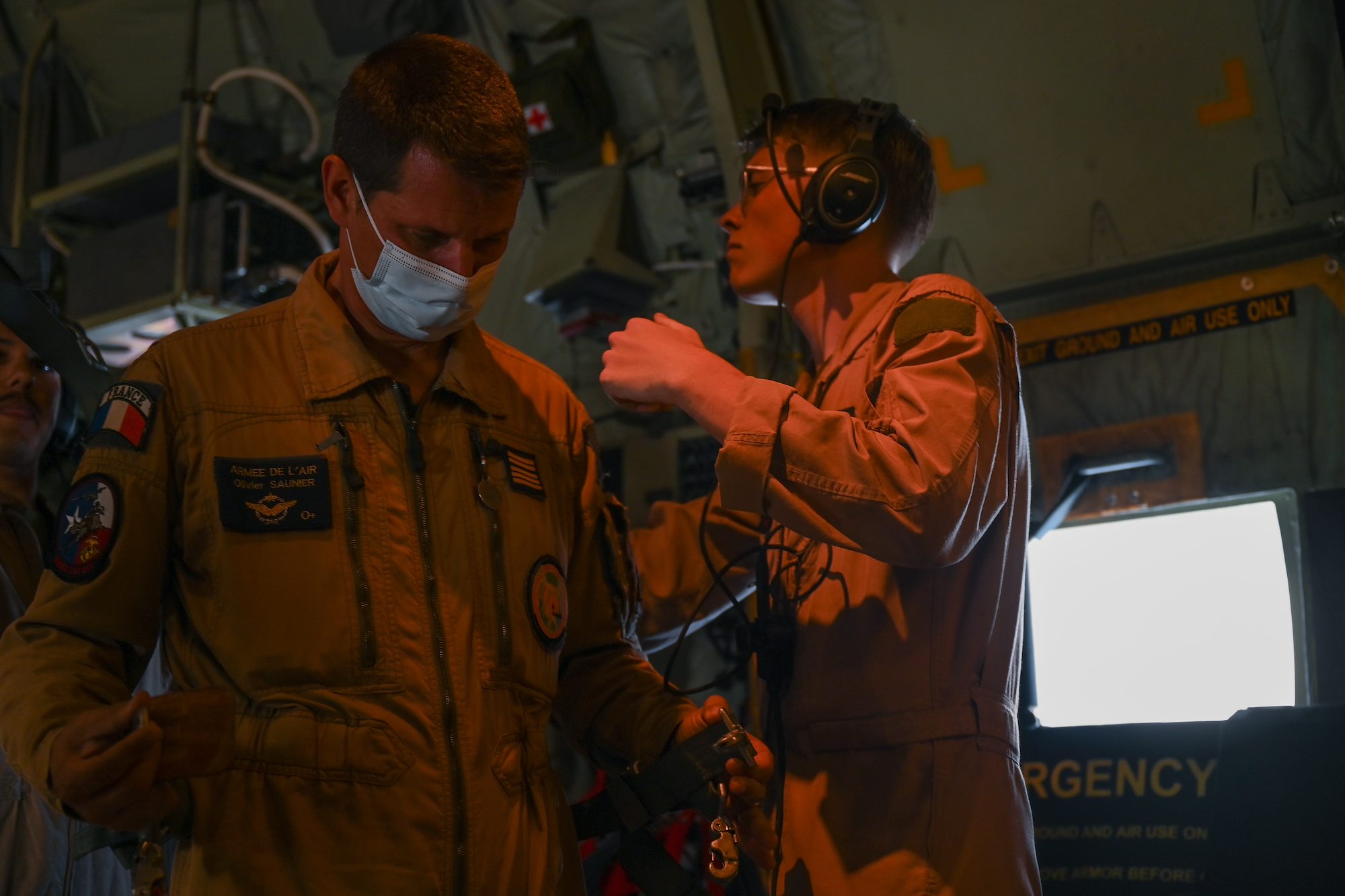 French Air Force Brig. Gen. Stéphane Dupont, center, the commander of French Forces in Djibouti (FFDJ), listens as U.S. Marine Cpl. Taylor Athey, a loadmaster with Marine Aerial Refueler Transport Squadron 234 (VMGR-234), describes how to don a harness aboard a KC-130J Super Hercules in Djibouti, May 24, 2021. The partner forces completed air-to-air refueling and flew an escort mission with a simulated aggressor. (U.S. Air Force photo by Staff Sgt. Missy Sterling)